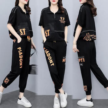 2023 Summer New Fashion Sports Leisure Suit Korean Style Loose Splicing Short Sleeve Tops Pencil Pants 2 Two Piece Set For Women