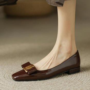 Women Flats Elegantes Dress Shoes Patent Leather Slip on Boat Shoes Square Toe Office Ladies Shoes Bowtie zapatillas Mujer 9919N