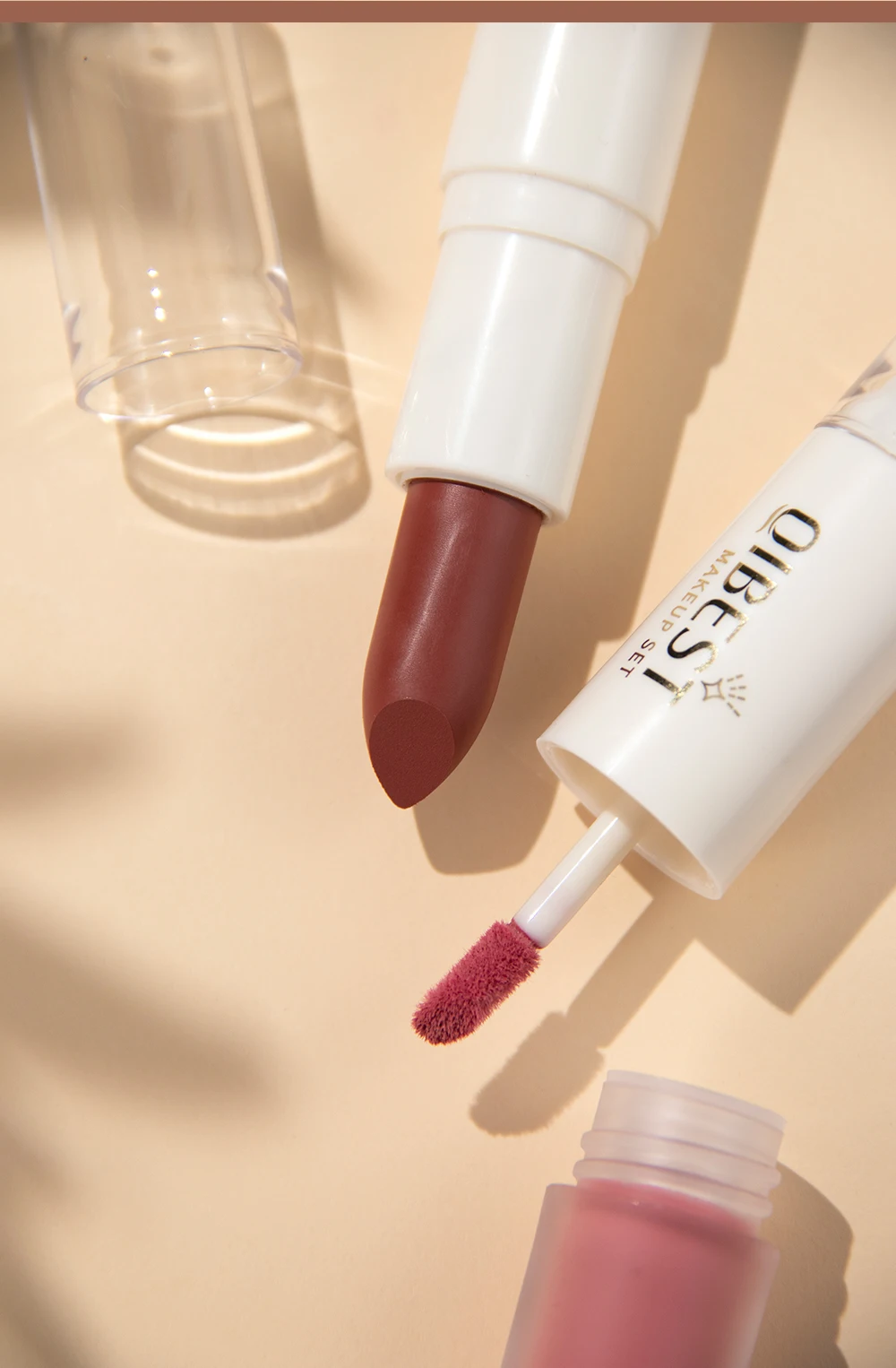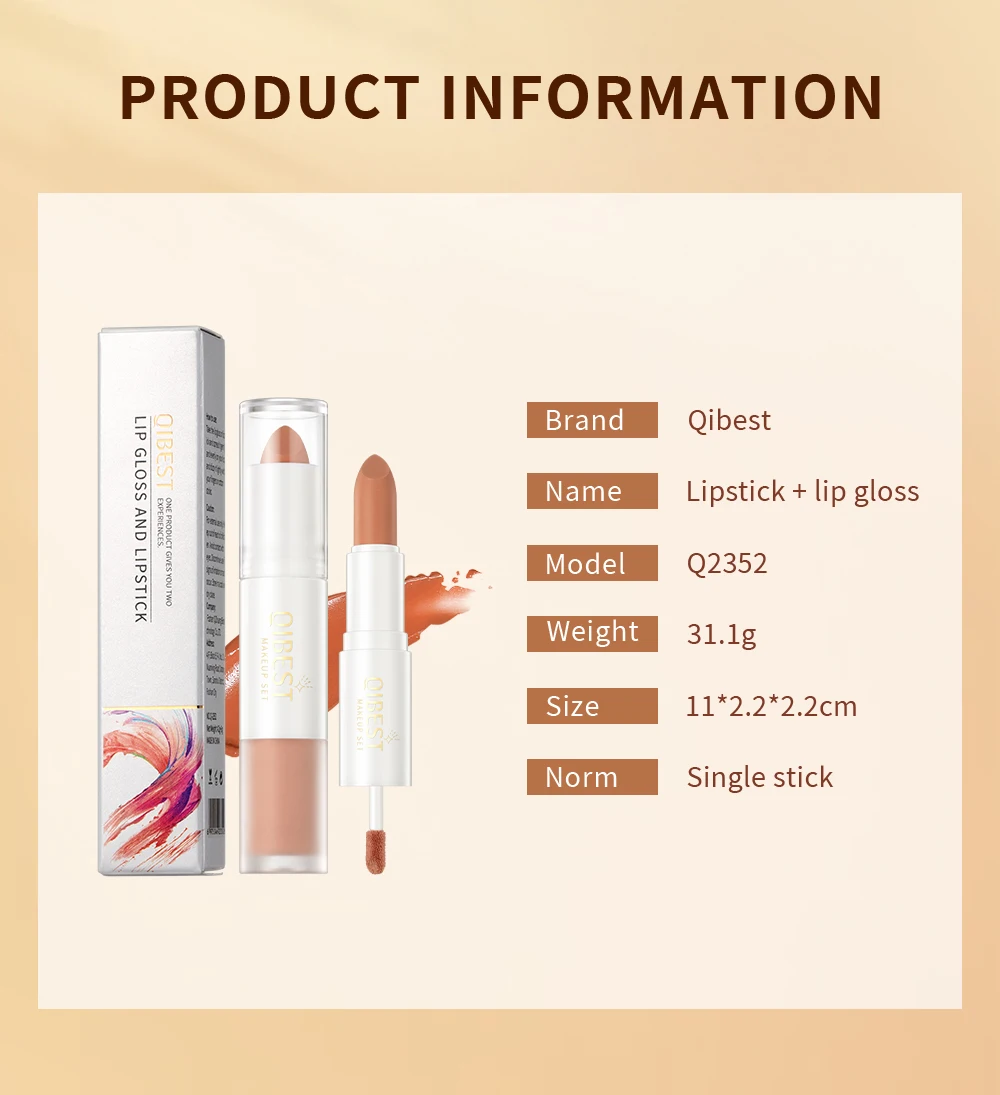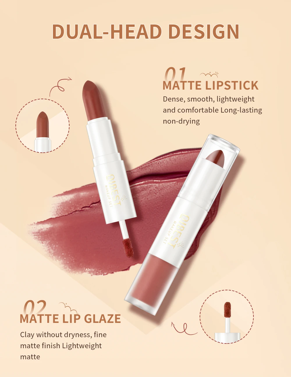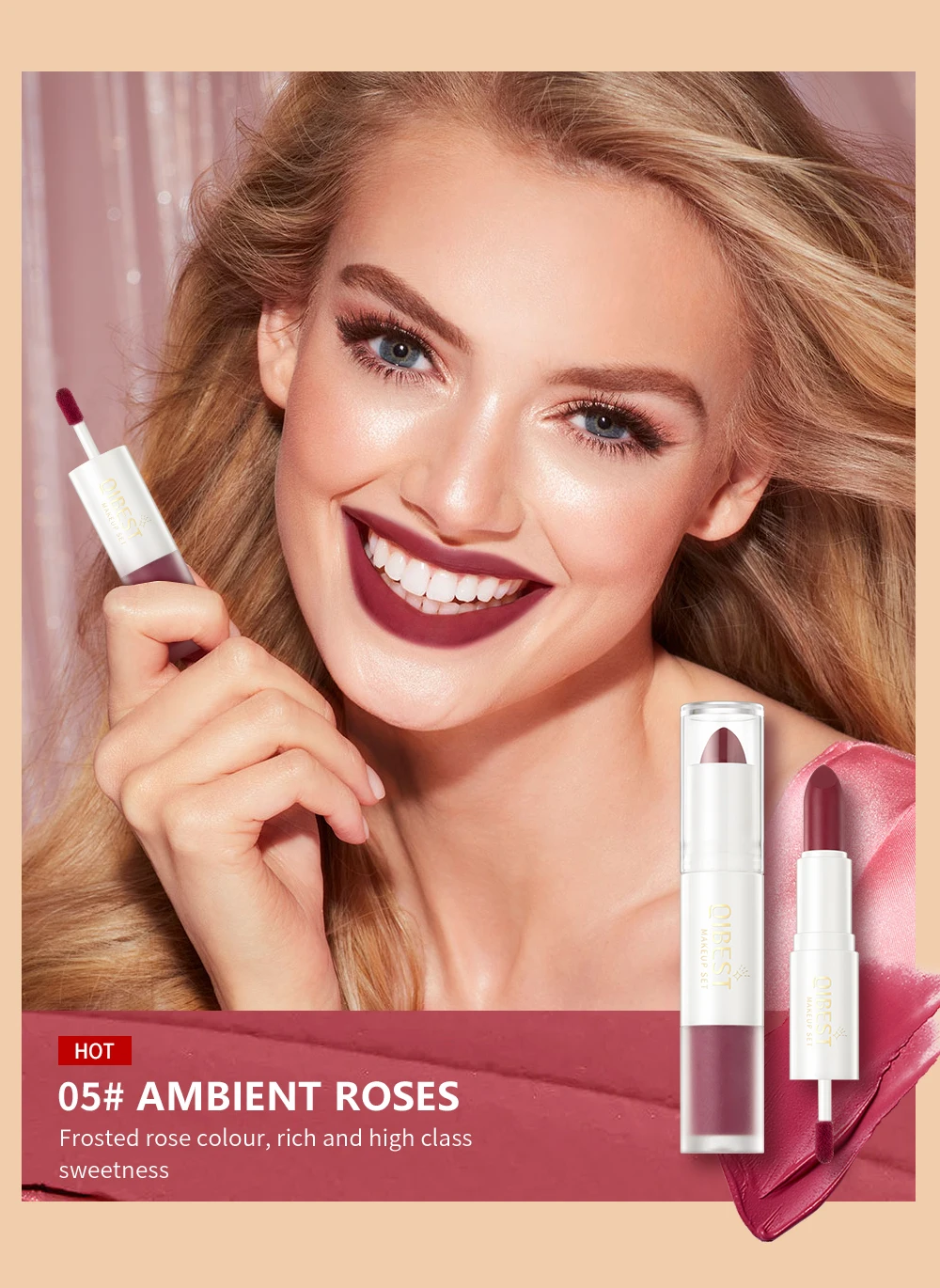 QIBEST 2 In 1 Matte Velvet Liquid Lipstick Lip Gloss Stick Moisturizing Long Lasting Lip Glaze Makeup Tint Plumper Cosmetics