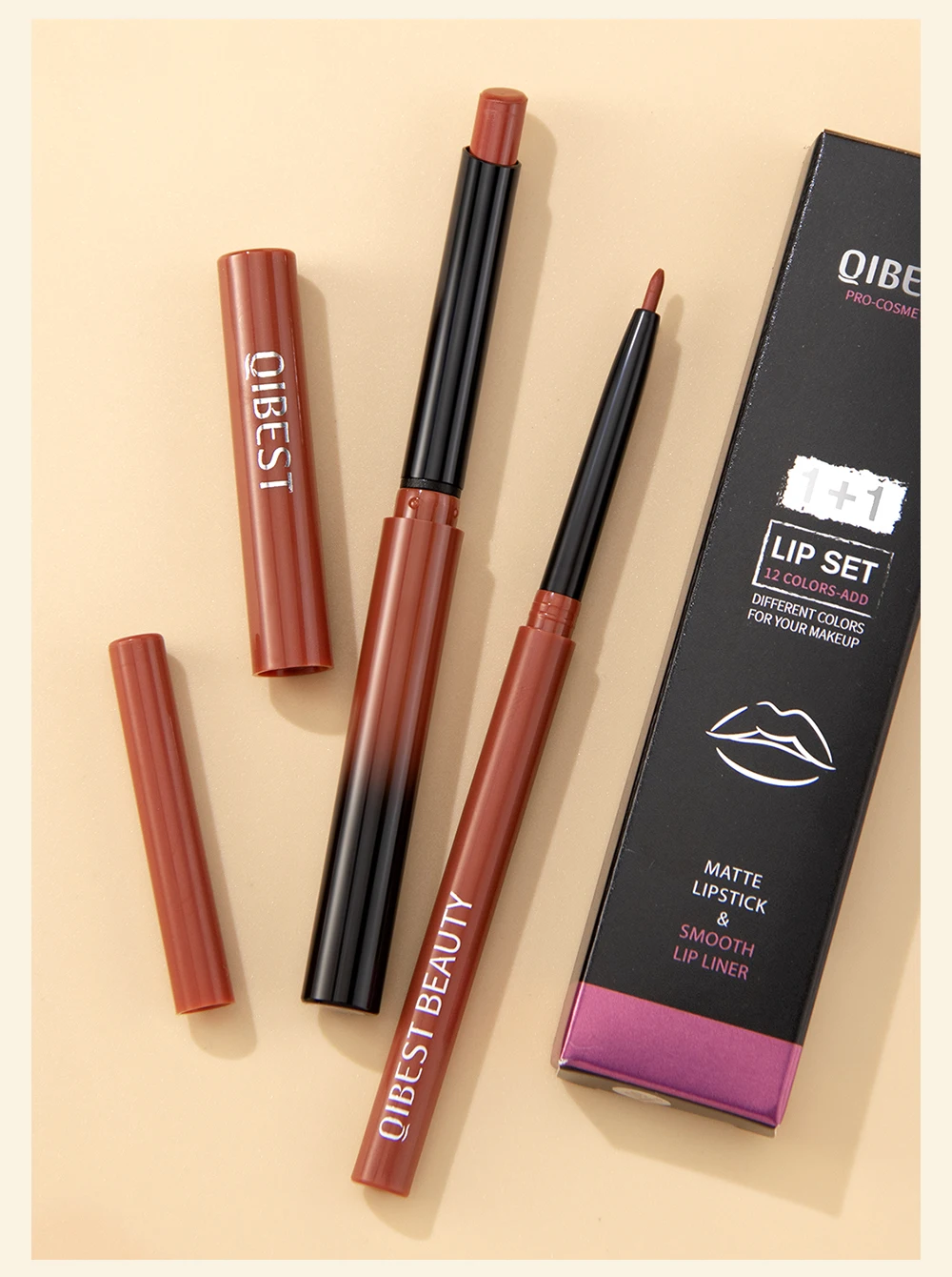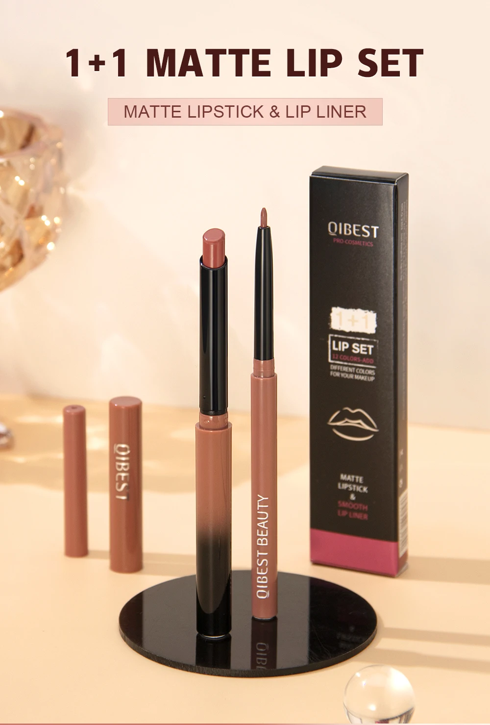 QIBEST 2pcs Lipstick Lipliner Pen Set Matte Velvet Lip Liner Pencil Contour Makeup Sexy Red Lip Stick Long Lasting Cosmetics
