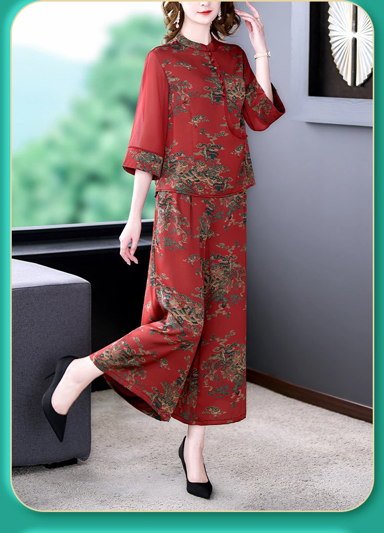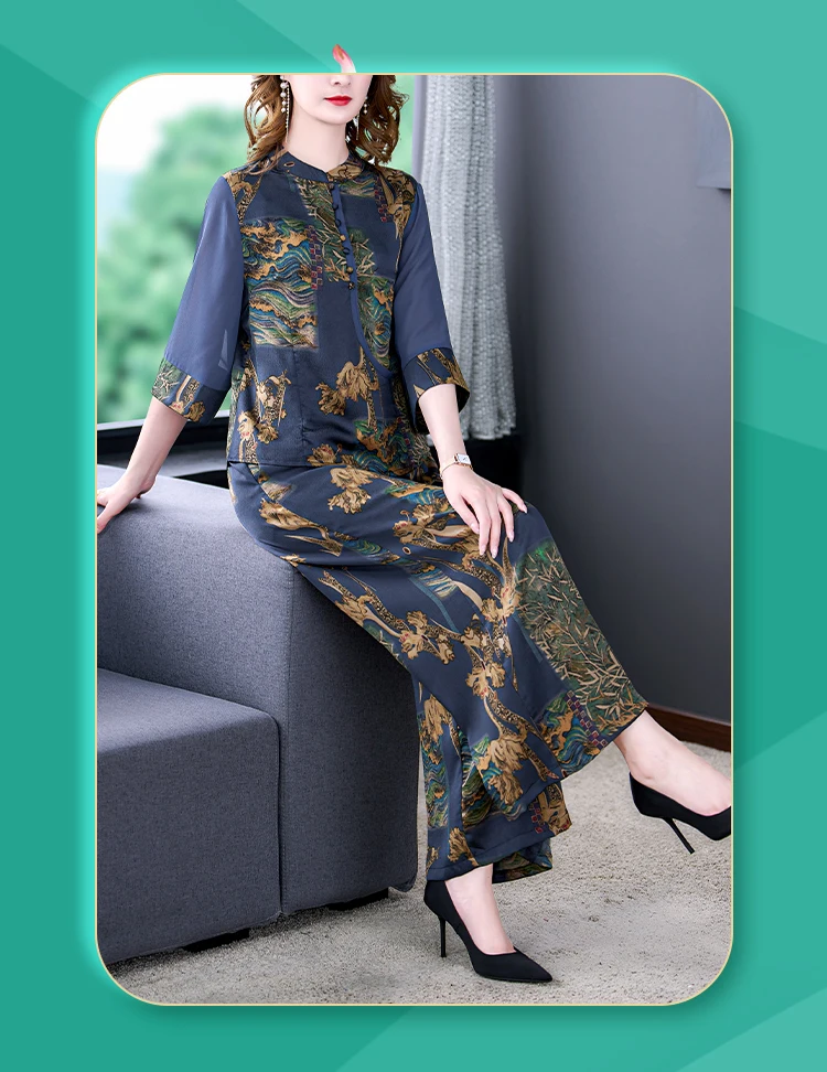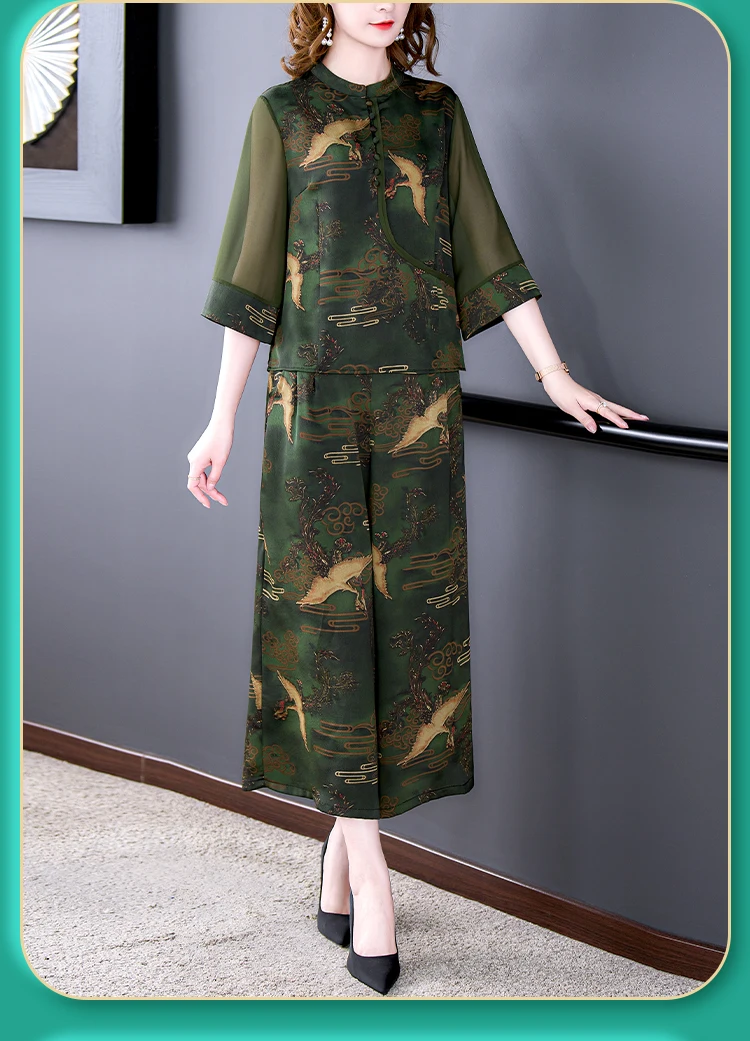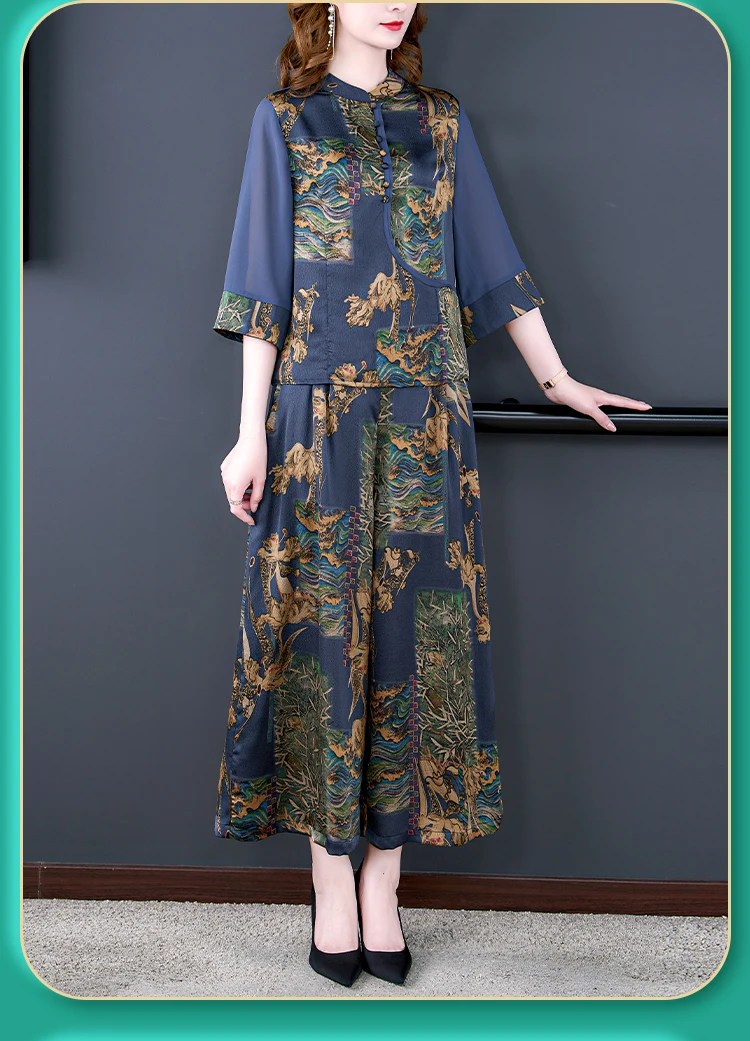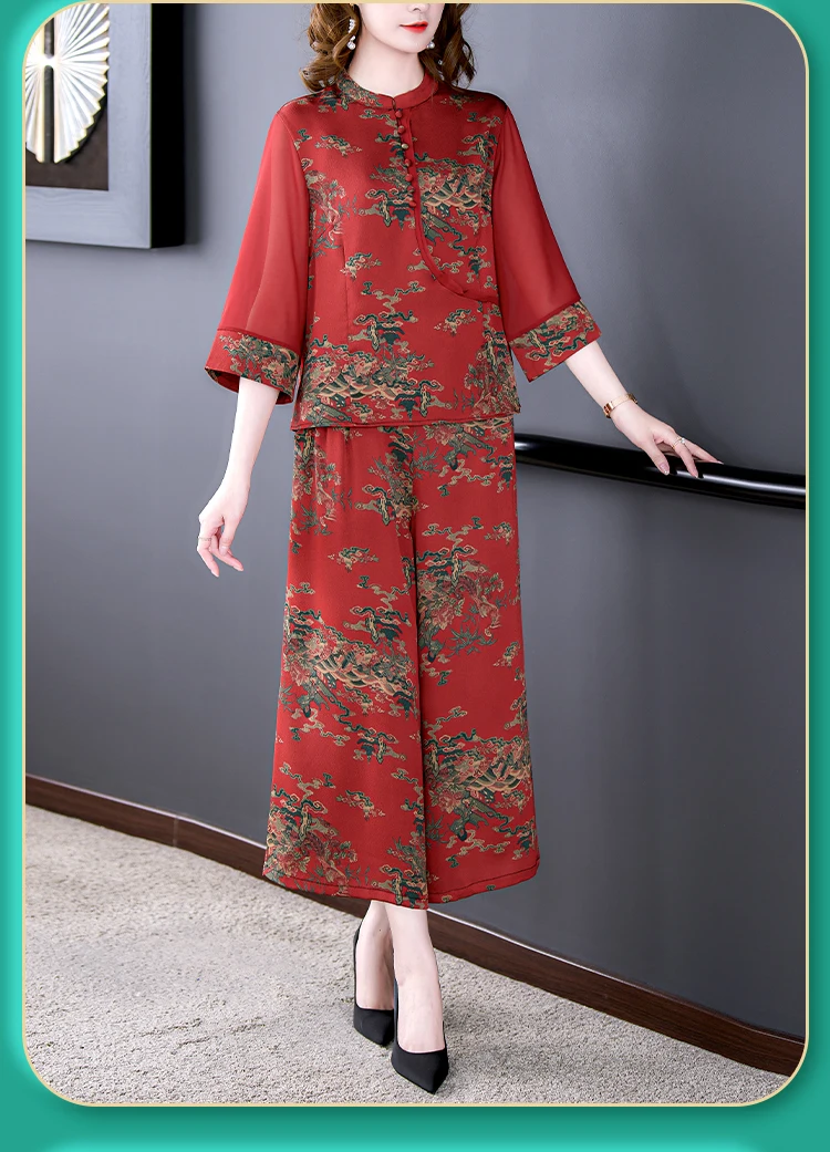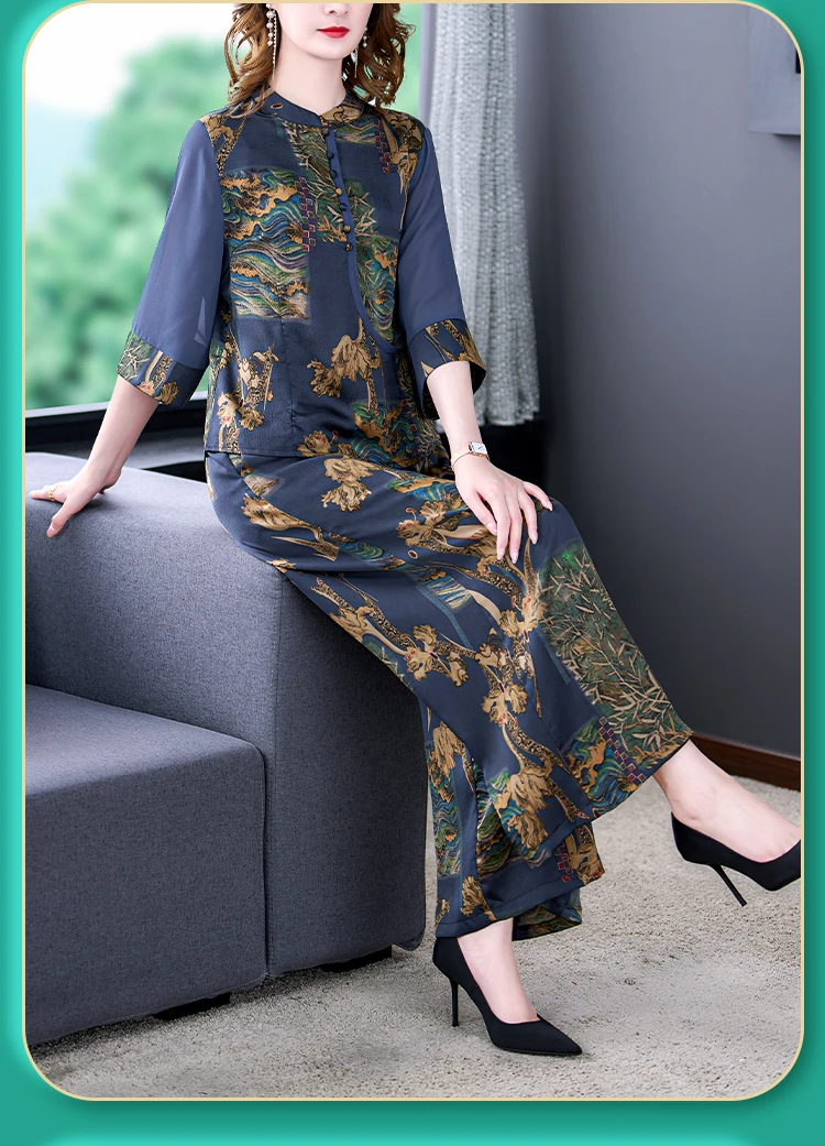 Retro Silk Printing Women Suit Wide Leg Pants Spring And Summer New Loose Short Sleeve Fashion Two Piece Set
