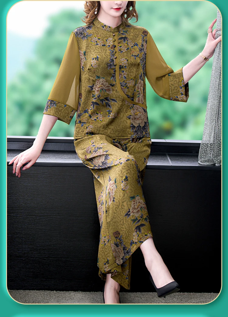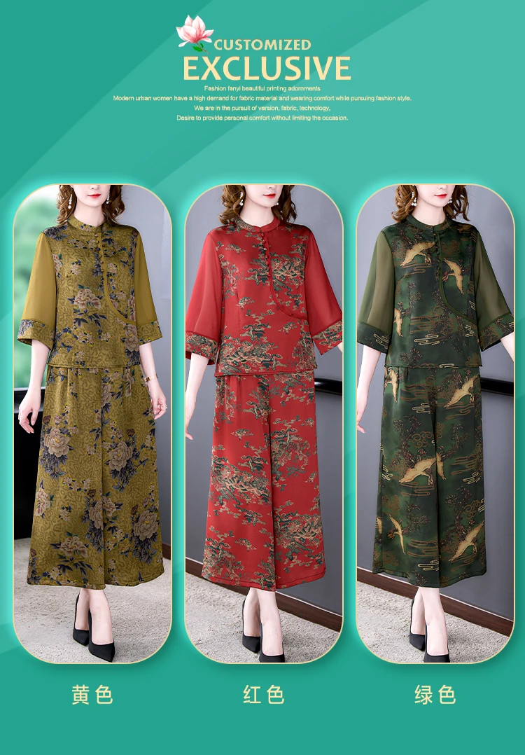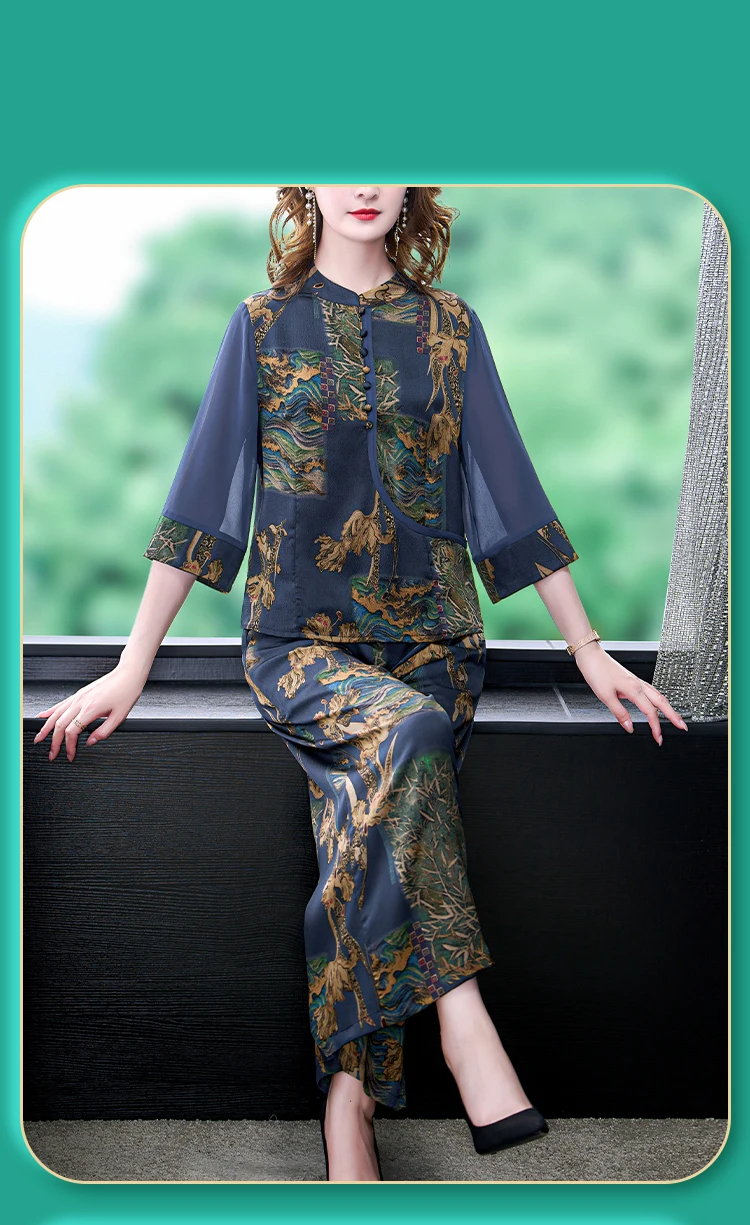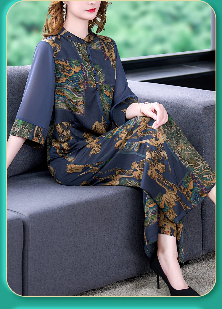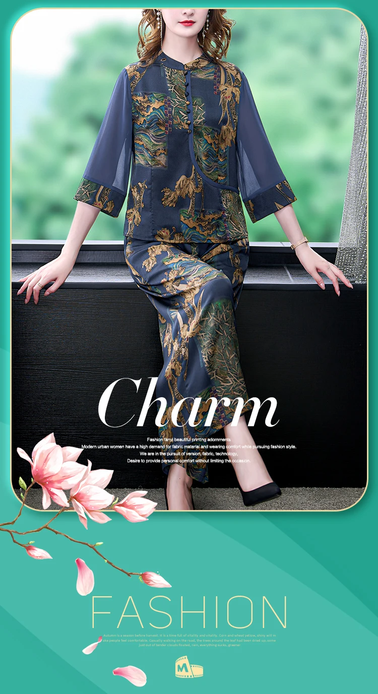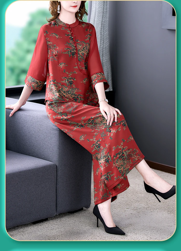 Retro Silk Printing Women Suit Wide Leg Pants Spring And Summer New Loose Short Sleeve Fashion Two Piece Set