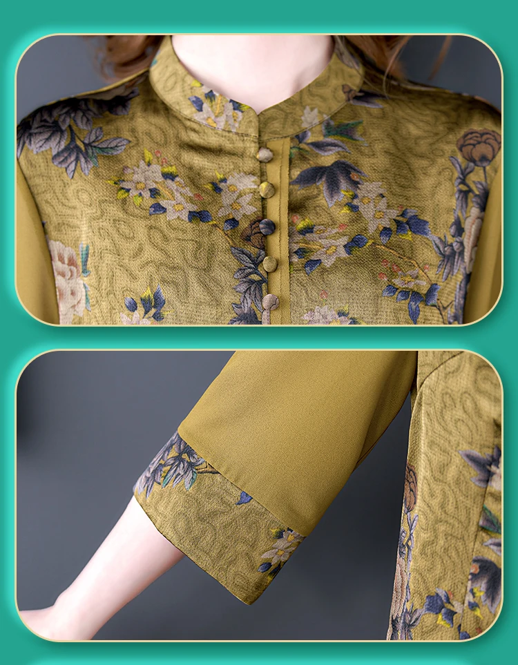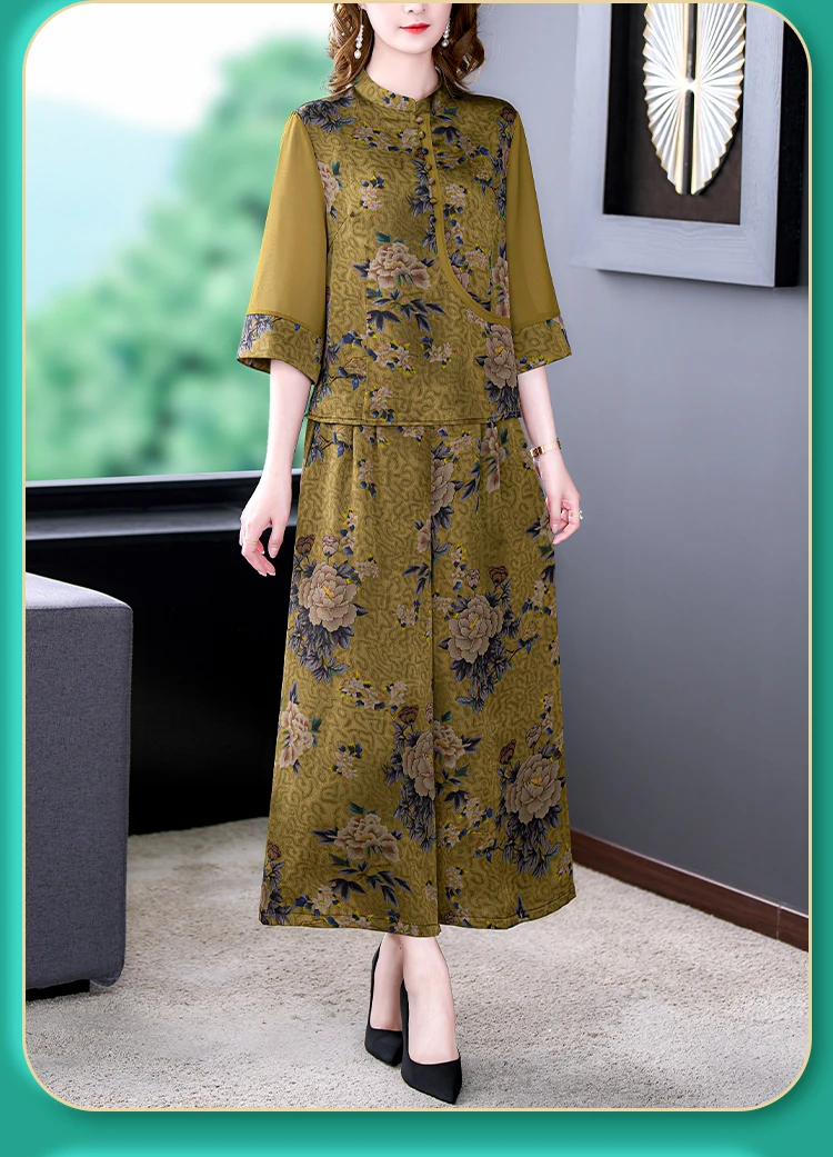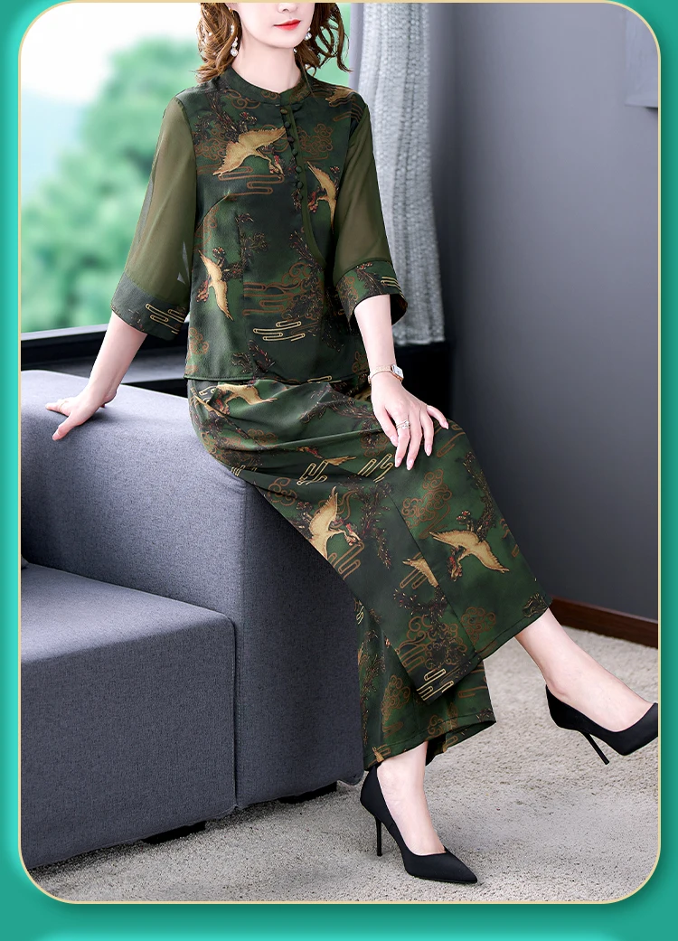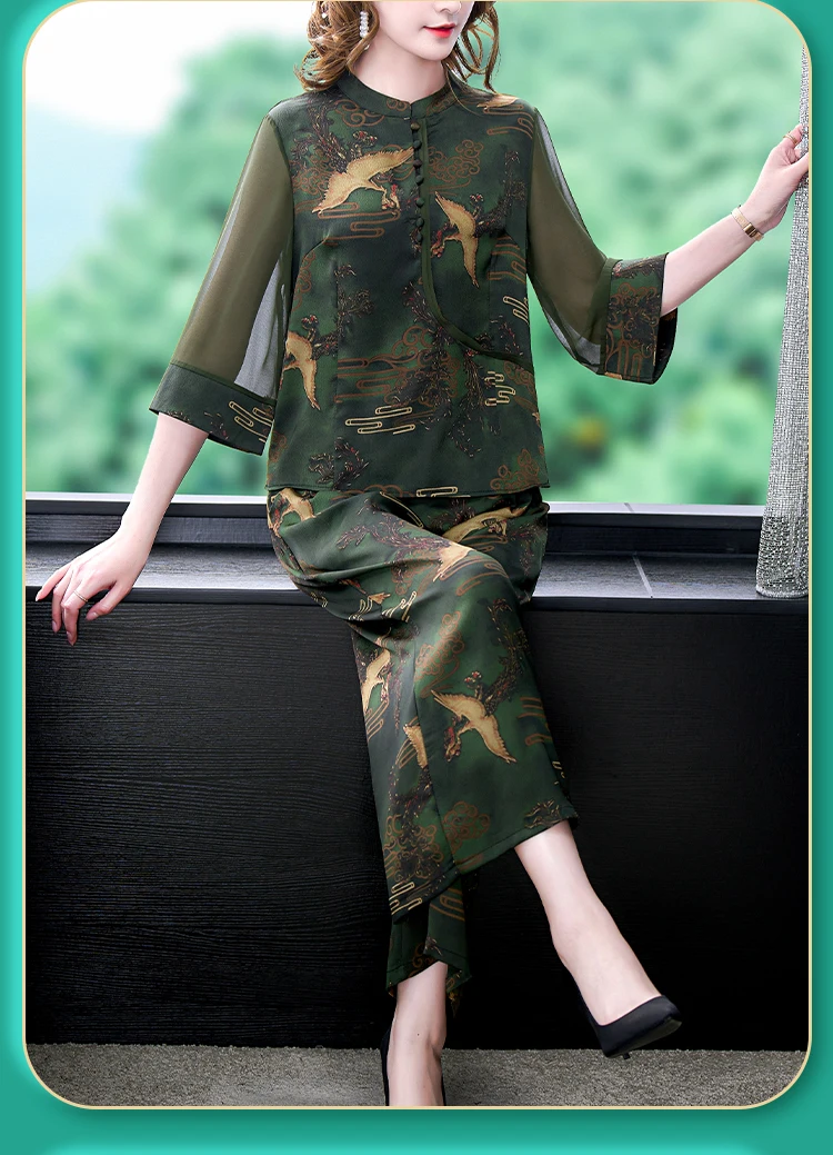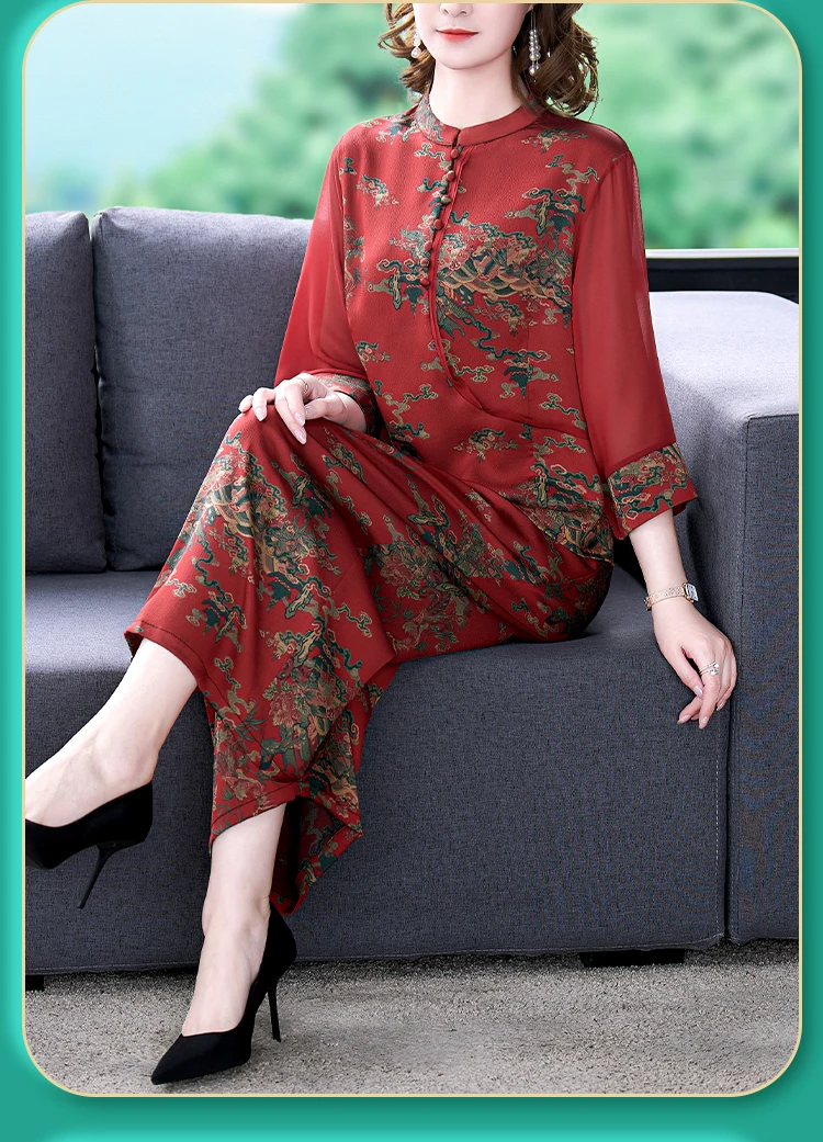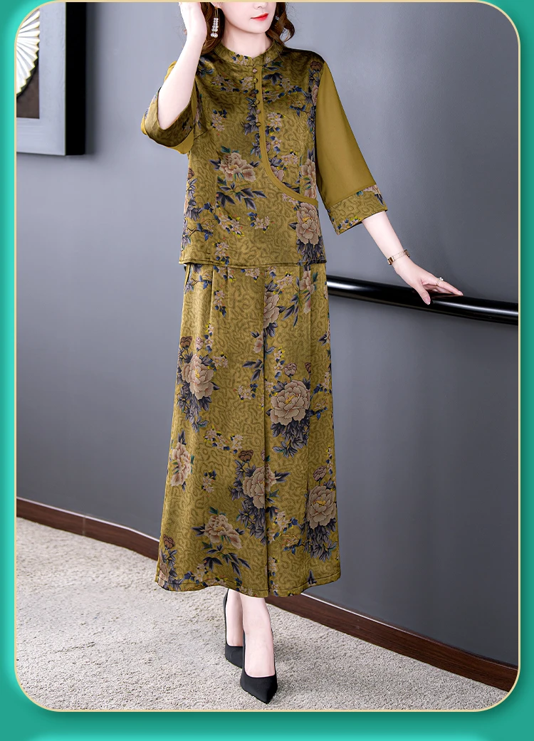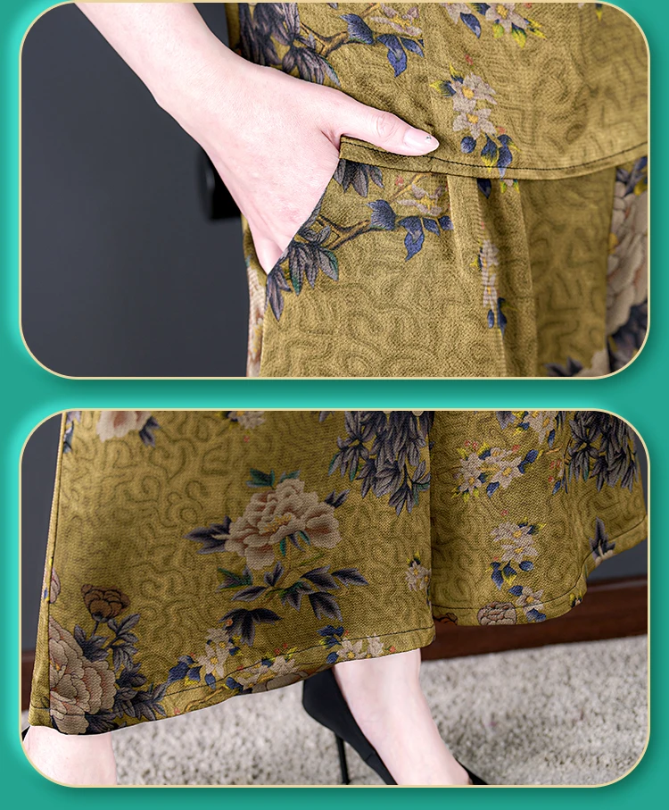 Retro Silk Printing Women Suit Wide Leg Pants Spring And Summer New Loose Short Sleeve Fashion Two Piece Set