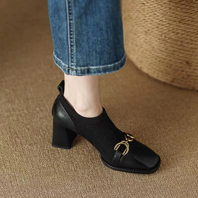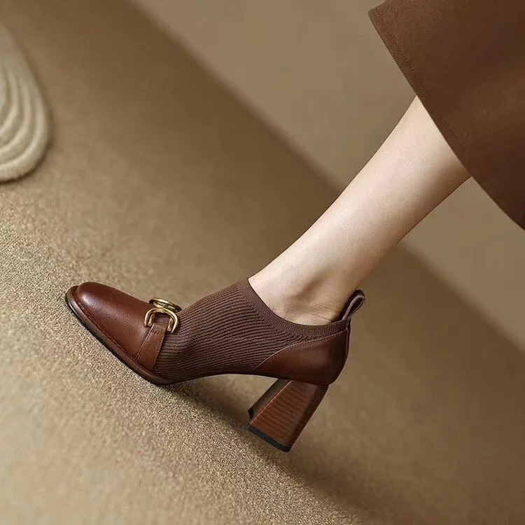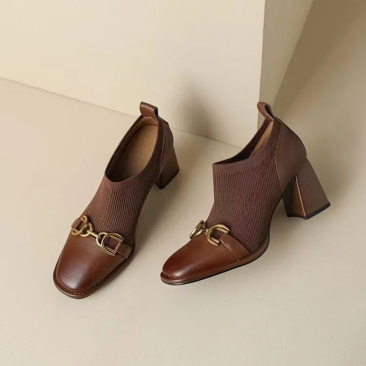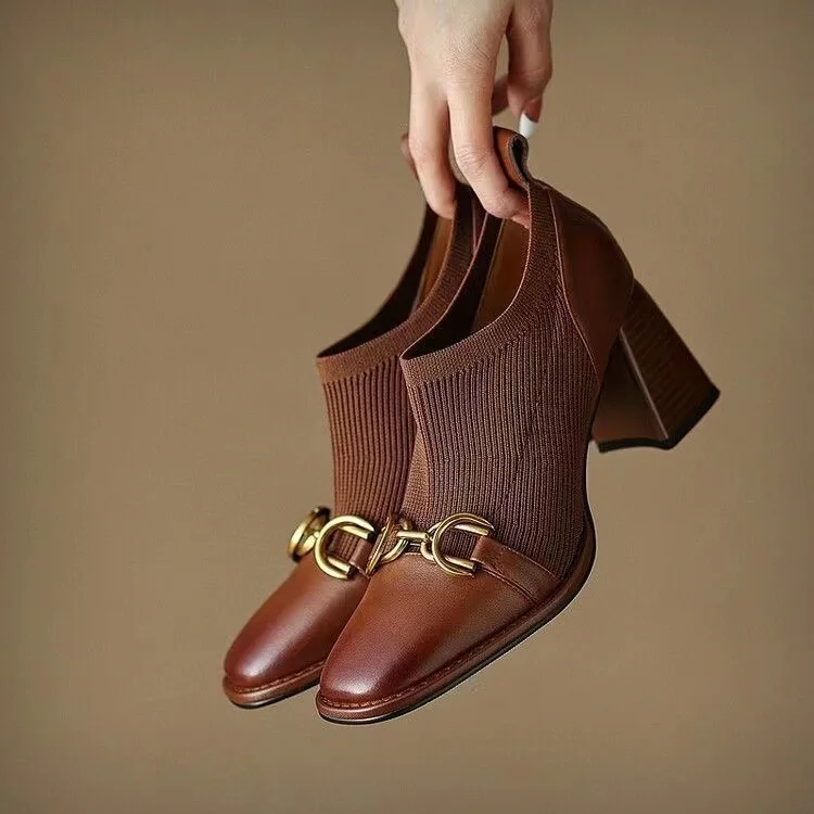 Round Toe Retro Thick Heel Short Boots Women British Style 2024 New Knitted Elastic Socks Ankle Boots Female Black Short Boots