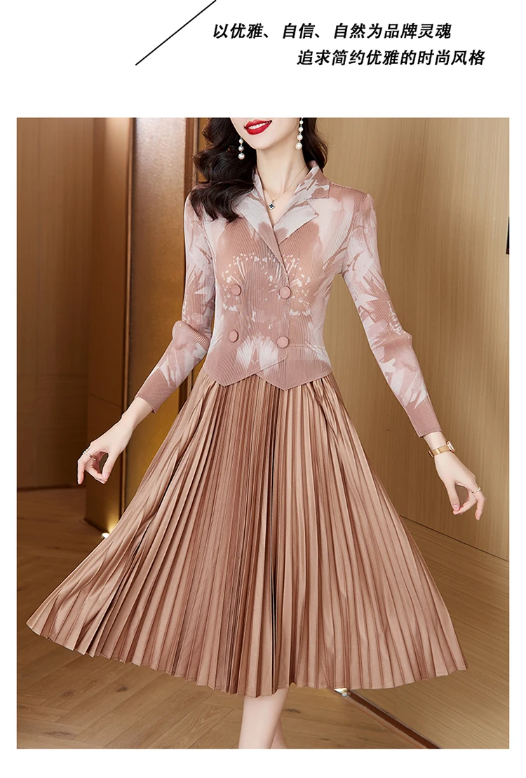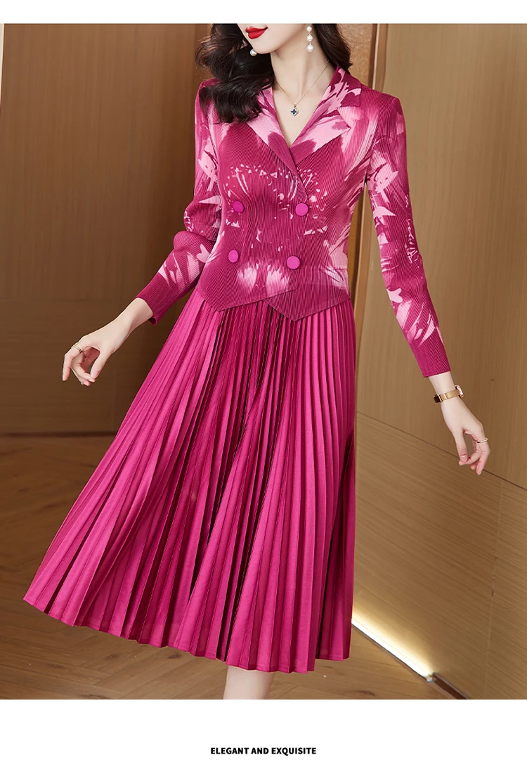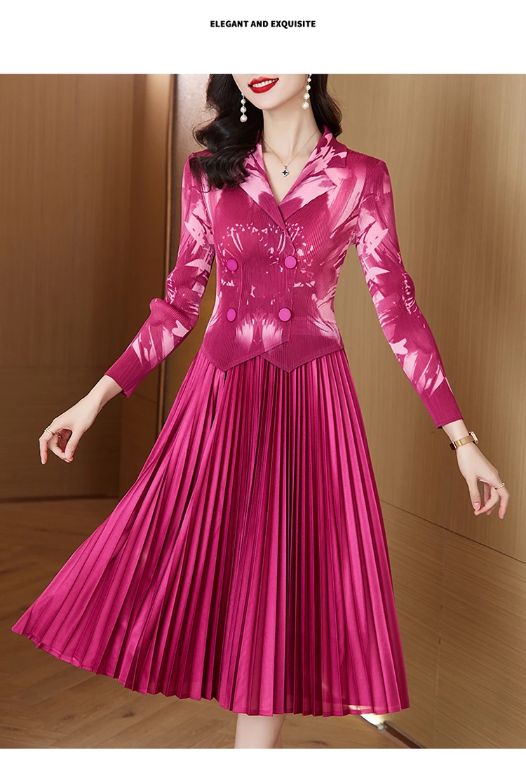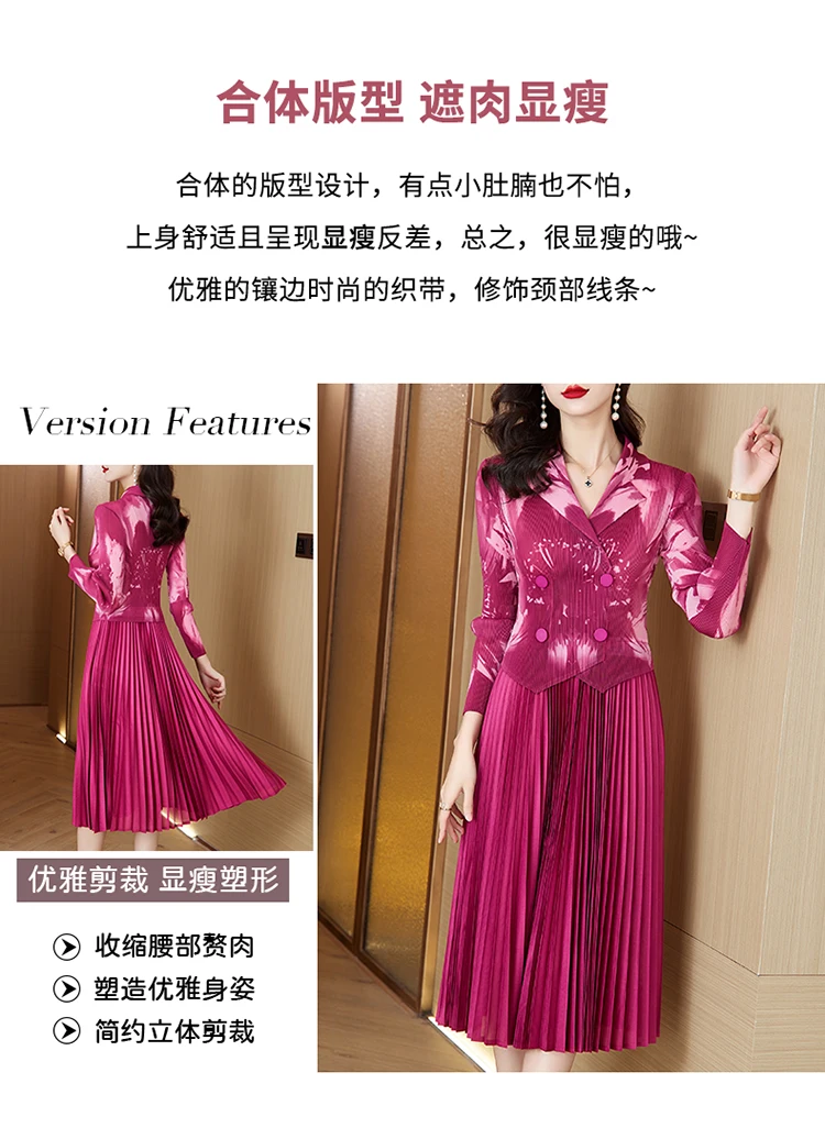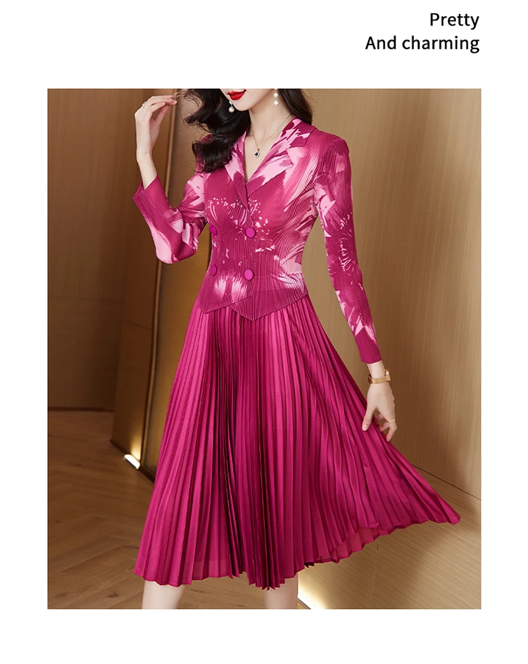 Sanzhai Pleated Dress 2024 Spring/Summer New French Style Rose Red Printed Suit Pleated Dress Spliced Fake Two Piece Dress