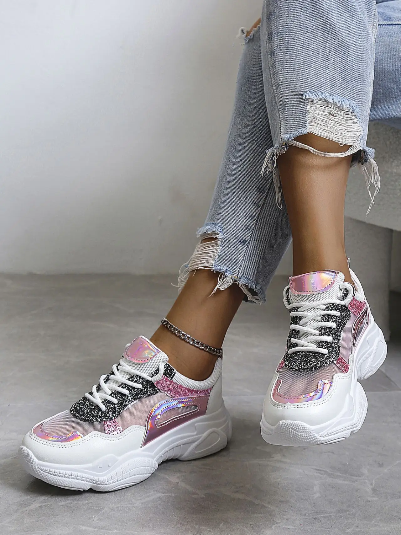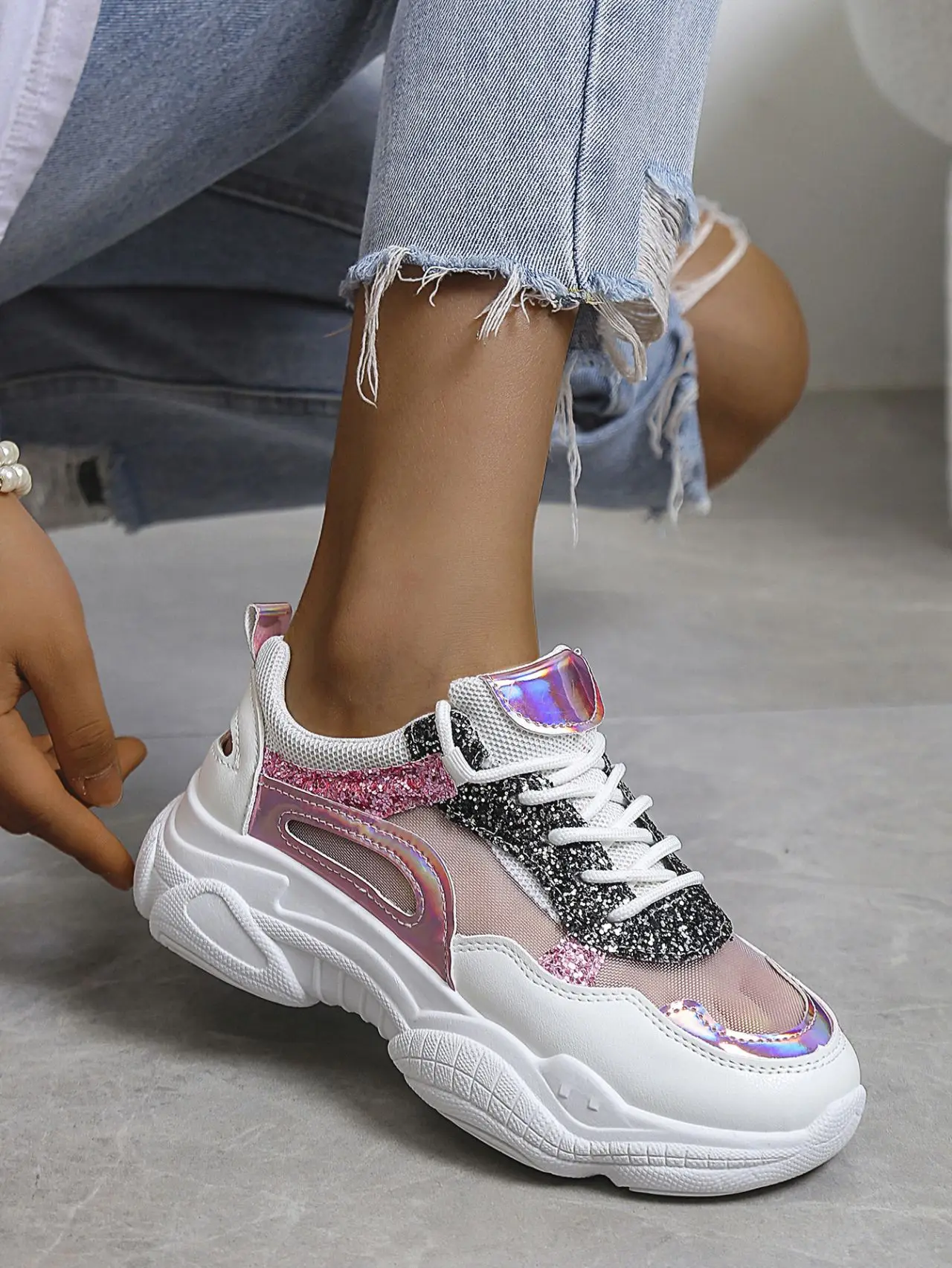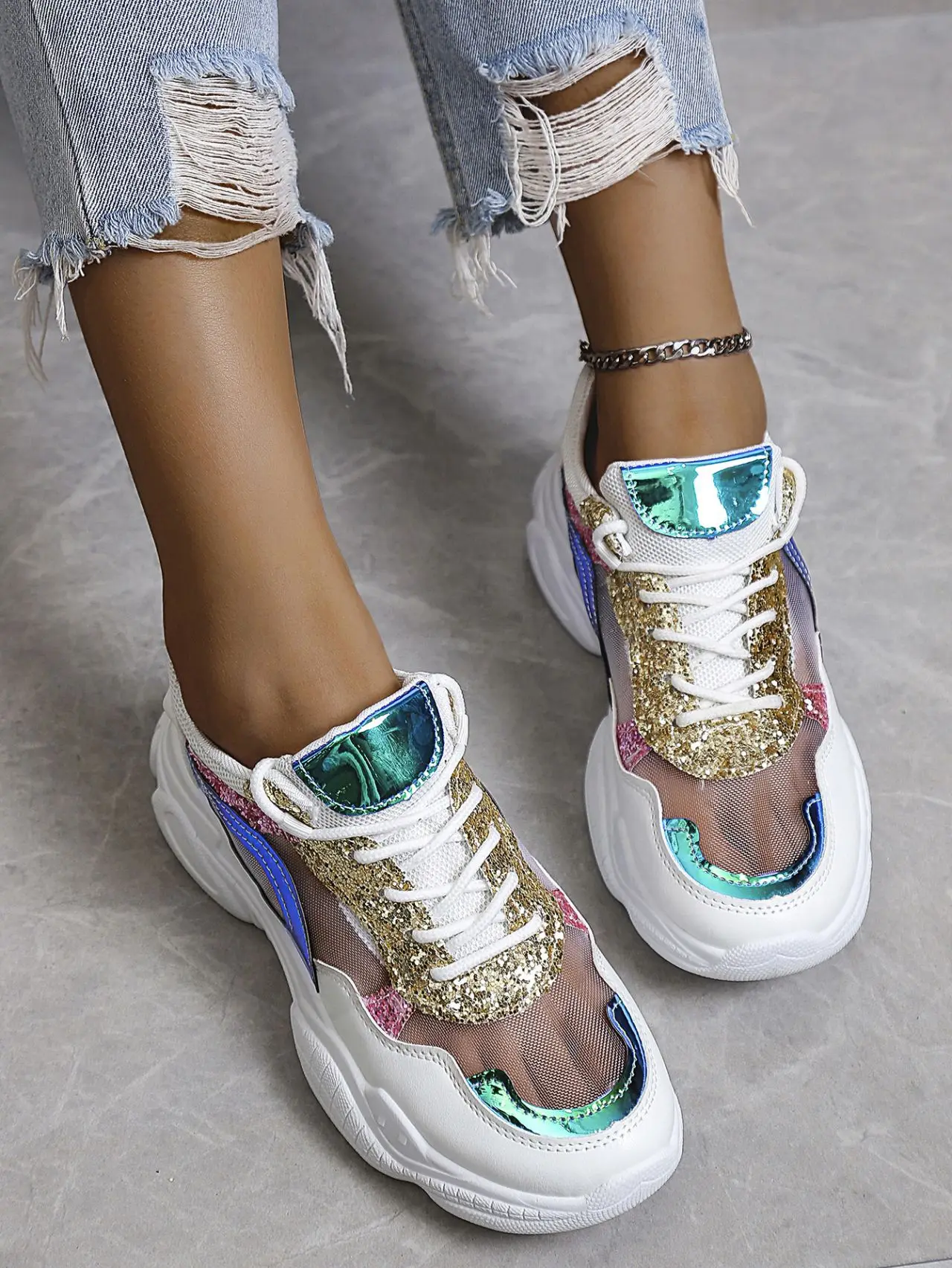 Sequins Colorblock Sneakers Summer Women's Breathable Mesh Running Shoes Large Size Lace Up Trainers Zapatillas Plataforma