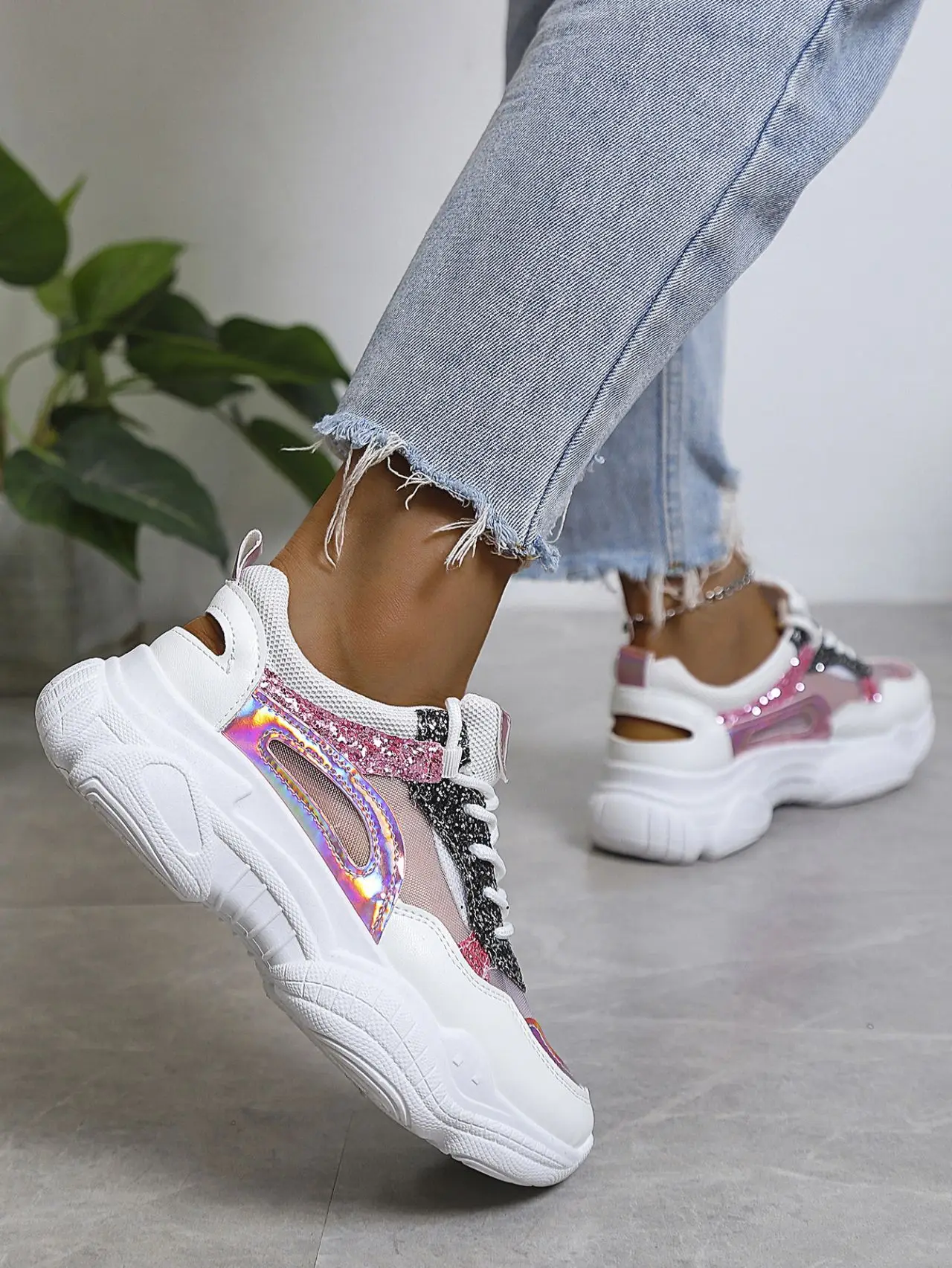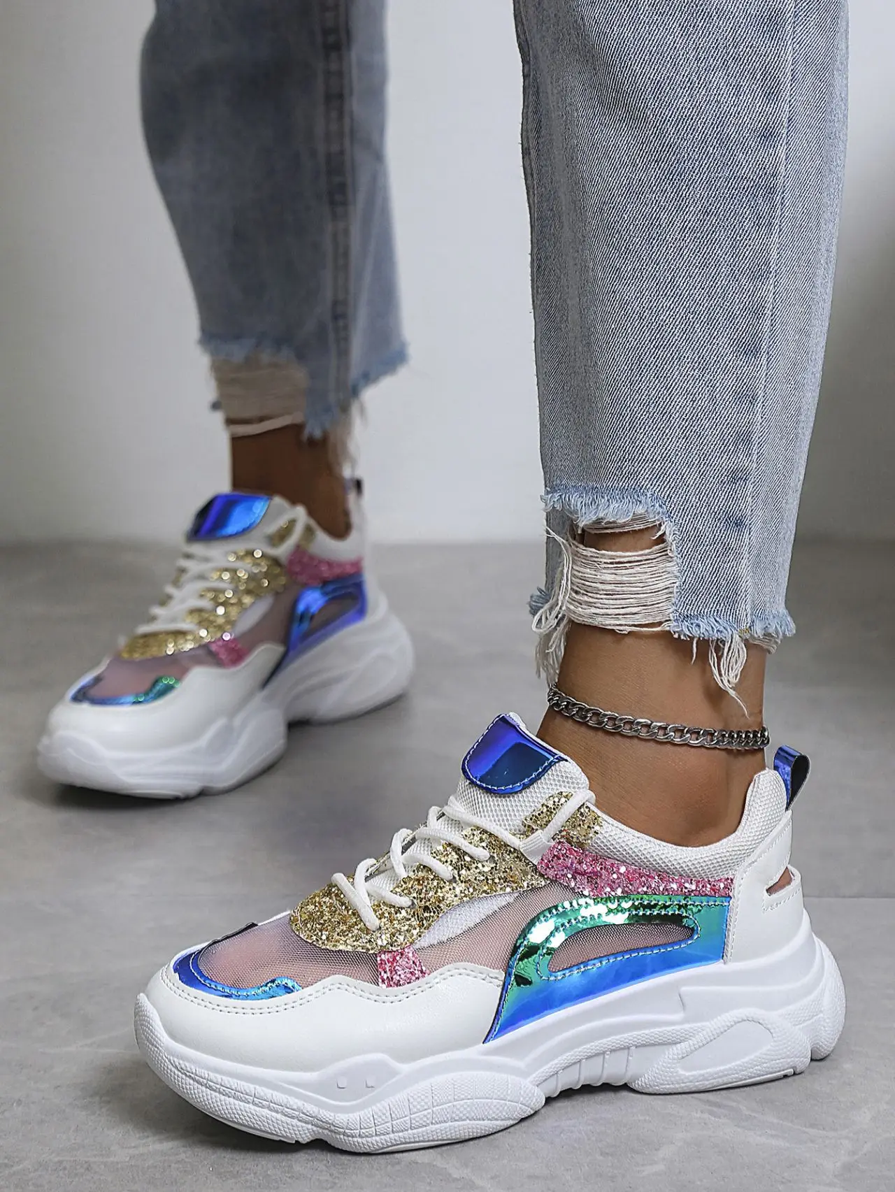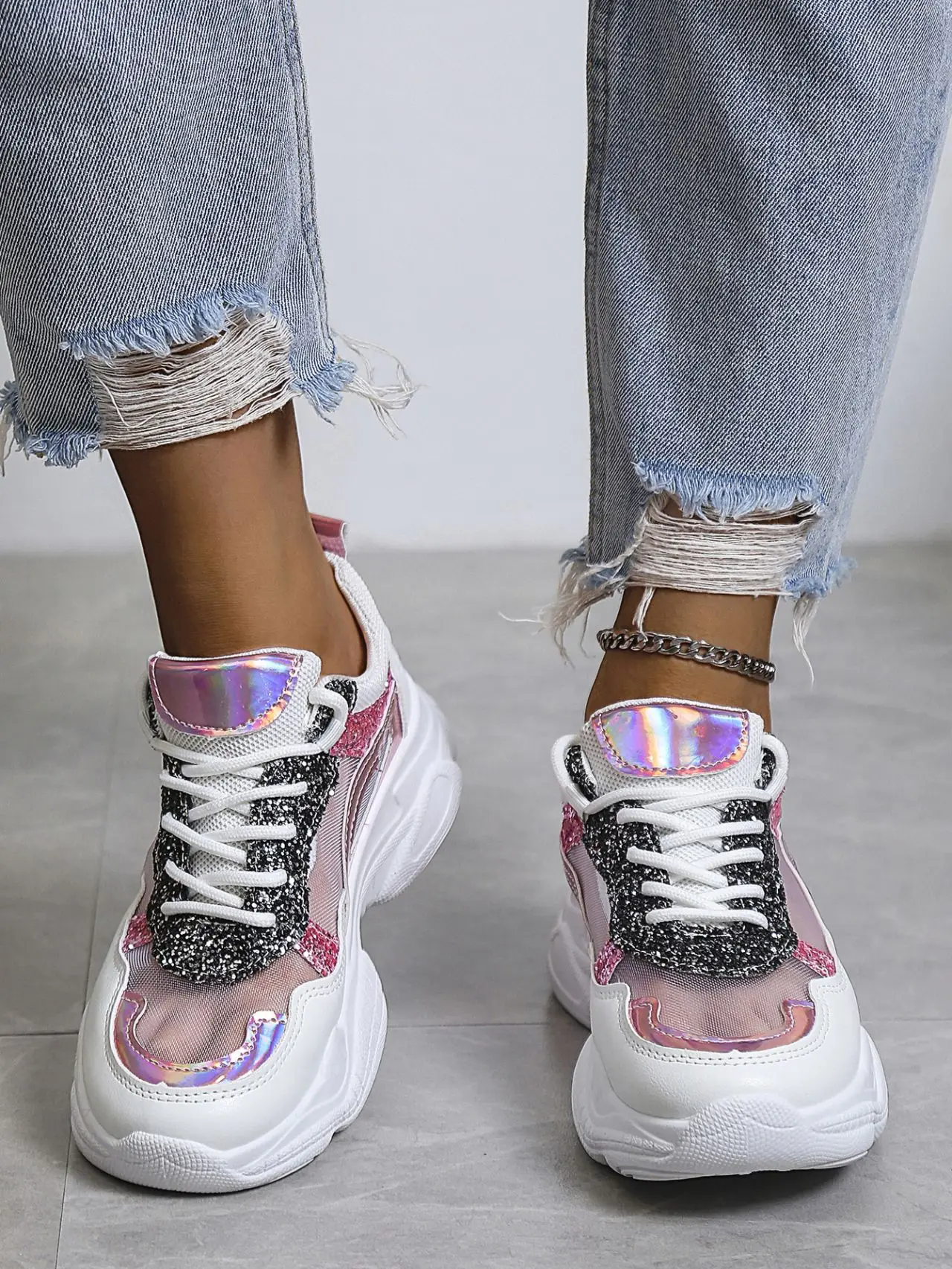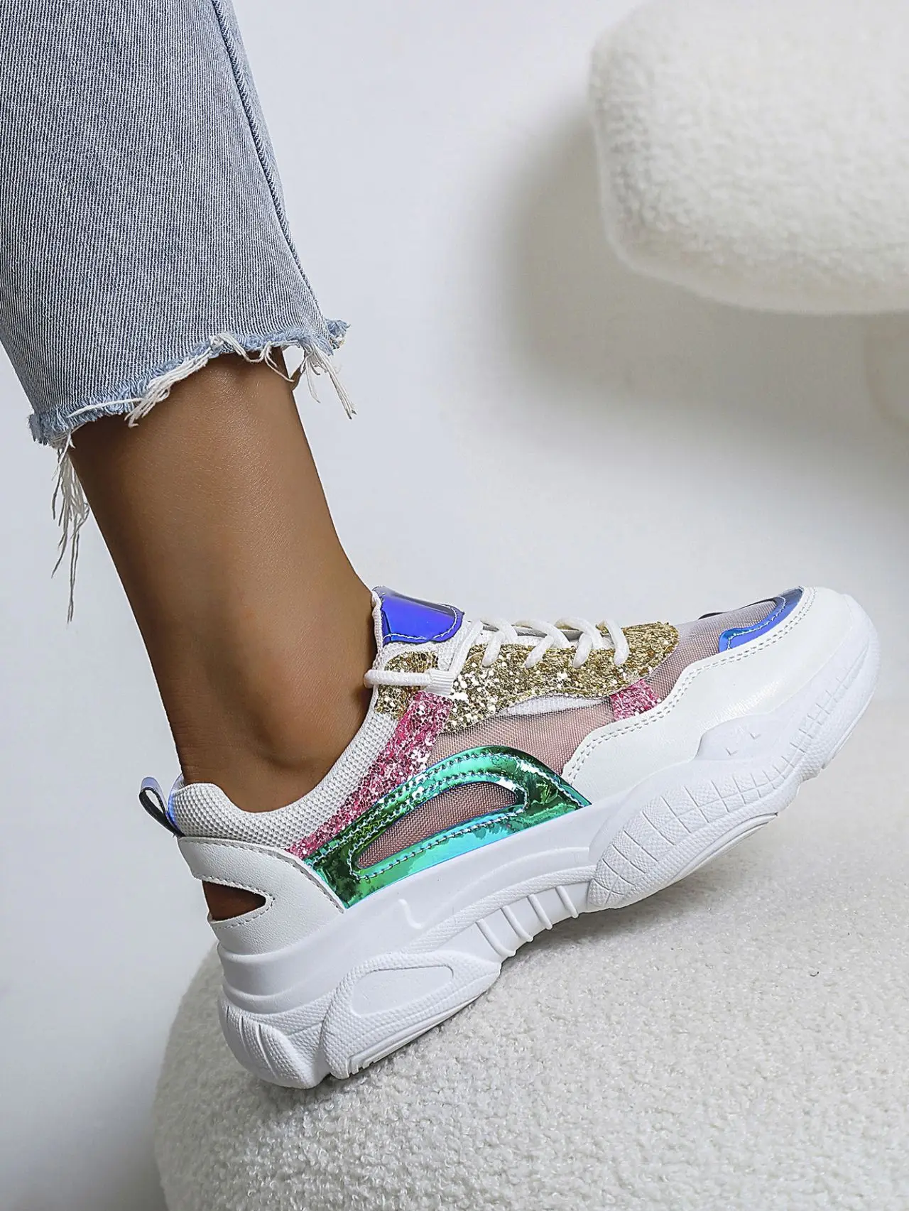Sequins Colorblock Sneakers Summer Women's Breathable Mesh Running Shoes Large Size Lace Up Trainers Zapatillas Plataforma