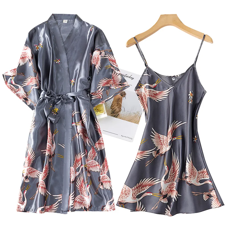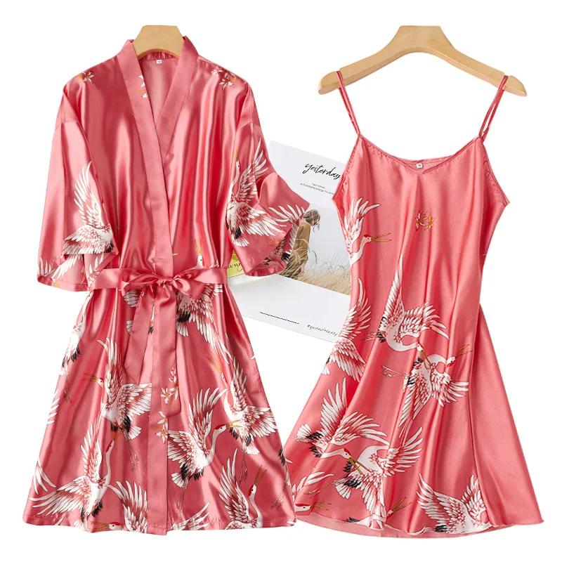 Sexy Nightwear Gown Set Women 2PC Pyjama V-Neck Pajamas Silky Sleepwear Spring Lady Sleep Suit Robe Wear Home Negligee Homewear