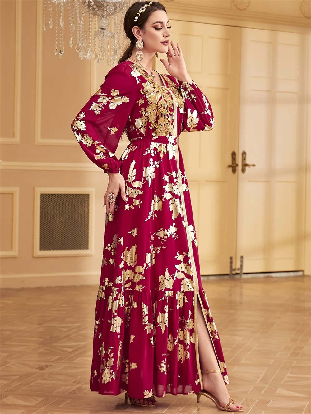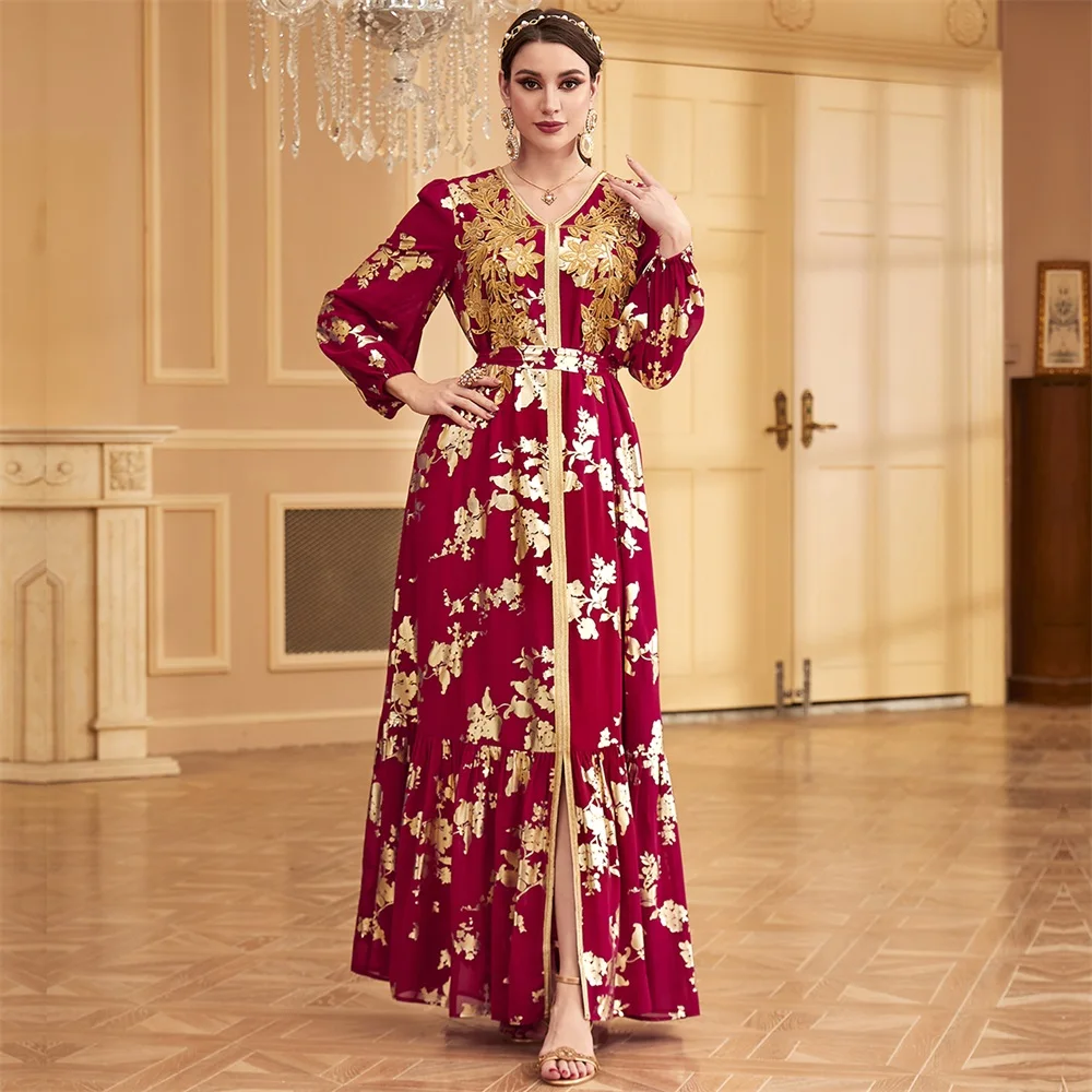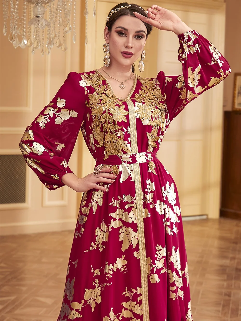 Siskakia Red Evening Party Dubai Elegant Gown For Women Appliques Sequin Belted Dress V-Neck Gold Stamping Abaya Moroccan Kaftan