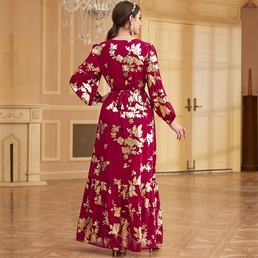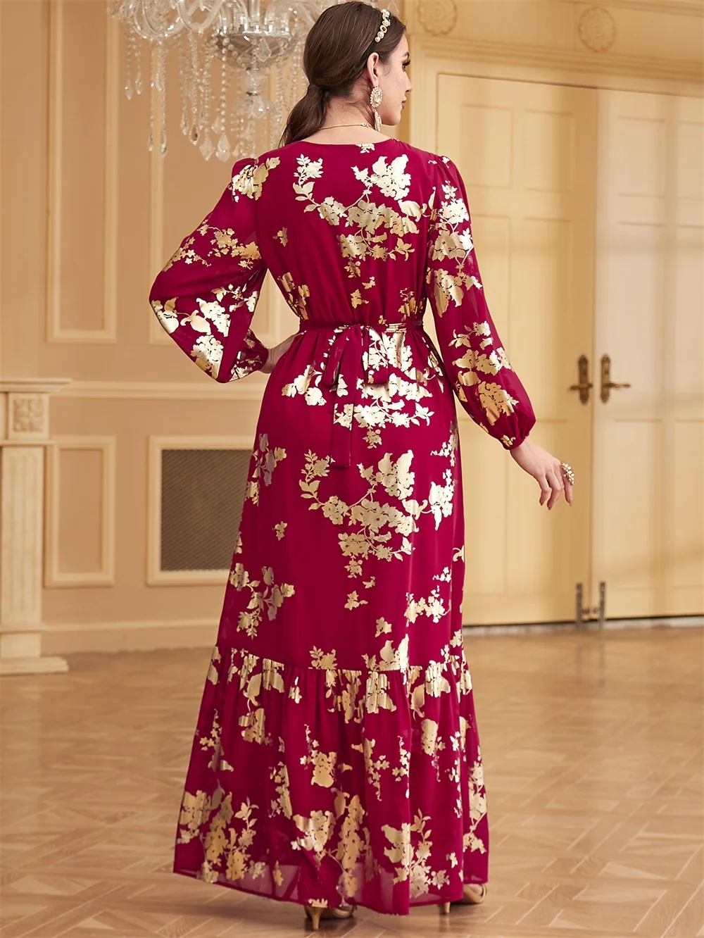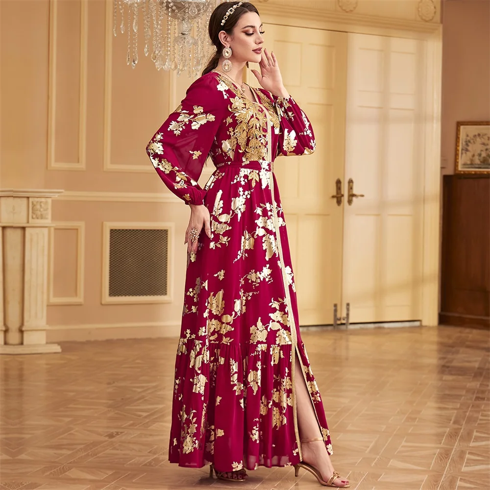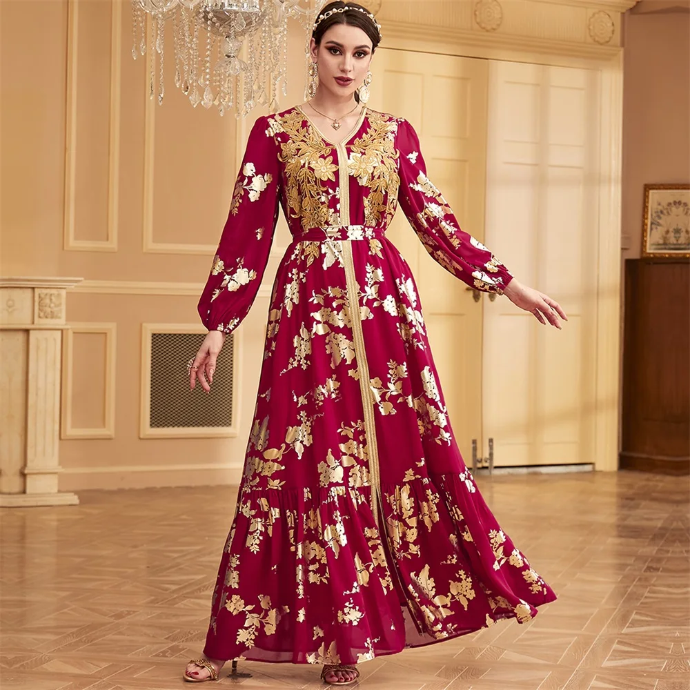 Siskakia Red Evening Party Dubai Elegant Gown For Women Appliques Sequin Belted Dress V-Neck Gold Stamping Abaya Moroccan Kaftan