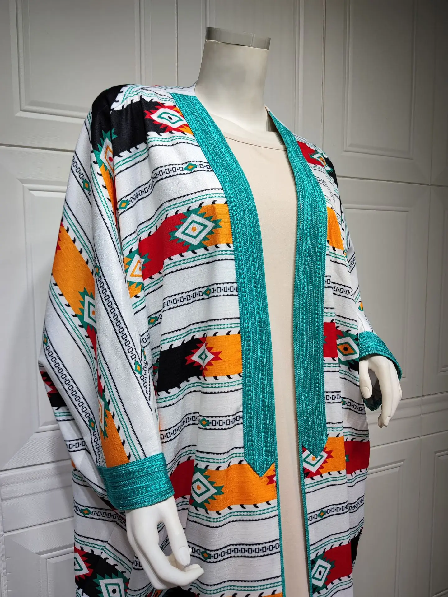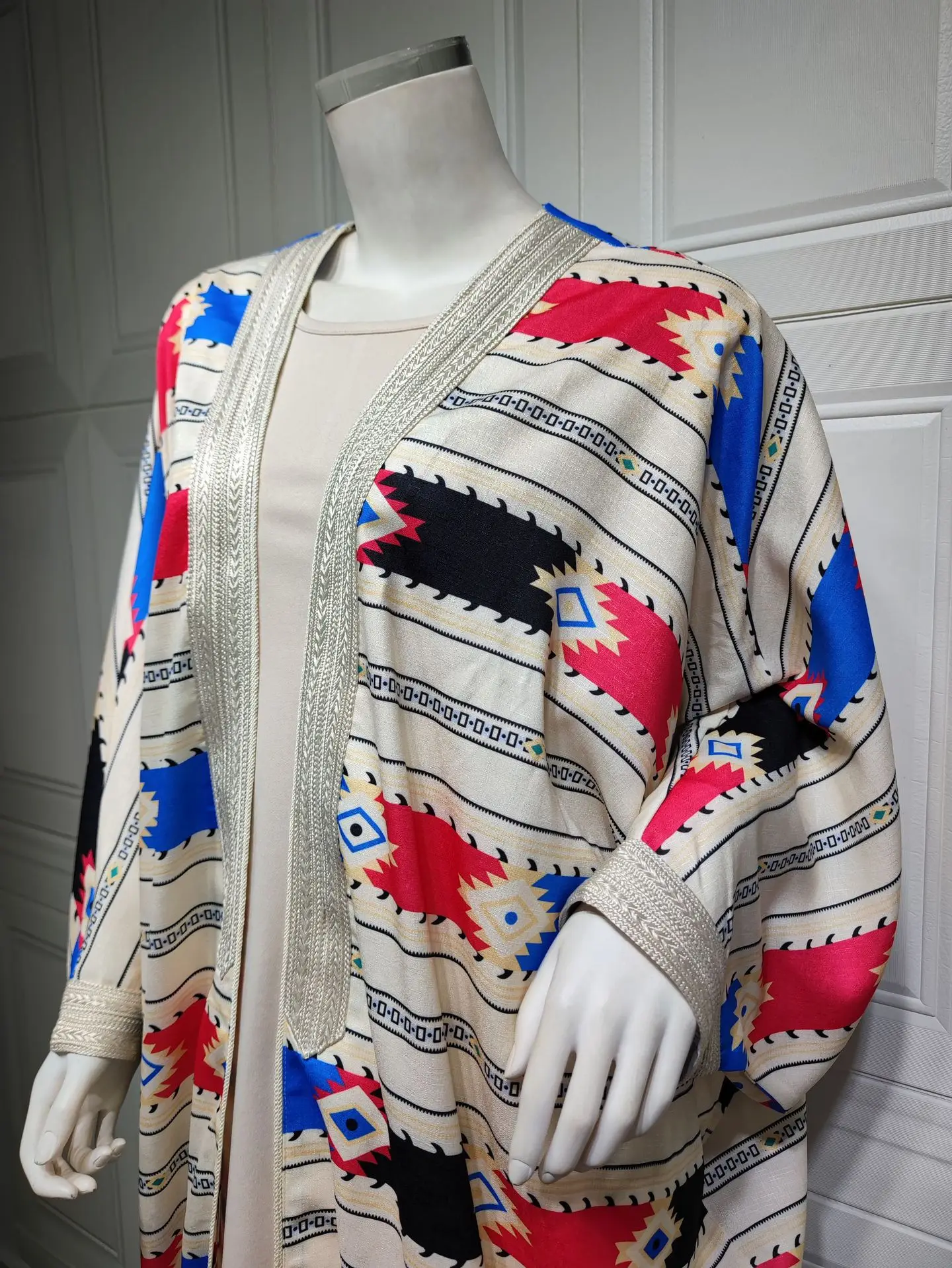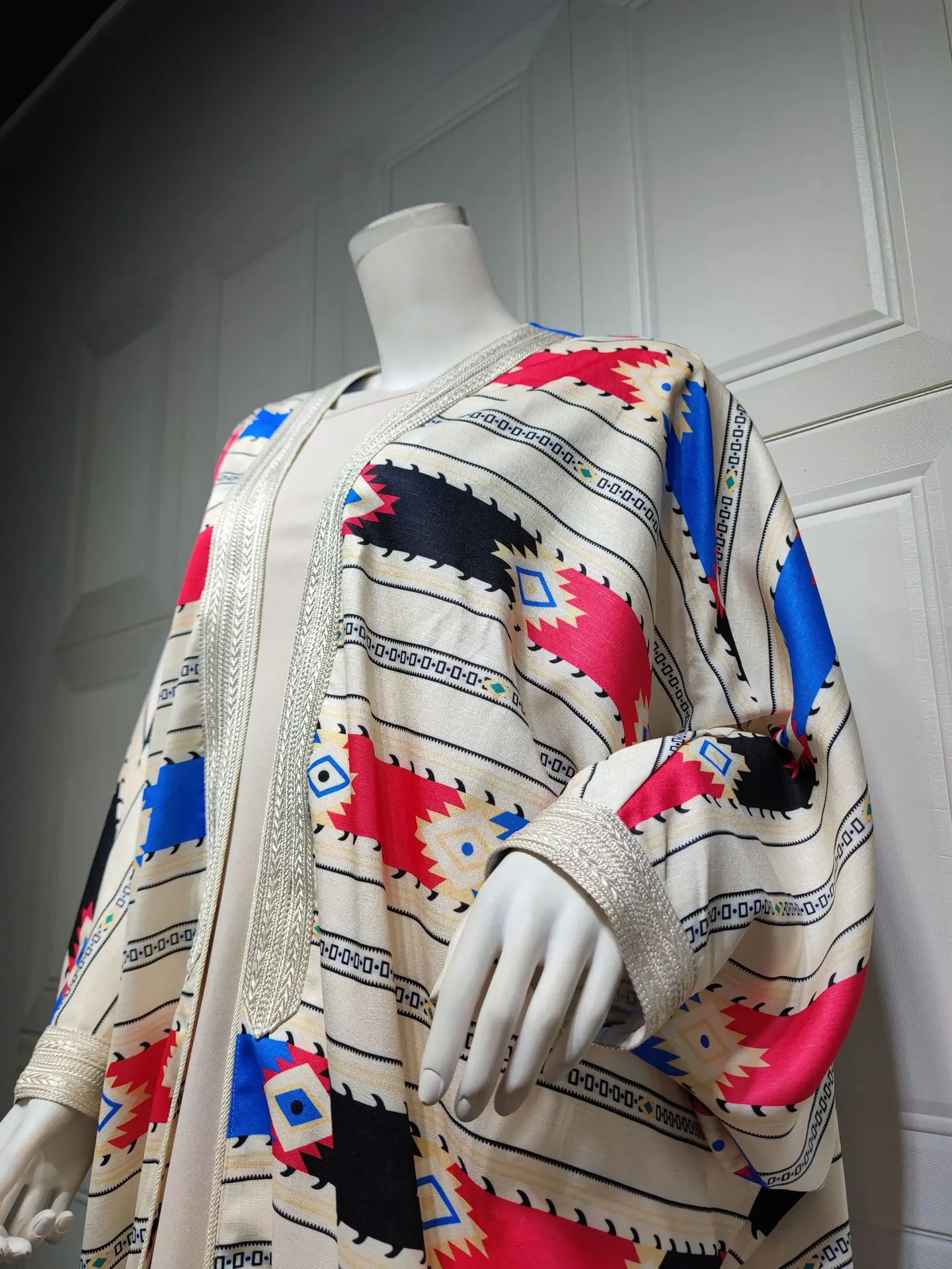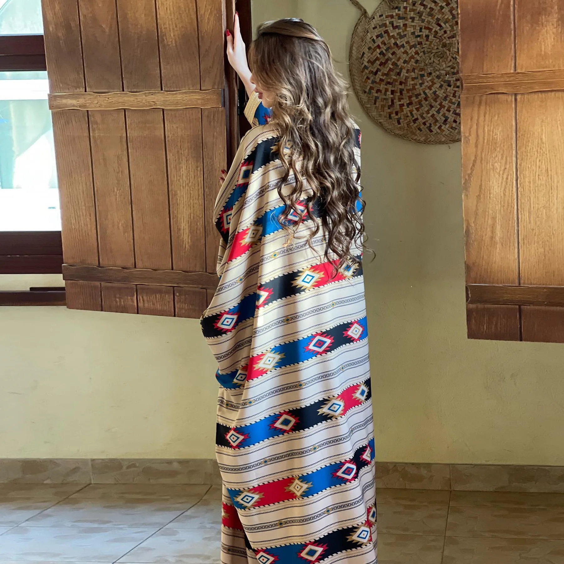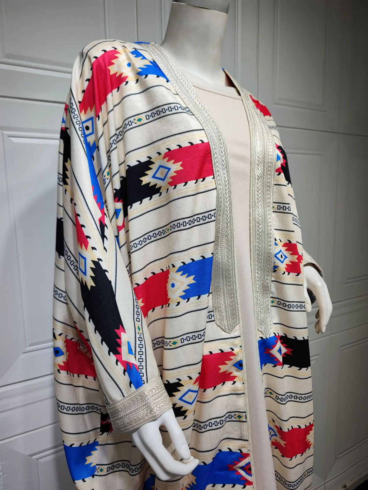Siskakia Two Pieces Muslim Abaya Dress Set Colorful Geometric Stripes Print Moroccan Kaftan Dubai Turkey Arab Oman Qatar Robe