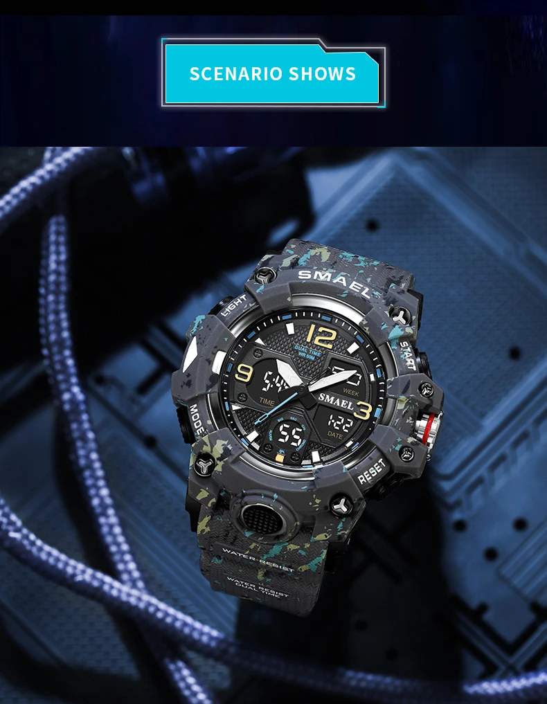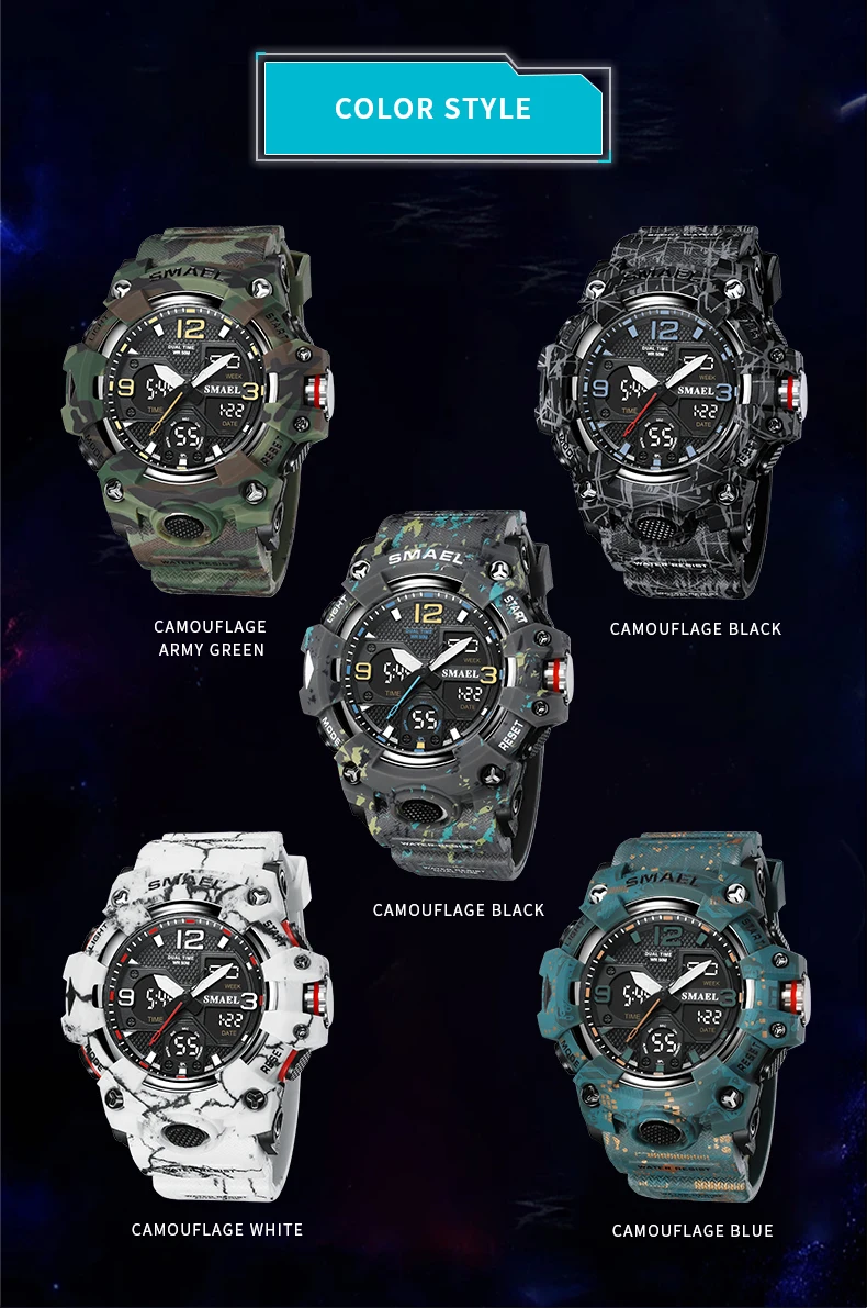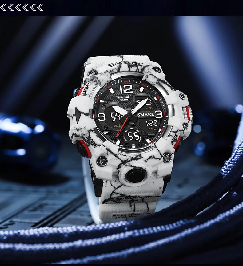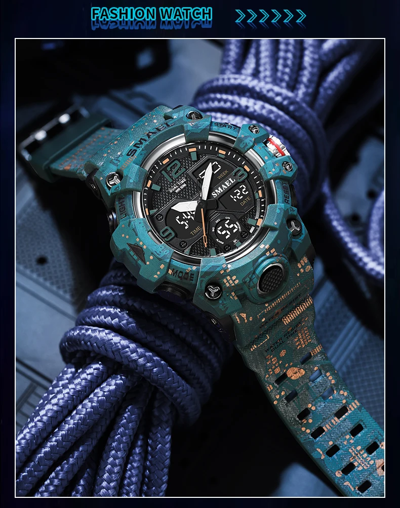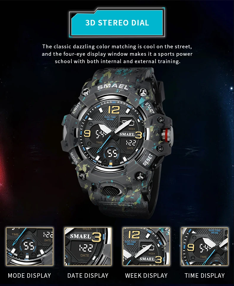 SMAEL Camouflage Sports Digital Watch for Men Auto Date Chronograph Quartz Analog Watches Luxury LED Electronic Wristwatch 8008