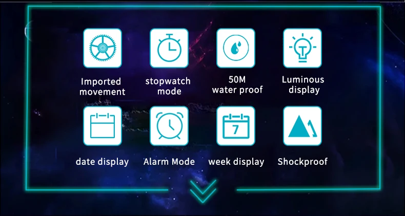 Features: Stopwatch, Date, Week, Alarm clock, Dual time shows with LED backlight function, Luminous hands