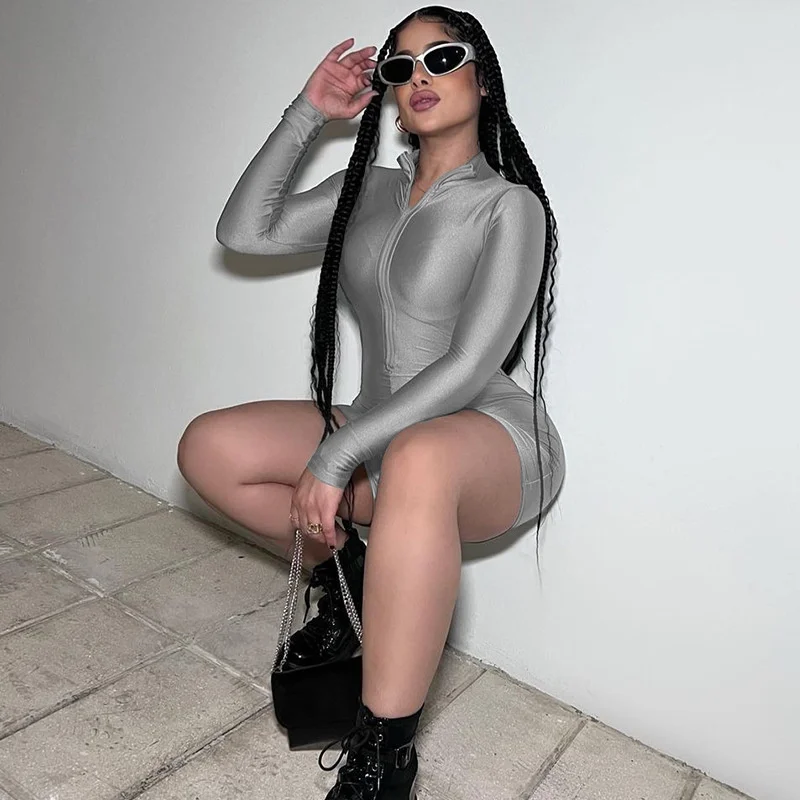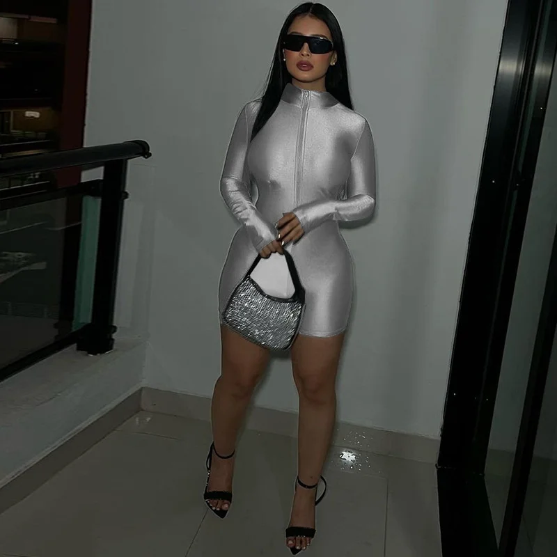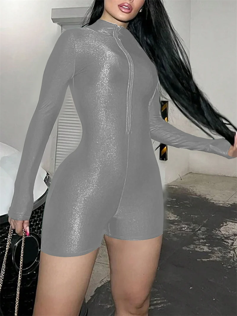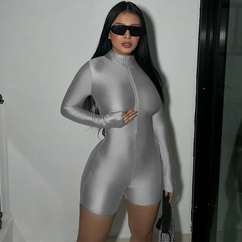 Solid Zipper Long Sleeve Playsuit Women Yoga Sporty Fitness Skinny One Pieces Romper Casual Shorts Jumpsuit Catsuit Bodysuit