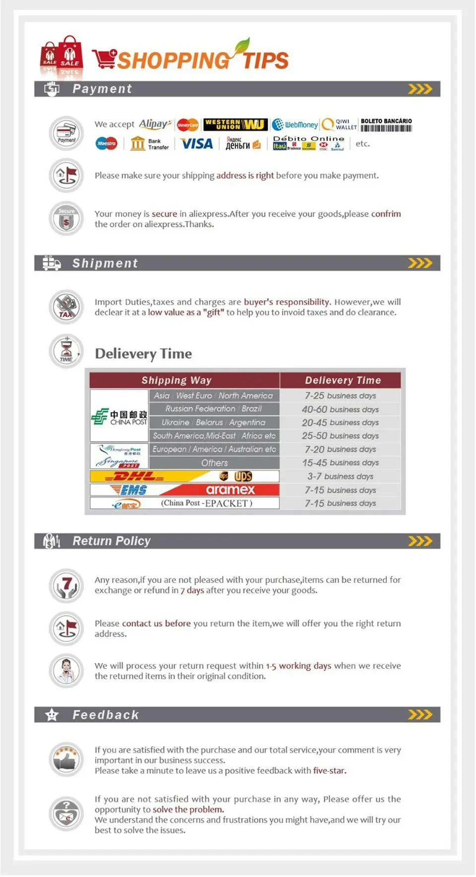 *Processing time: 12-72 Hours ( excluding some items temporarily out of stock),If the item you bought not availble,we will contact you to exchange for the other style,or cancel the order!