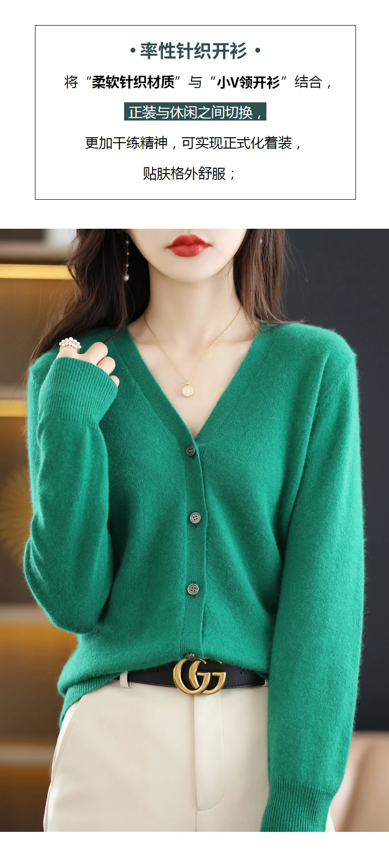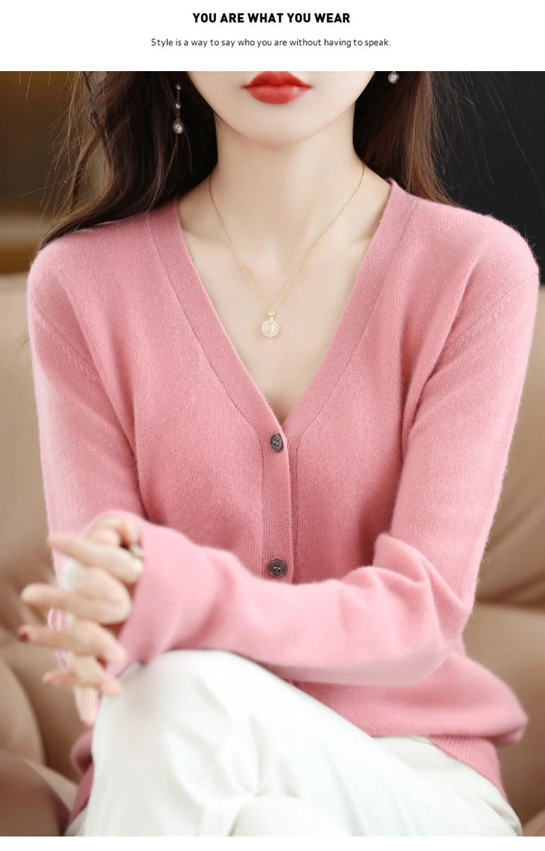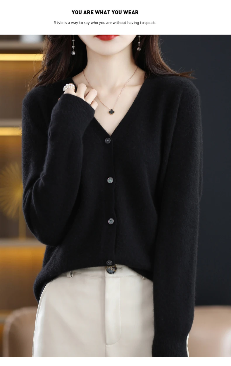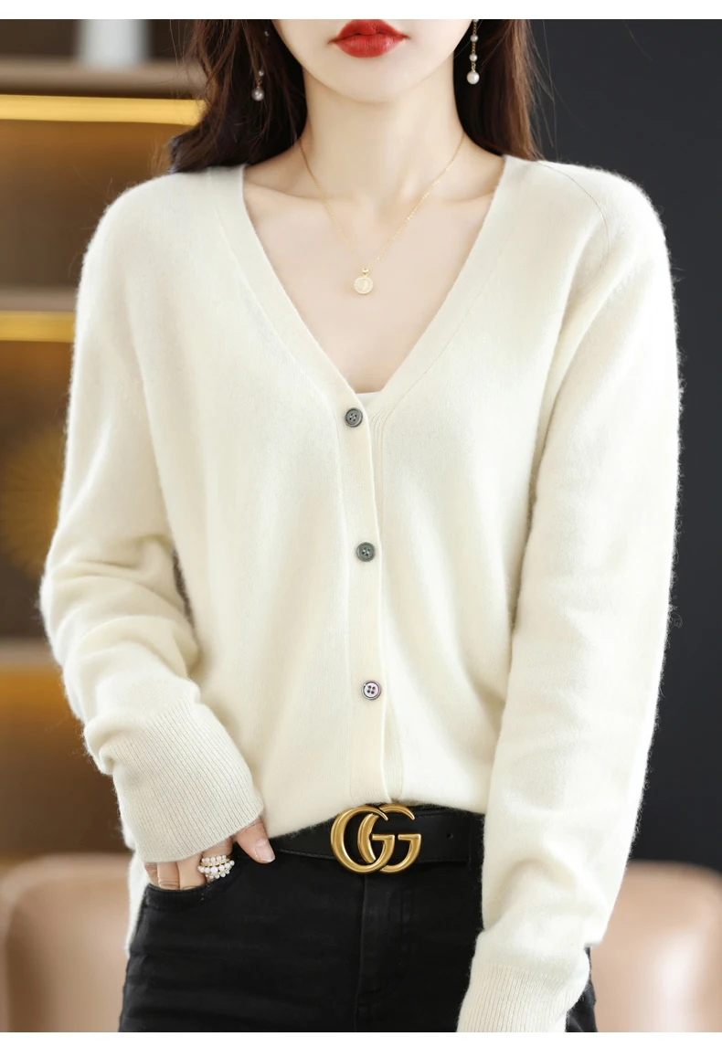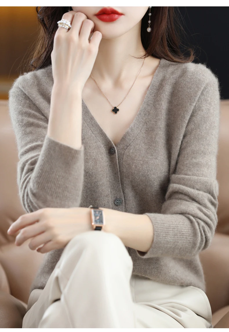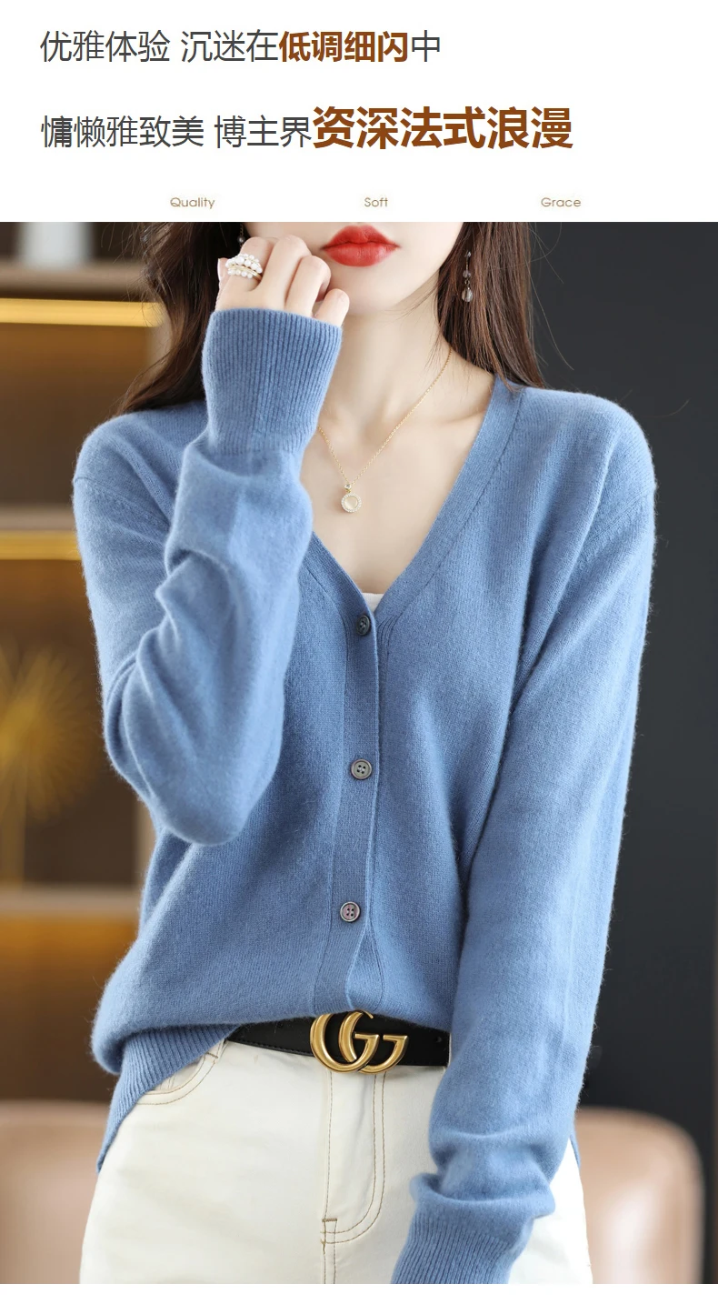 Spring Autumn Winter Women’s Chic Wool Knit Cardigan Loose V-Neck Long Sleeves Solid Color Soft Fashion Casual Sweater Jacket