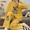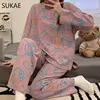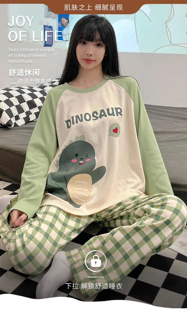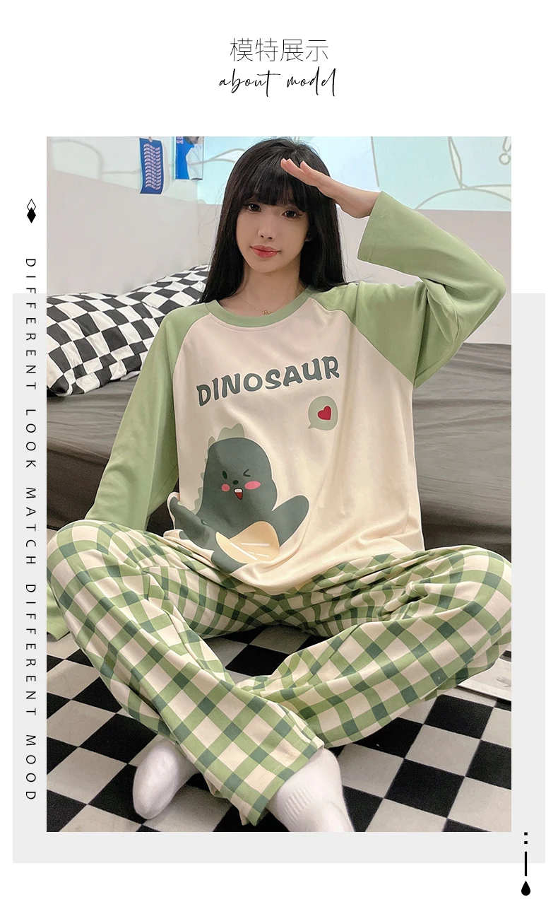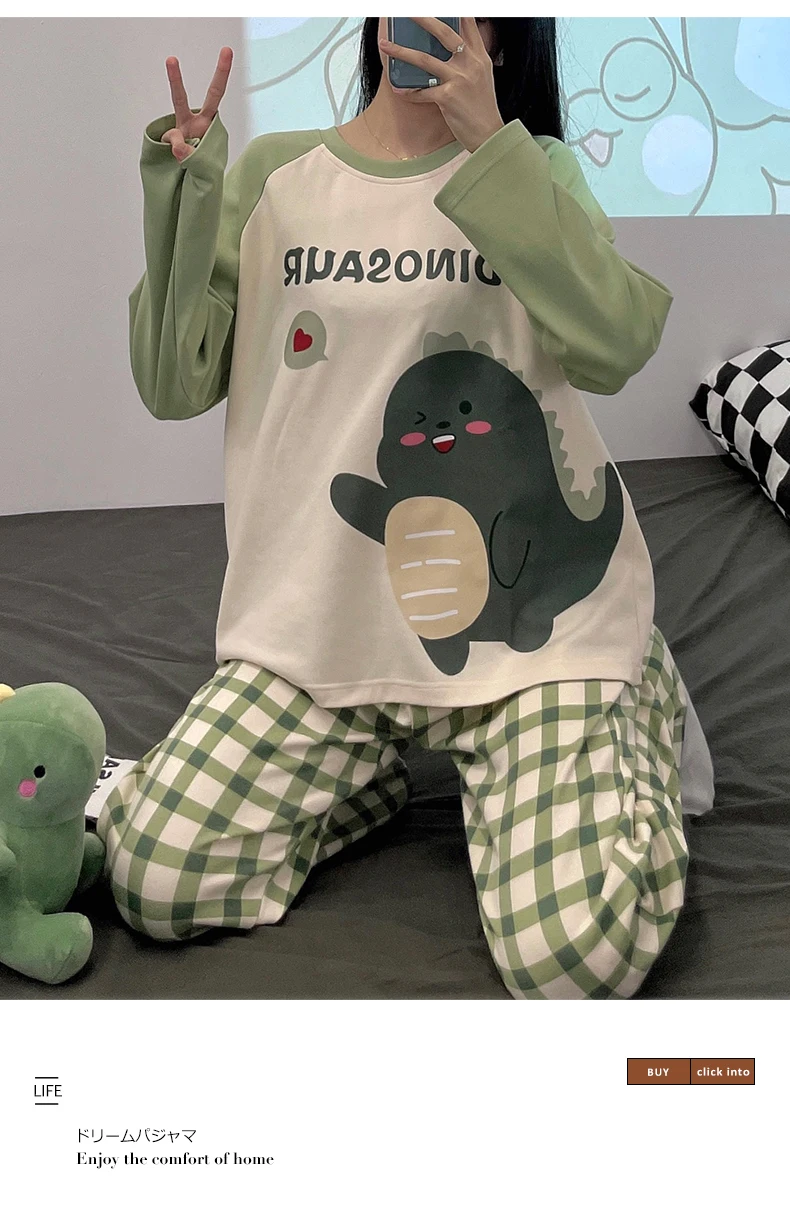 SUKAE Spring Autumn Long Sleeves Women Cotton Pajamas Sets Cute Cartoon Dinosaur Sleepwear Young Lady Homesuits Casual Pijamas