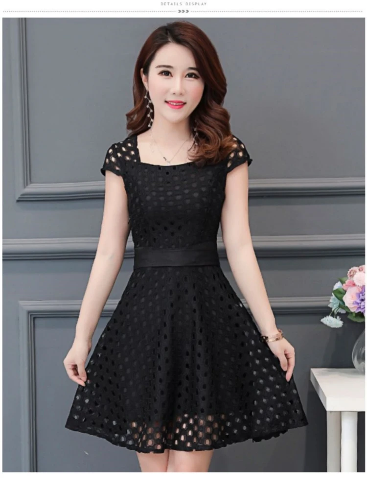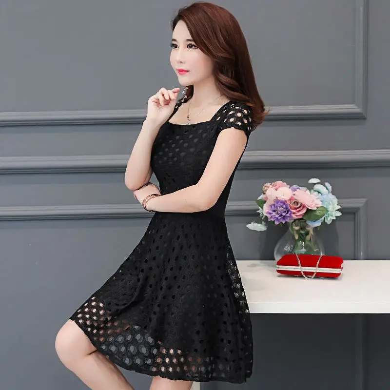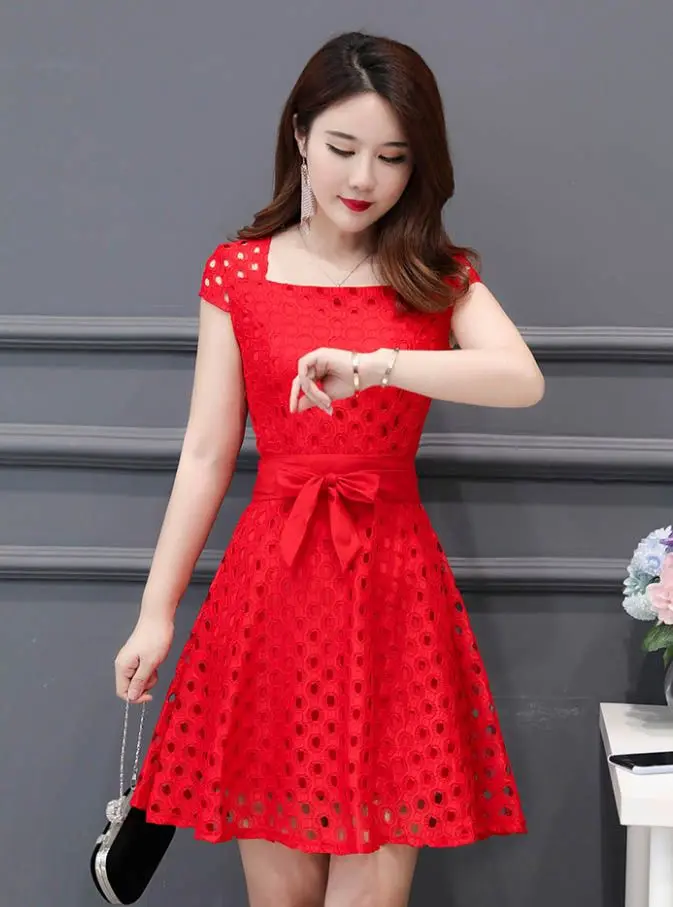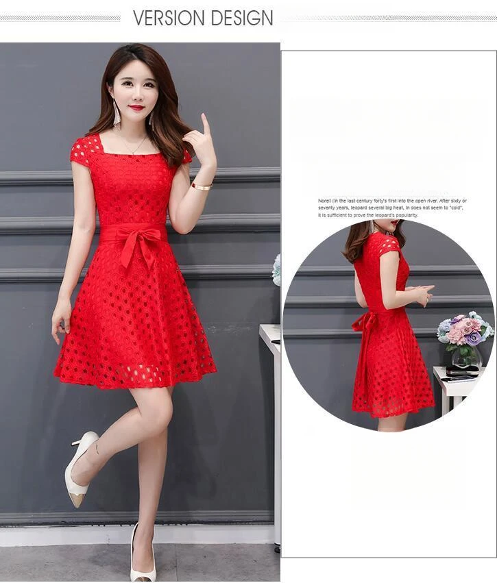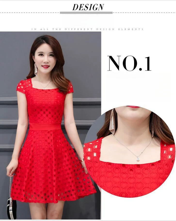 Summer Black Hollow Out Lace Dress Women’s Short Sleeve Square Collar Lace-Up Red Slim Plus-Size Dresses Vestido Mujer Elegante