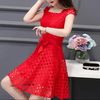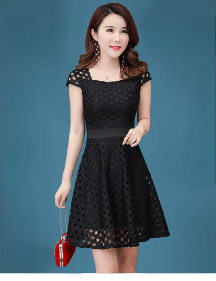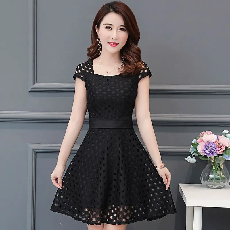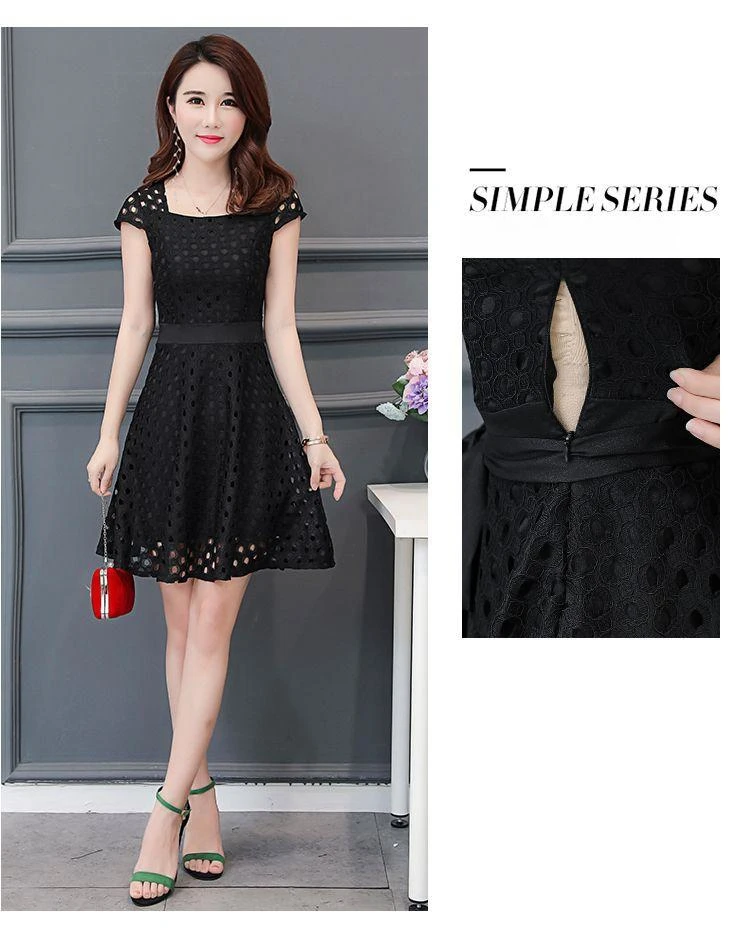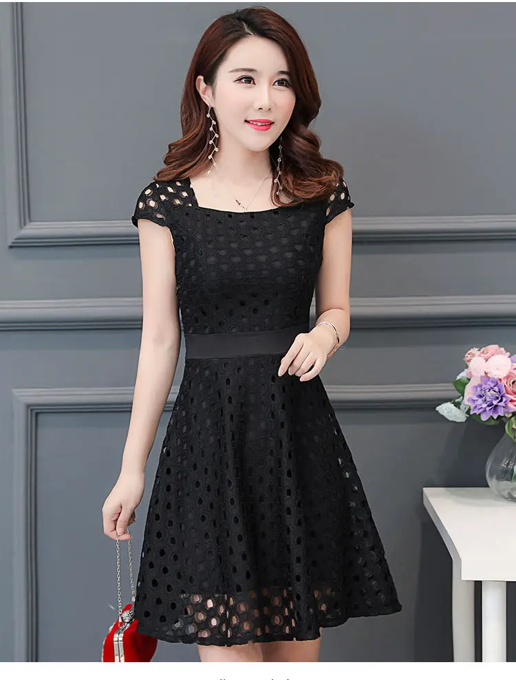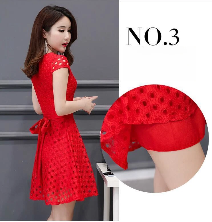 Summer Black Hollow Out Lace Dress Women’s Short Sleeve Square Collar Lace-Up Red Slim Plus-Size Dresses Vestido Mujer Elegante