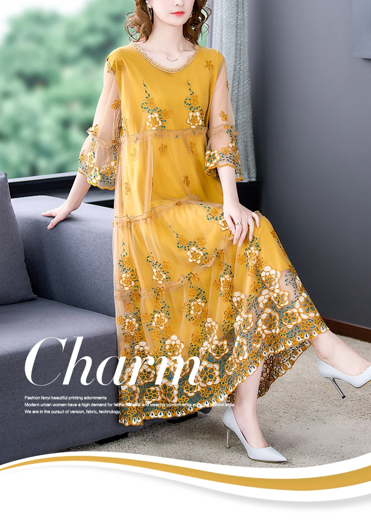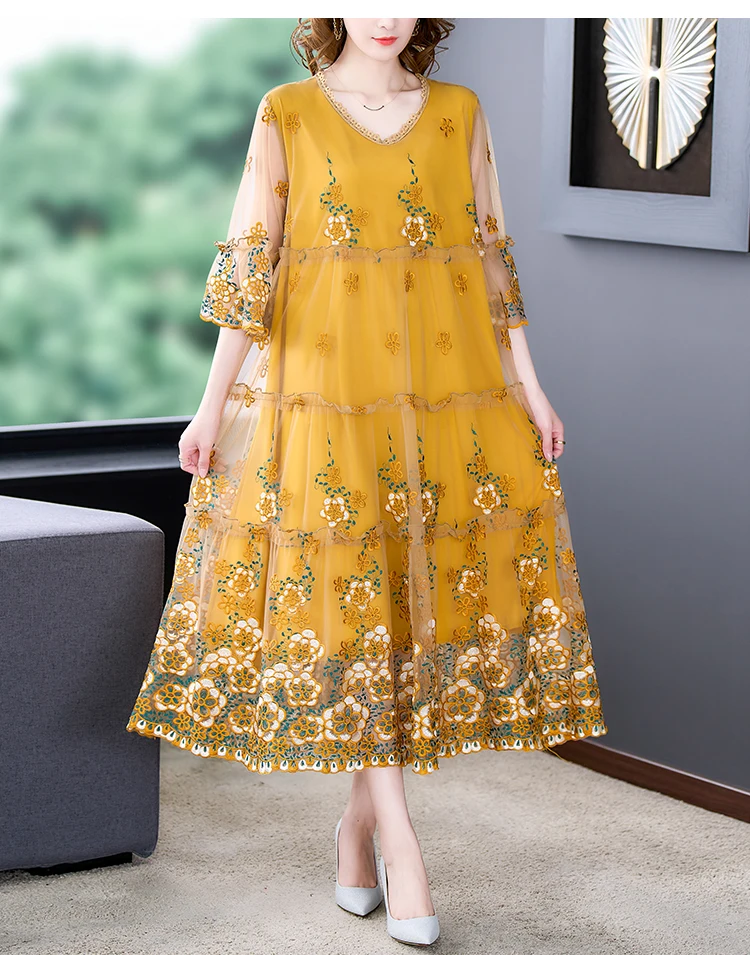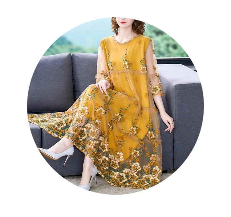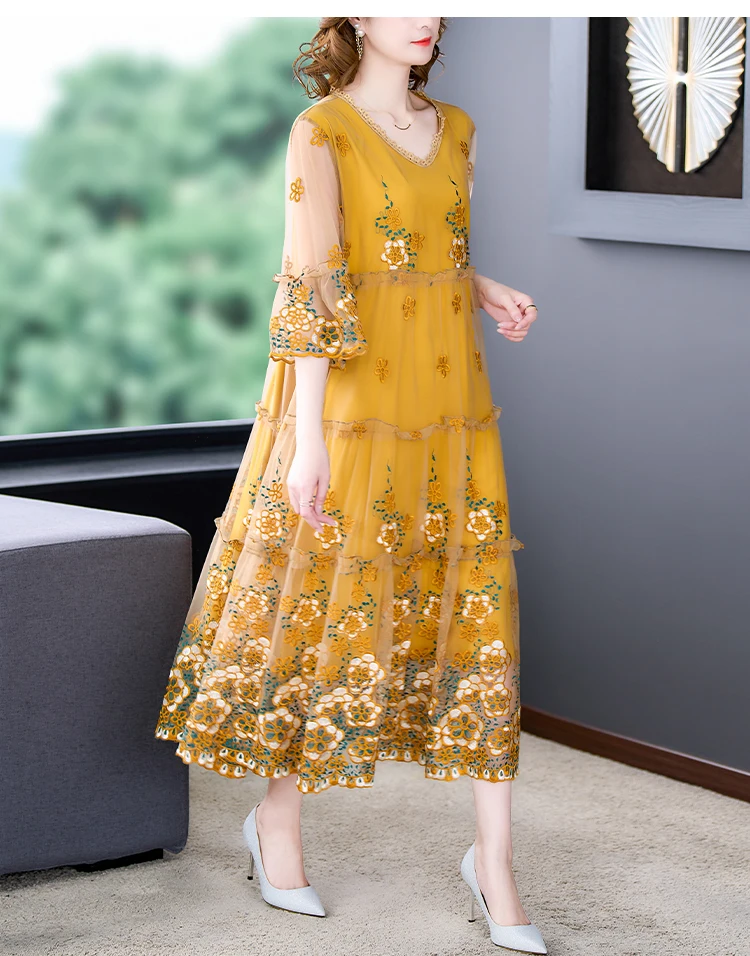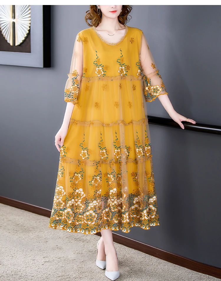 Summer Embroidery Floral Natural Silk Light Midi Dress Women Korean Fashion Light Beach Dress 2024 Elegant 5XL Plus Size Dress