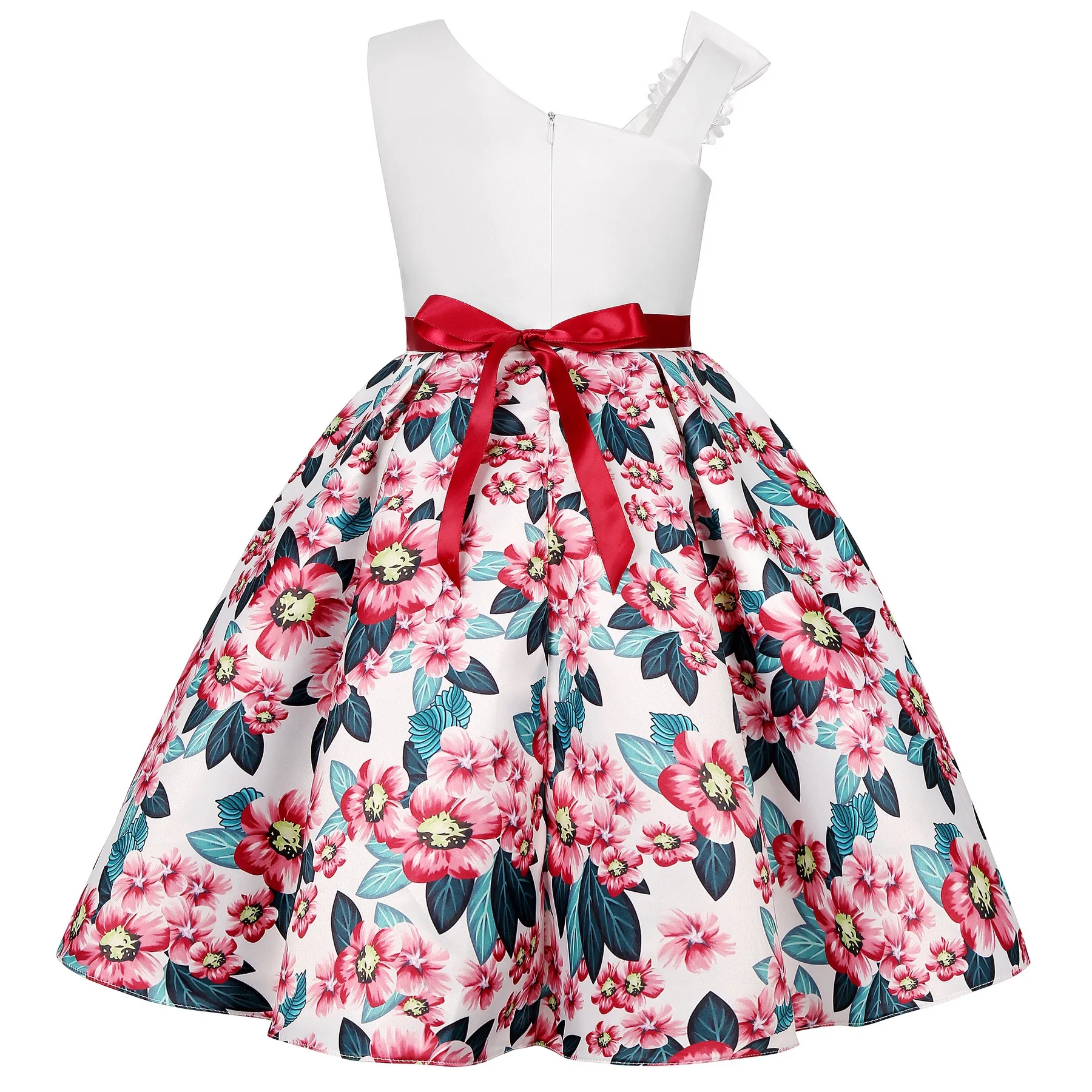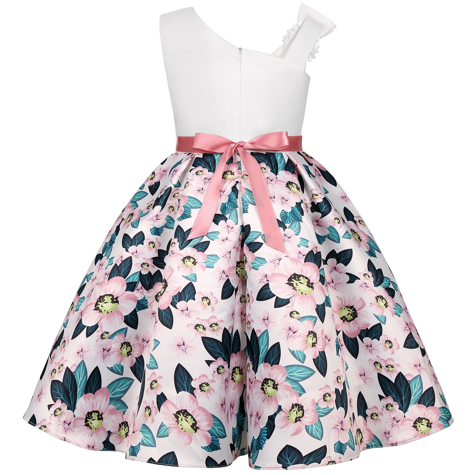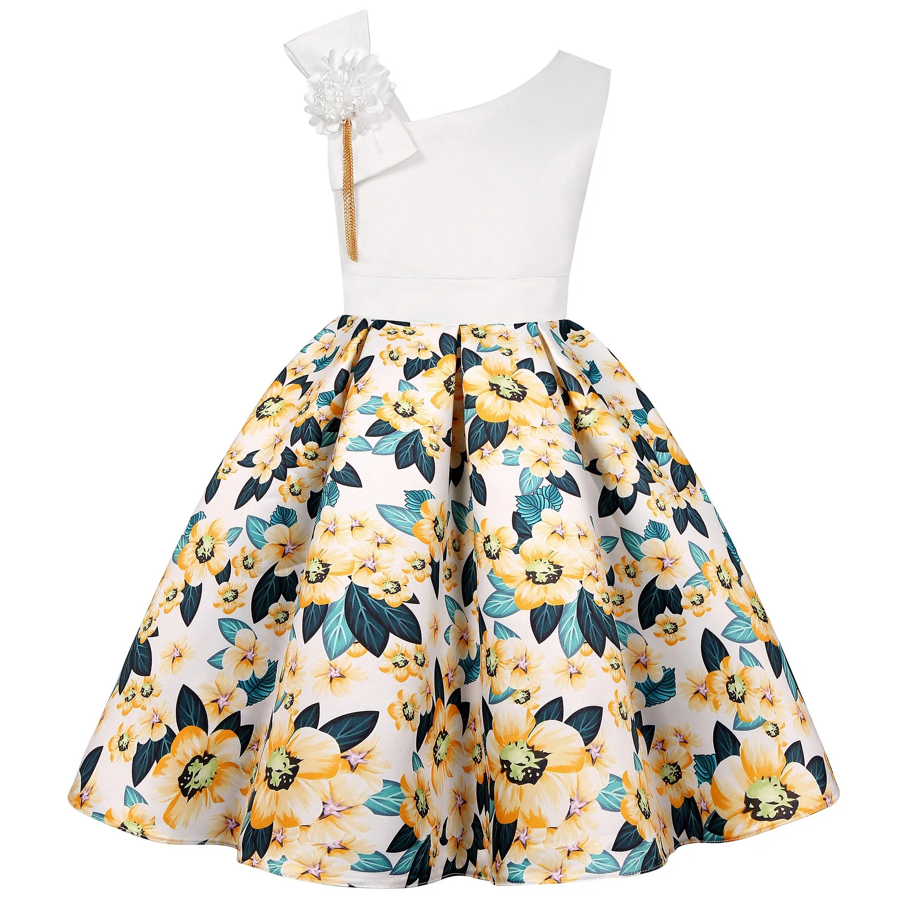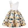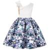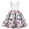 Summer New Girl’s Skew Shoulder 3D Flower Print Dress Birthday Party Wedding Flower Girl Carnival Party Dress for 2-10 Years