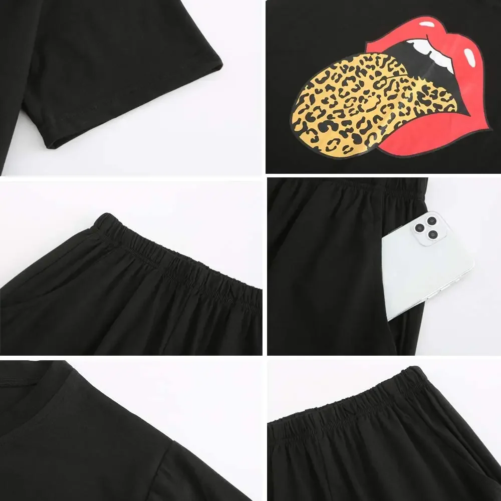 Summer Womens T-shirts Shorts 2 Pieces Outfit Tracksuit Sequin Lips&Butterfly Print Top and Short Sweatsuit Set Female Outfits