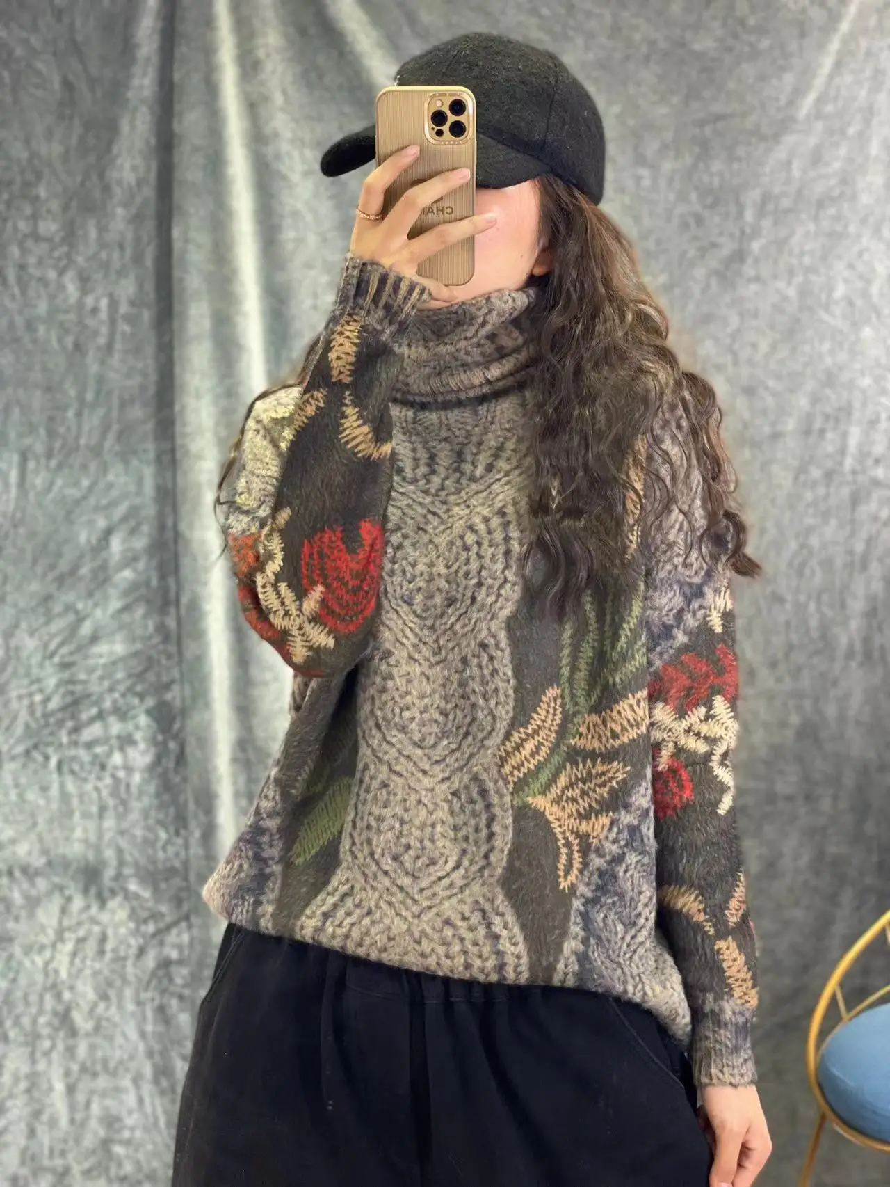 Turtleneck Imitation Mink Sweaters Woman Pullovers Flowers Printed Panelled Pattern Warm Loose Knitted Vintage Tops