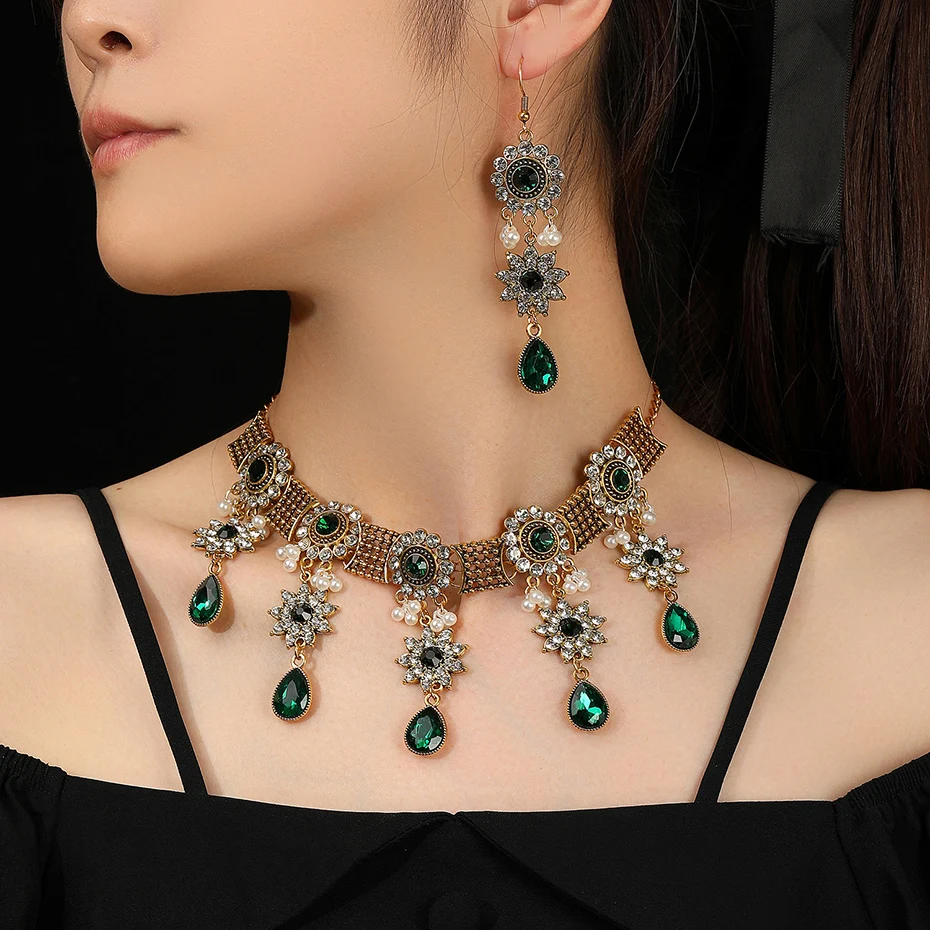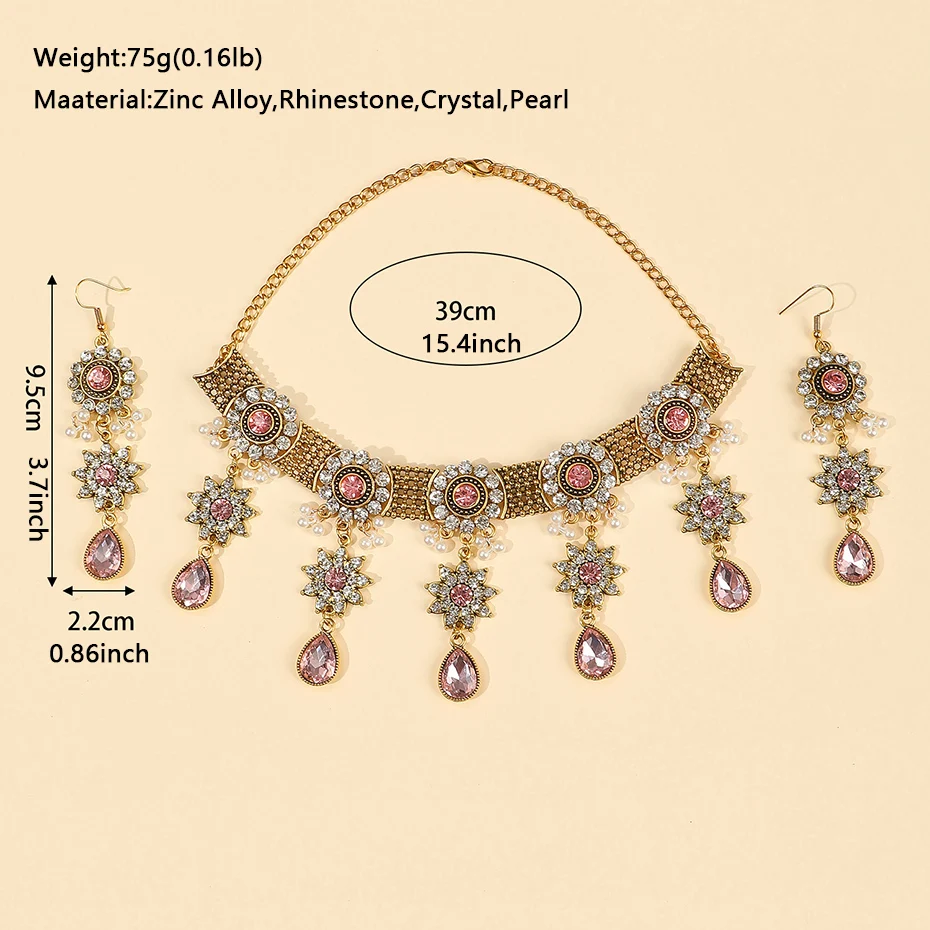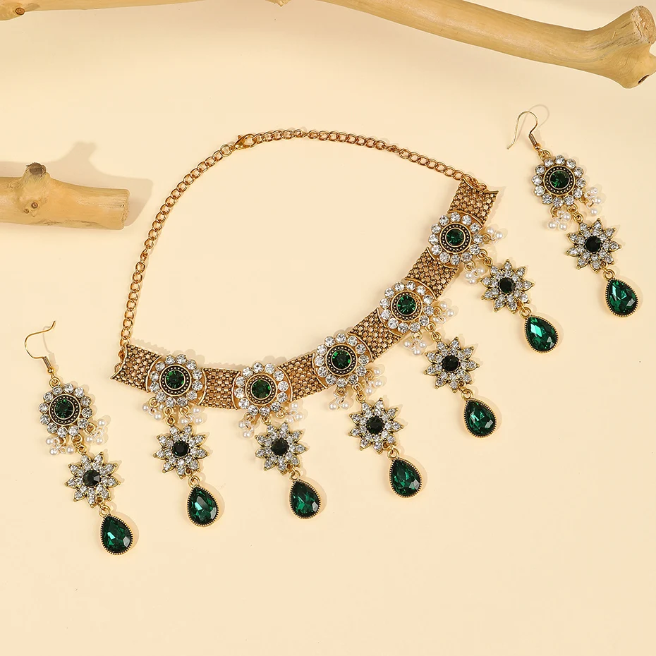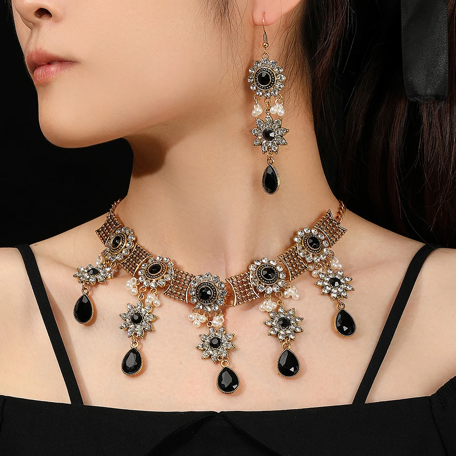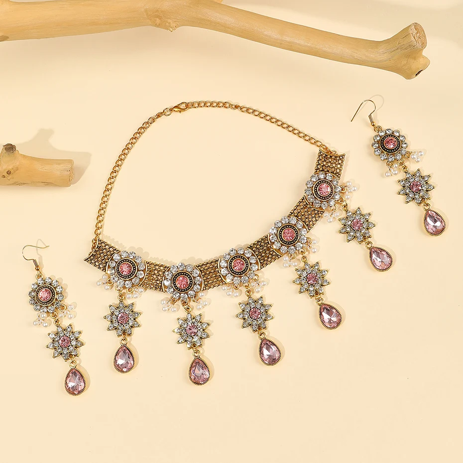 Vintage Crystal Flower Jewelry Sets for Women Accessories Rhinestone Antique Gold Color Necklace and Earrings Set Party Gift