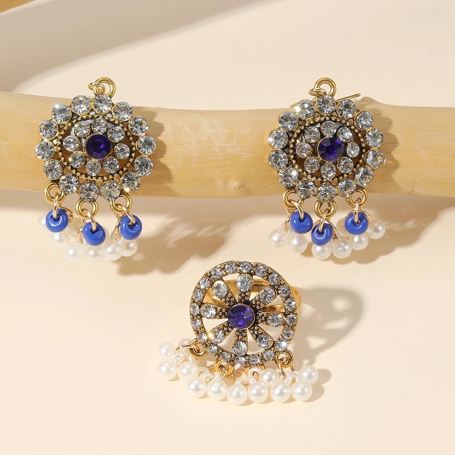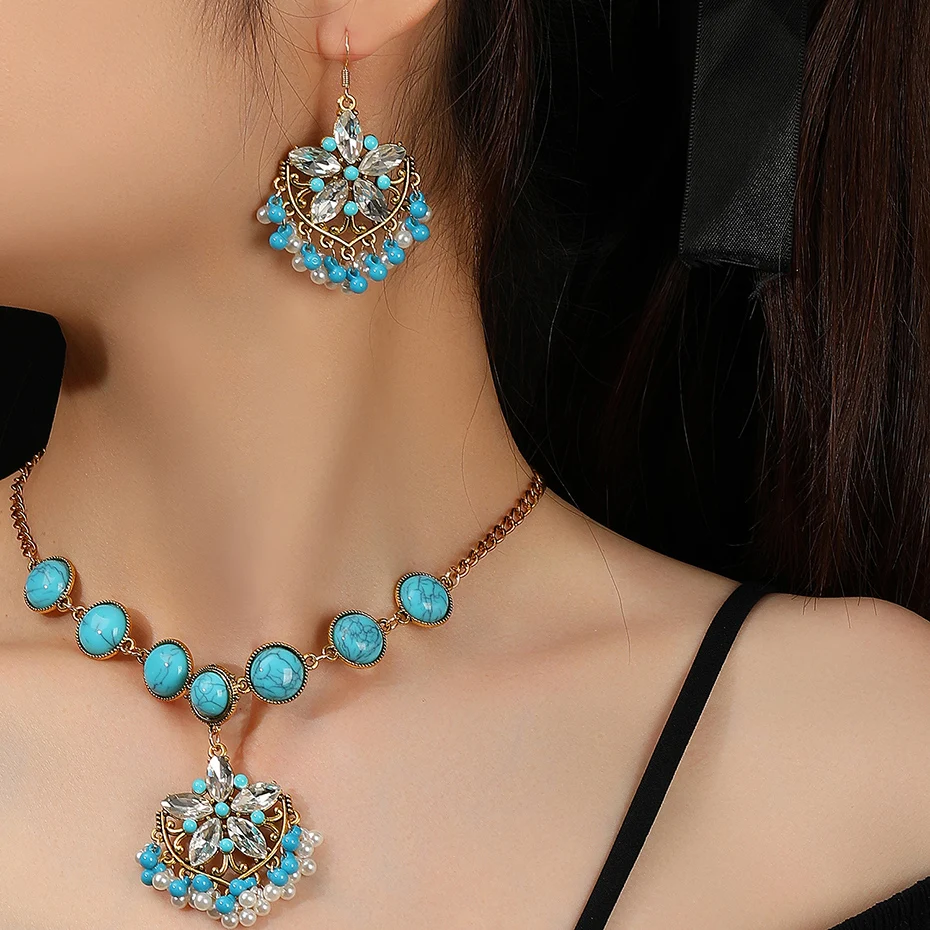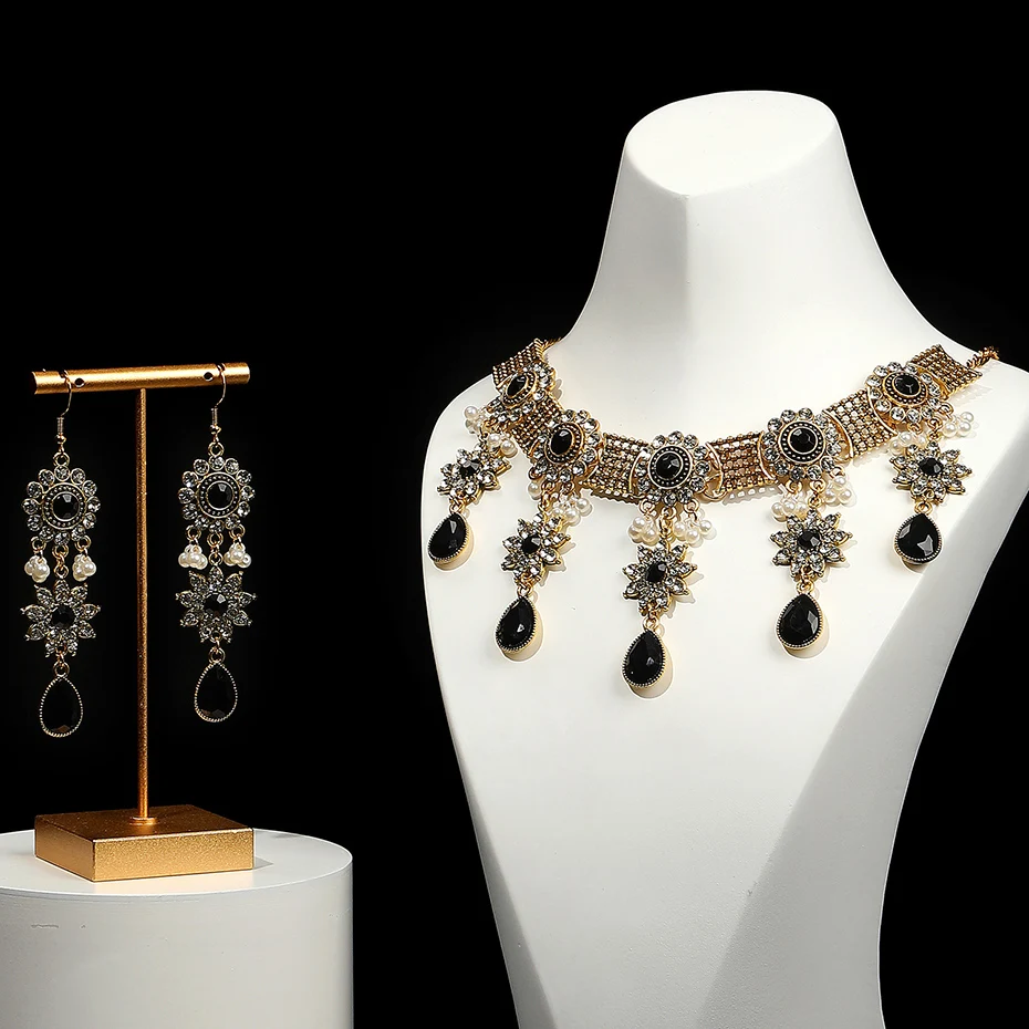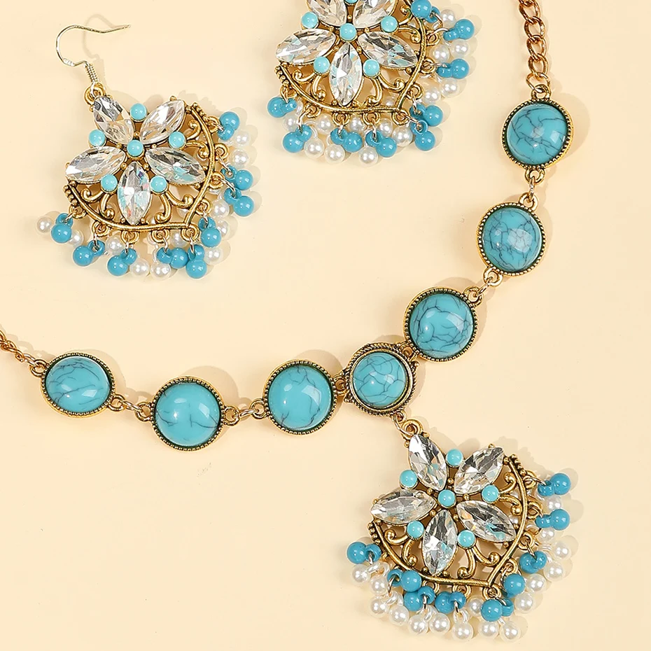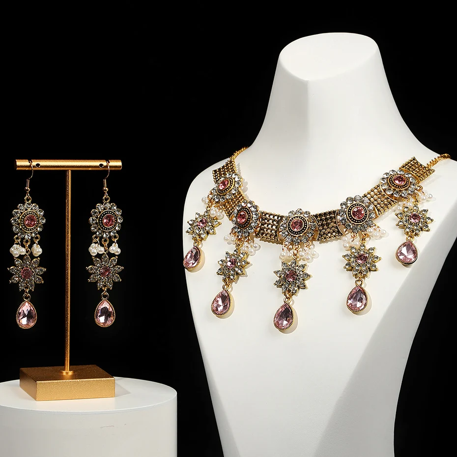 Vintage Crystal Flower Jewelry Sets for Women Accessories Rhinestone Antique Gold Color Necklace and Earrings Set Party Gift