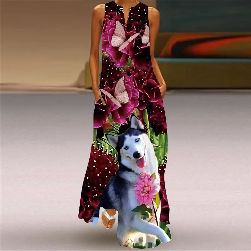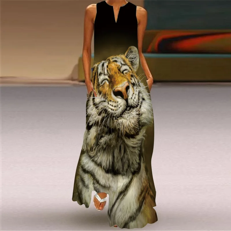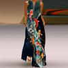 Vintage Print Party Dress For Women Summer Loose Sleeveless Elegant Lady V Neck Pocket Long Dresses Boho Beach Sundress Vestidos