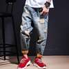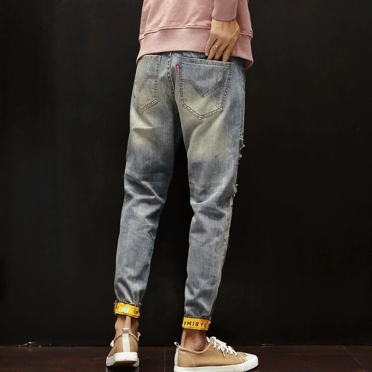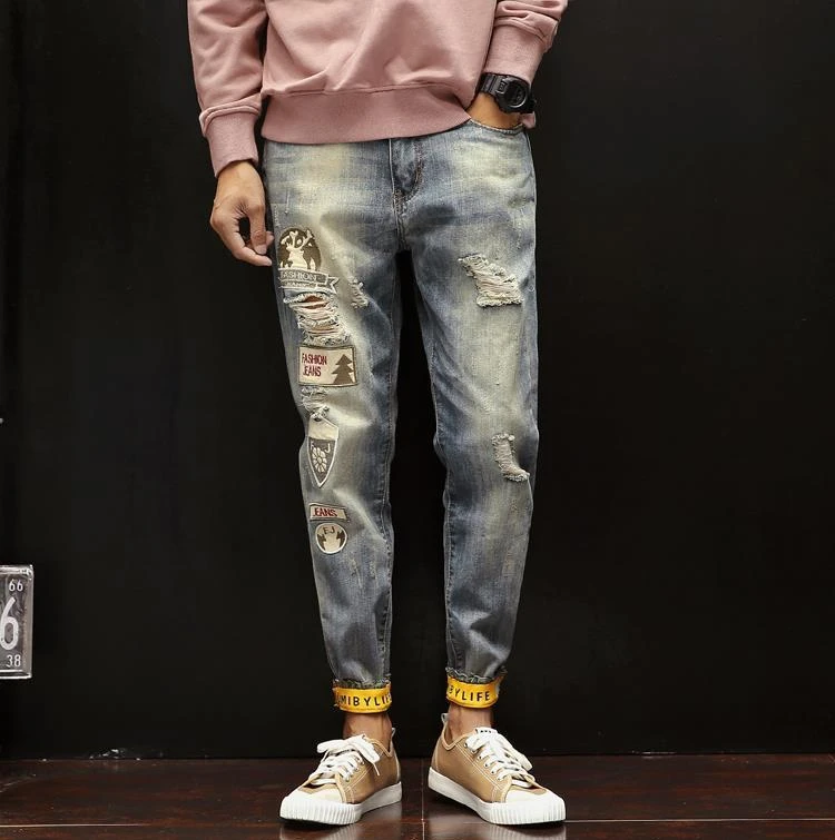 With Print Tapered Men’s Jeans Broken Ripped Retro Korean Fashion Man Cowboy Pants Graphic Torn Slim Fit Boot Cut Holes Trousers