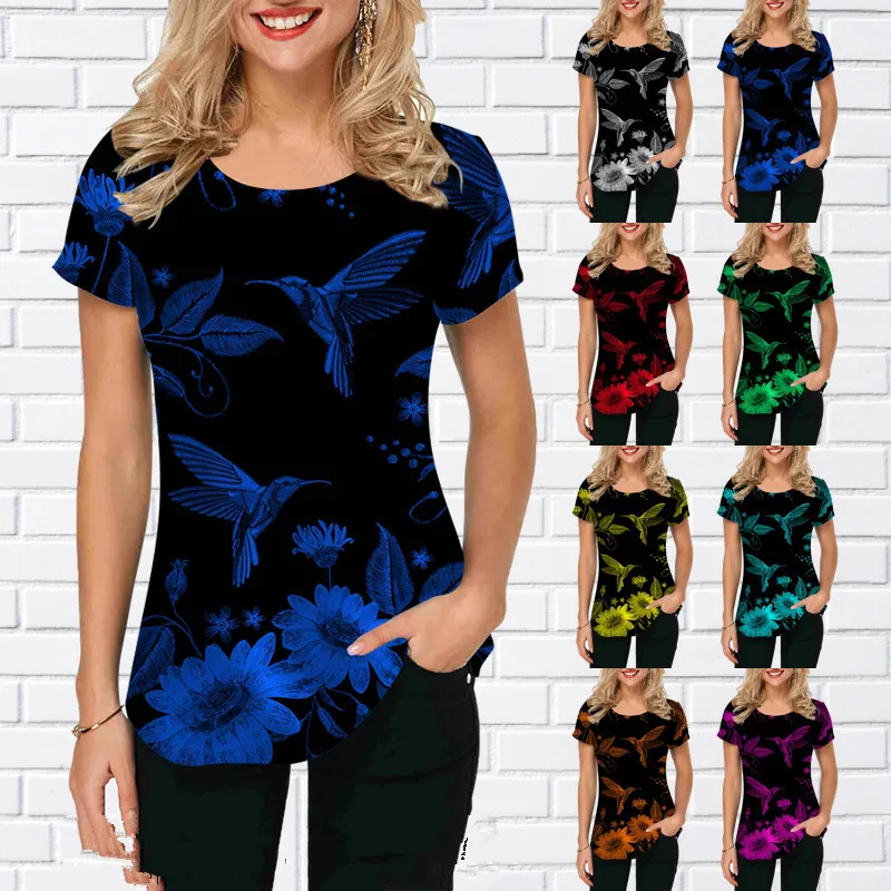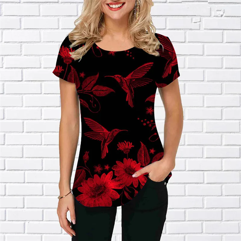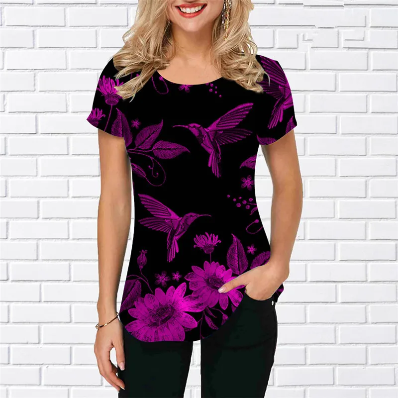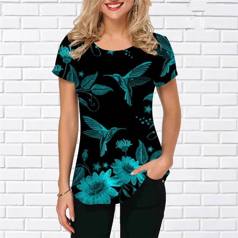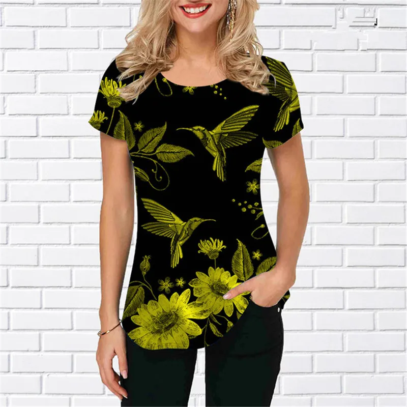 Women birdie Print Shirts Summer Short Sleeve Street 3D Style Ladies Blouses Loose Casual Round-Neck Oversized Pullovers Tops