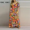 Women Chic Off Shoulder Sashes Short Lantern Sleeves All Over Print Floral Maxi A-line Casual Dress
