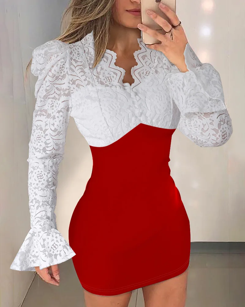 Women Dresses Spring Fashion Colorblock Contrast Lace Bell Sleeve V-Neck Long Sleeve Bodycon Office Mini Dress