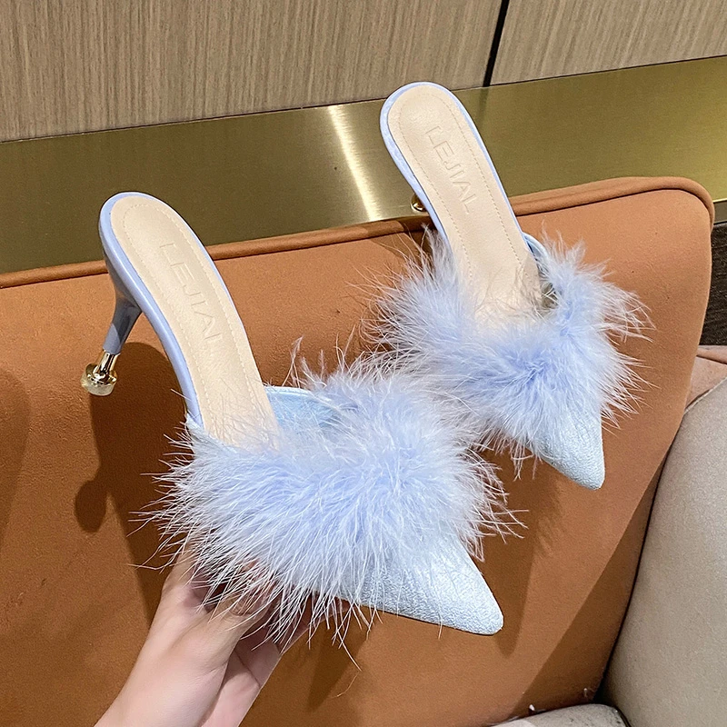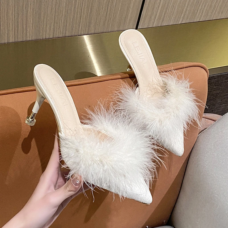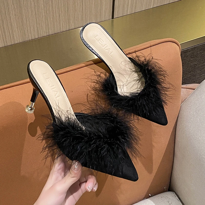 Women High Heels Shoes 2023 Summer New Fur Pointed Toe Thin Heels Women Mules Dress Party Outside Ladies Slippers Plus Size 42