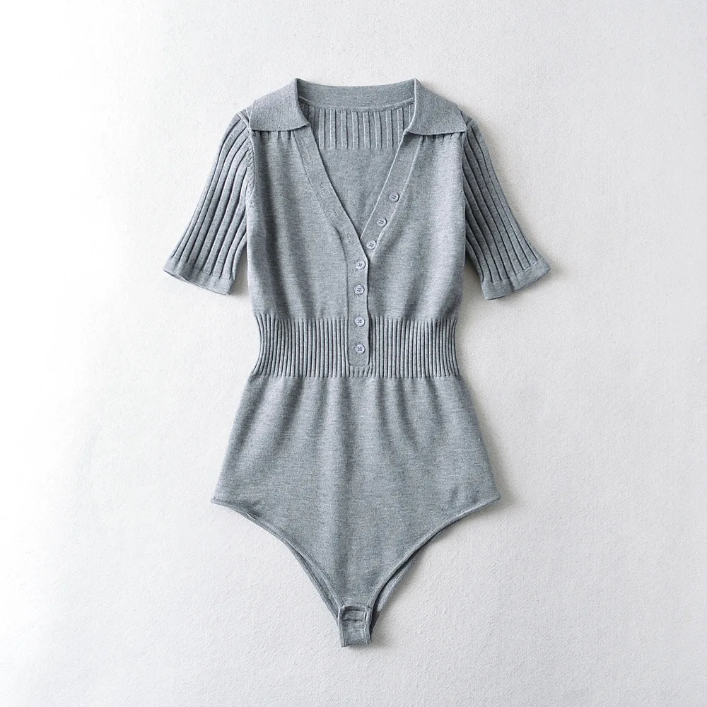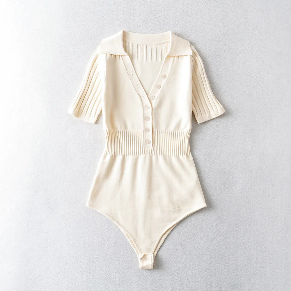 Women Knitted Ribbed Button Up Short Sleeve Le Body Yauco LES CLASSIQUES Polo Bodysuit