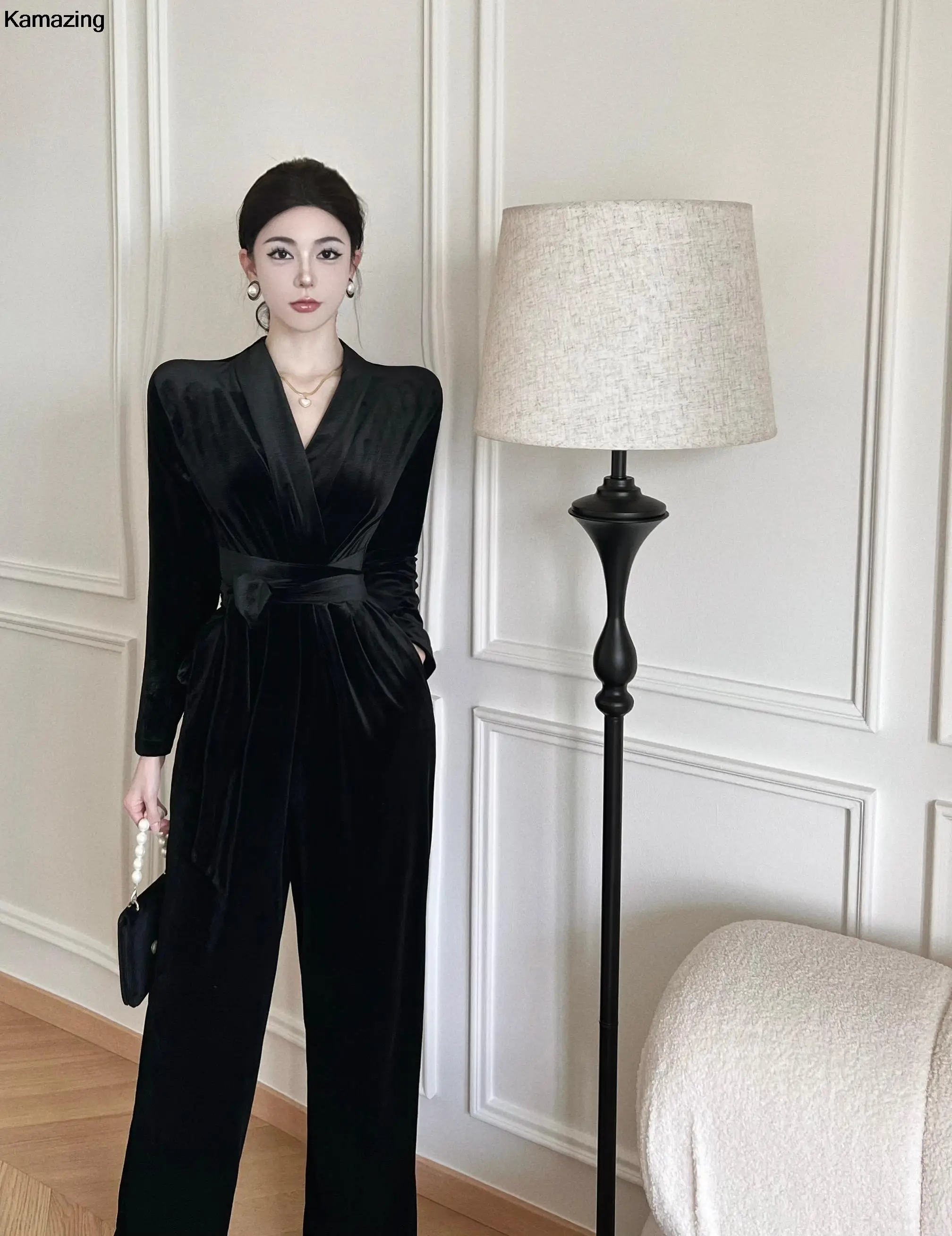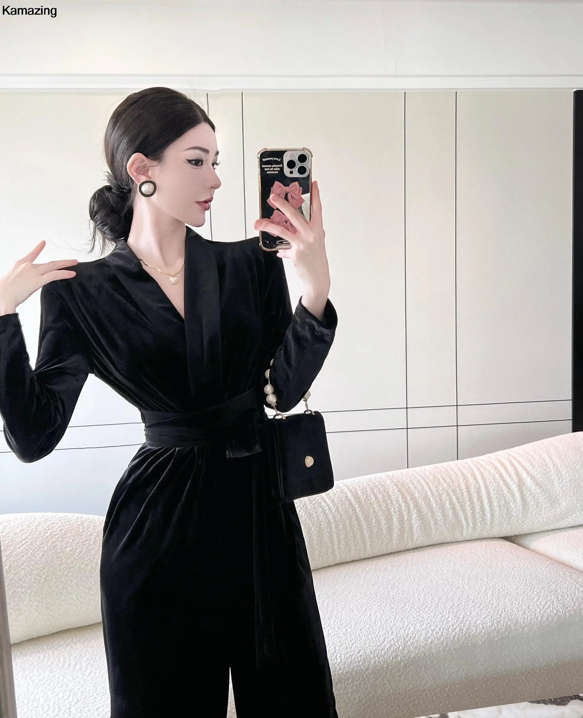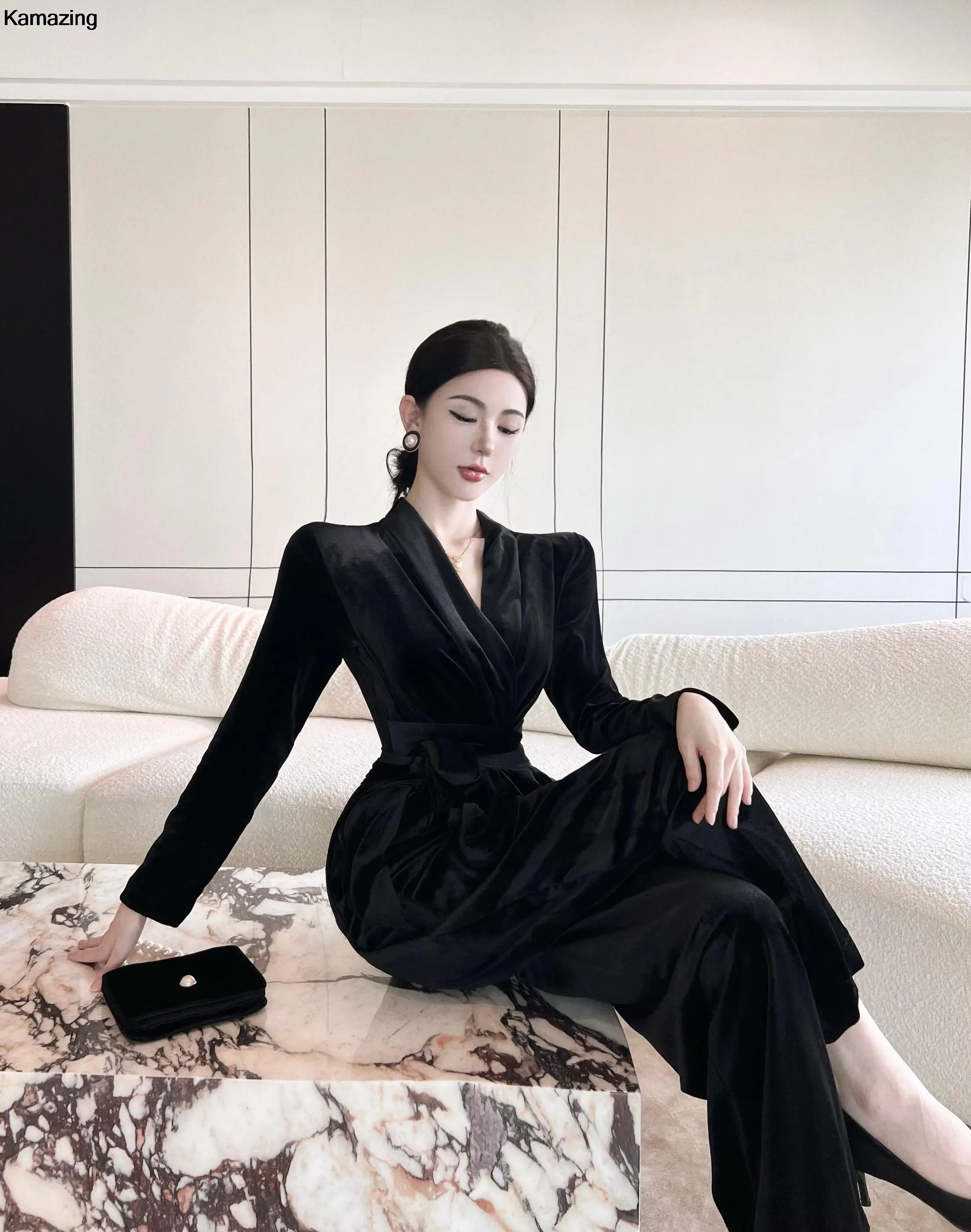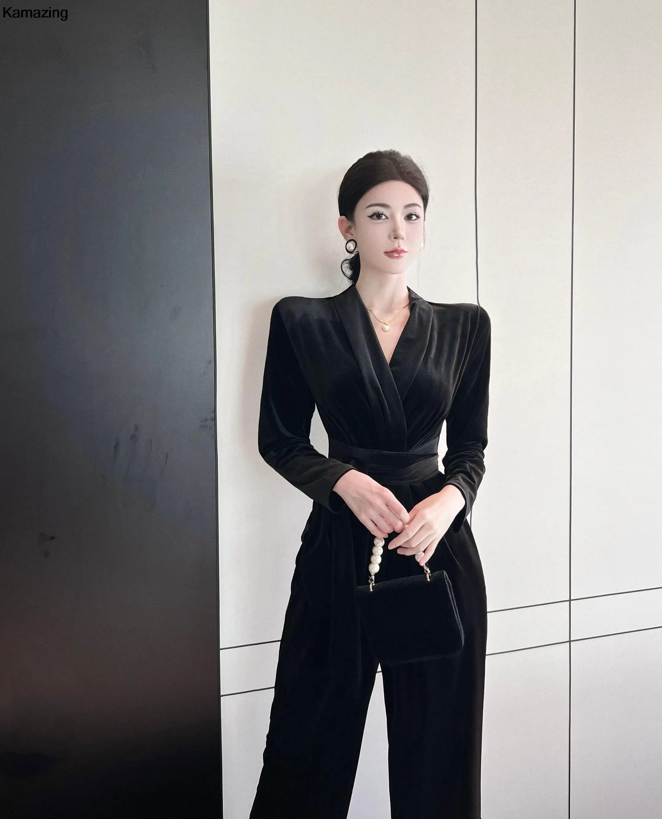 Women Spring New Elegant Long Sleeve Vintage Velvet Bodycon Jumpsuit Office Lady Casual Slim Clothing