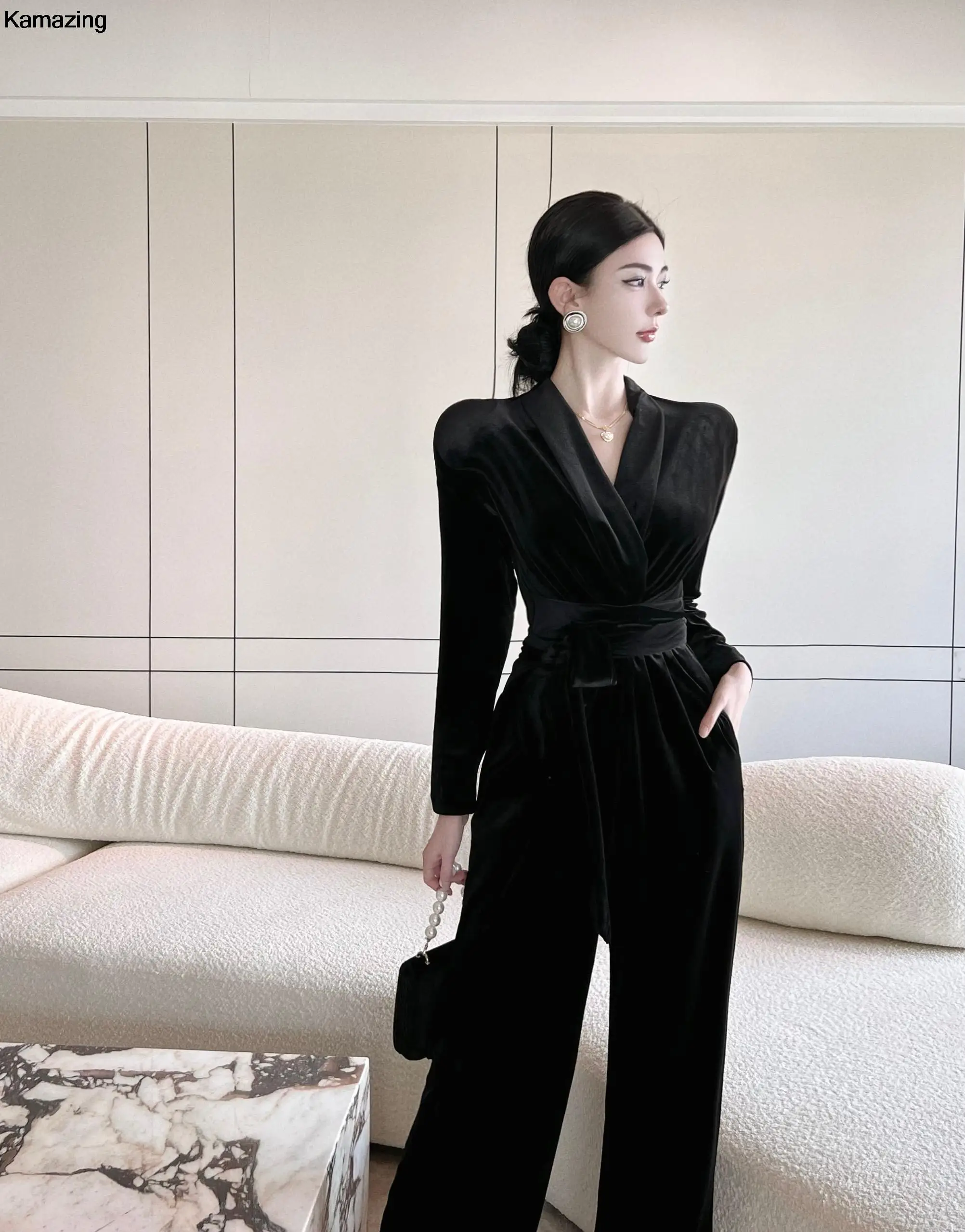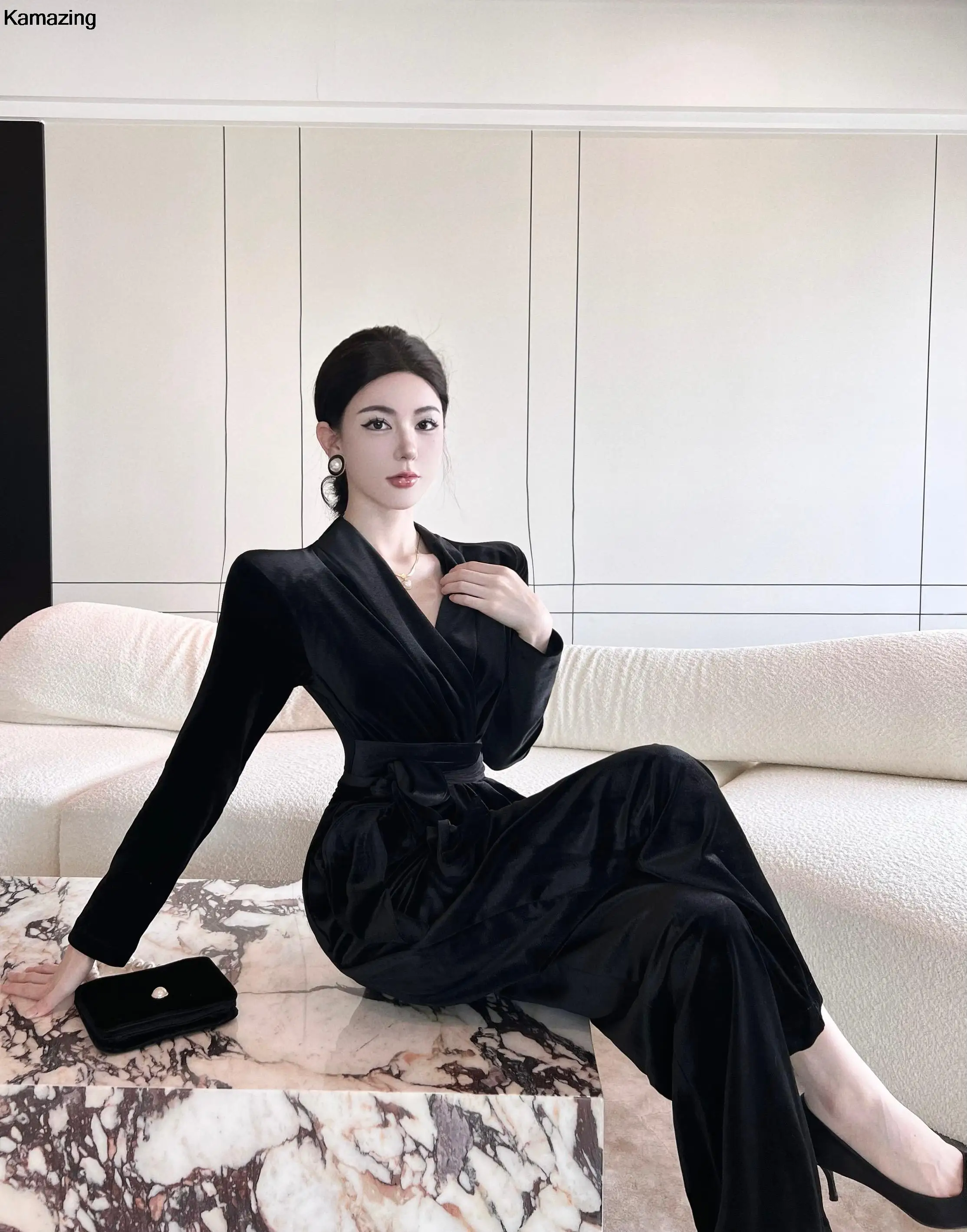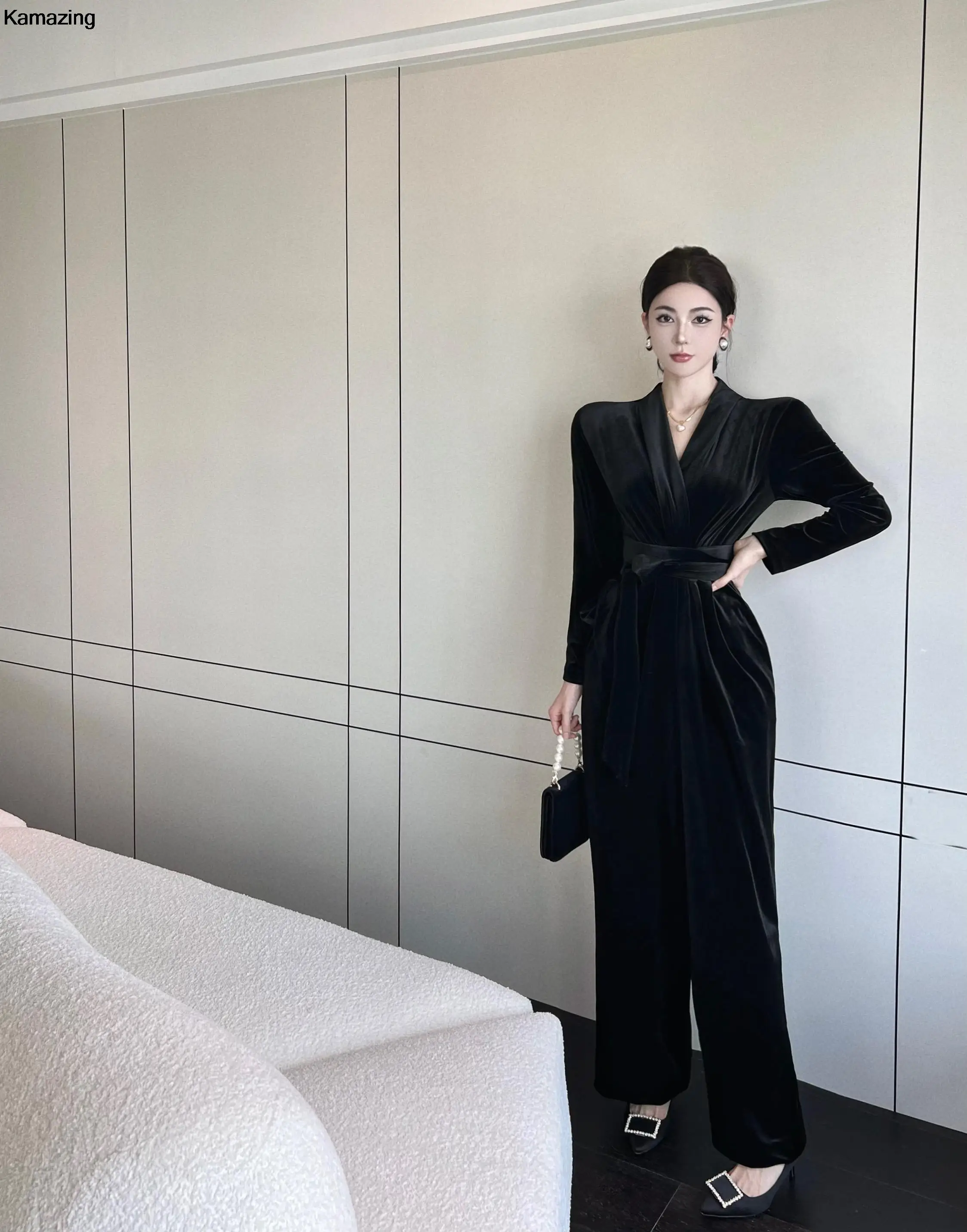 Women Spring New Elegant Long Sleeve Vintage Velvet Bodycon Jumpsuit Office Lady Casual Slim Clothing