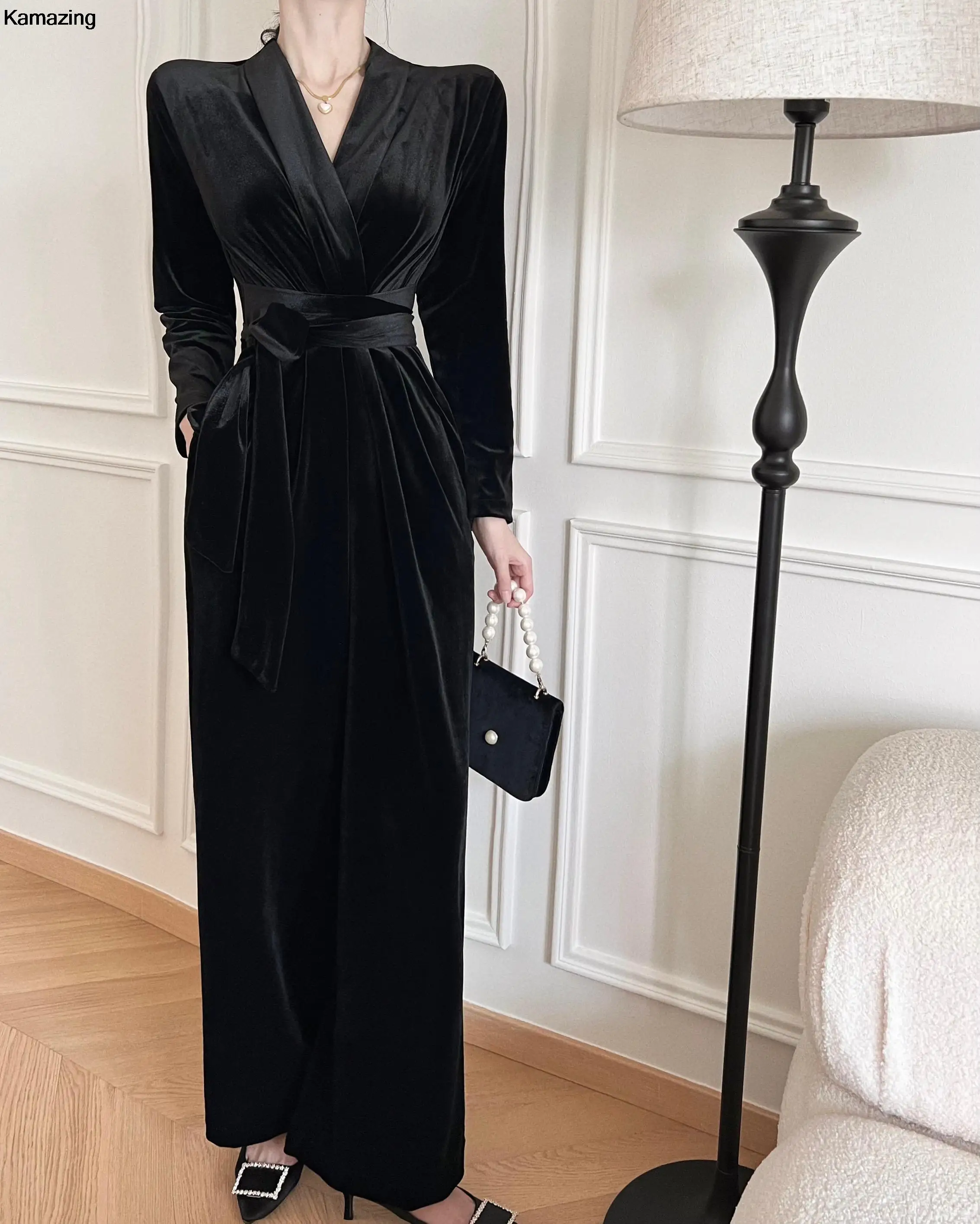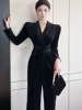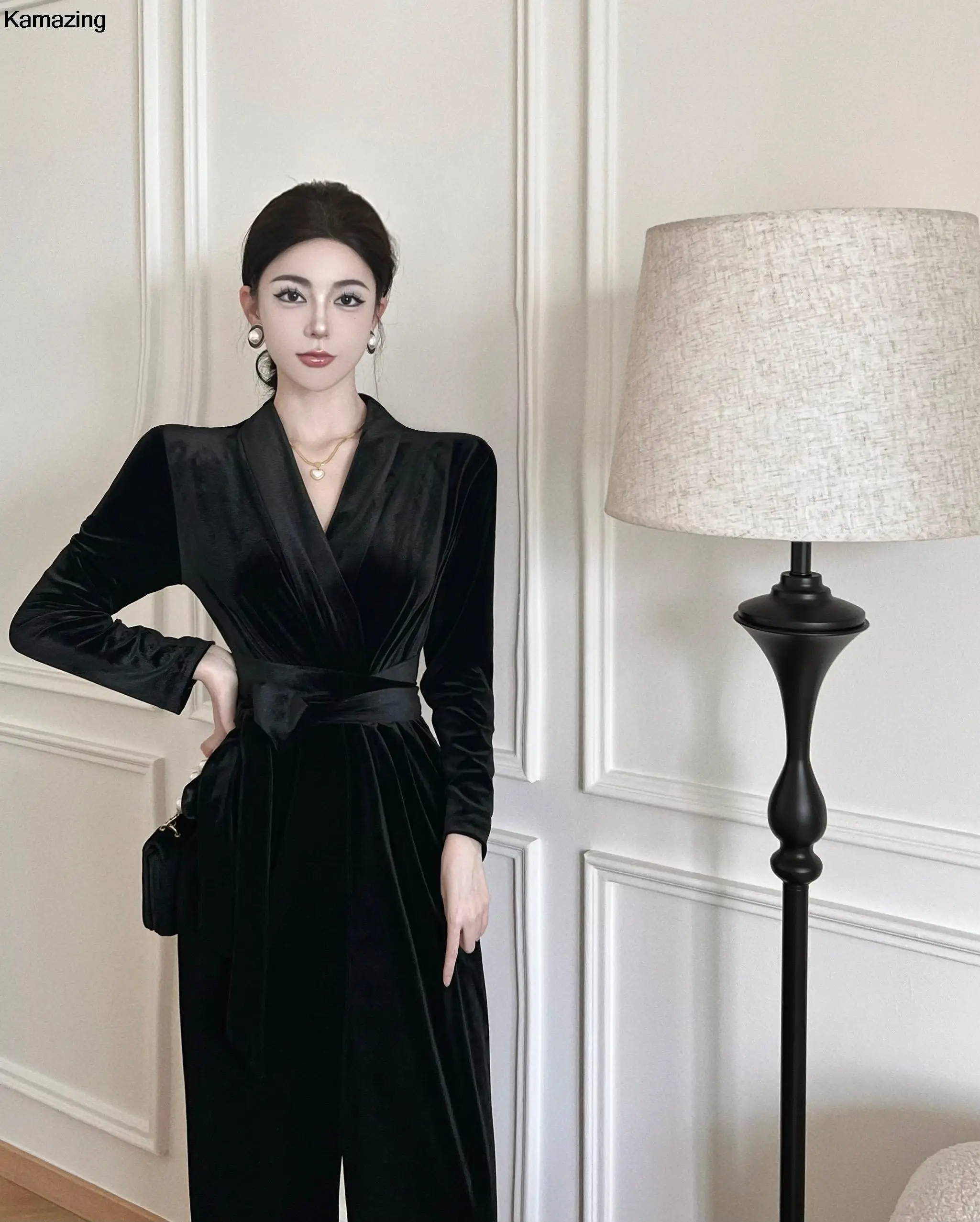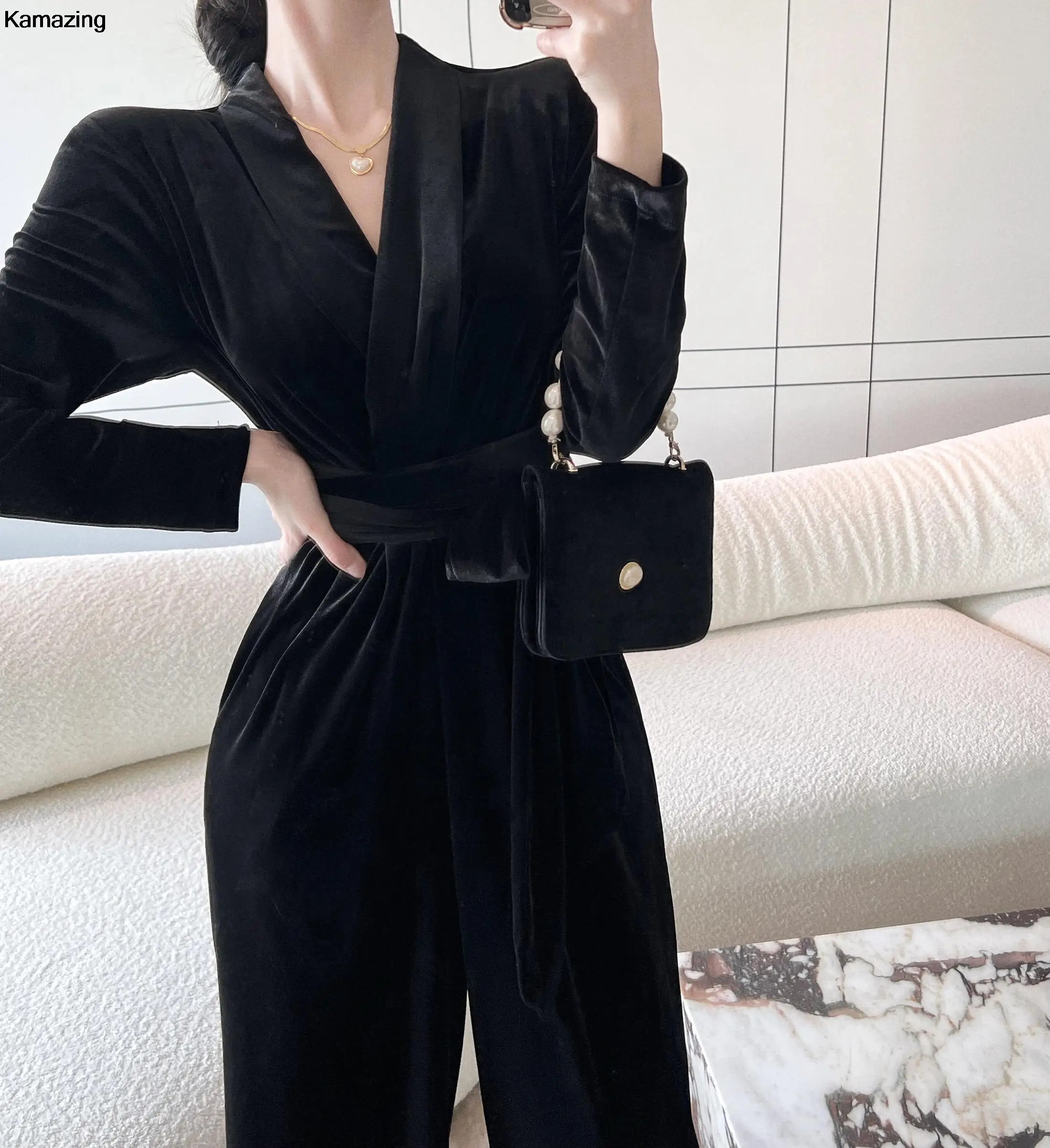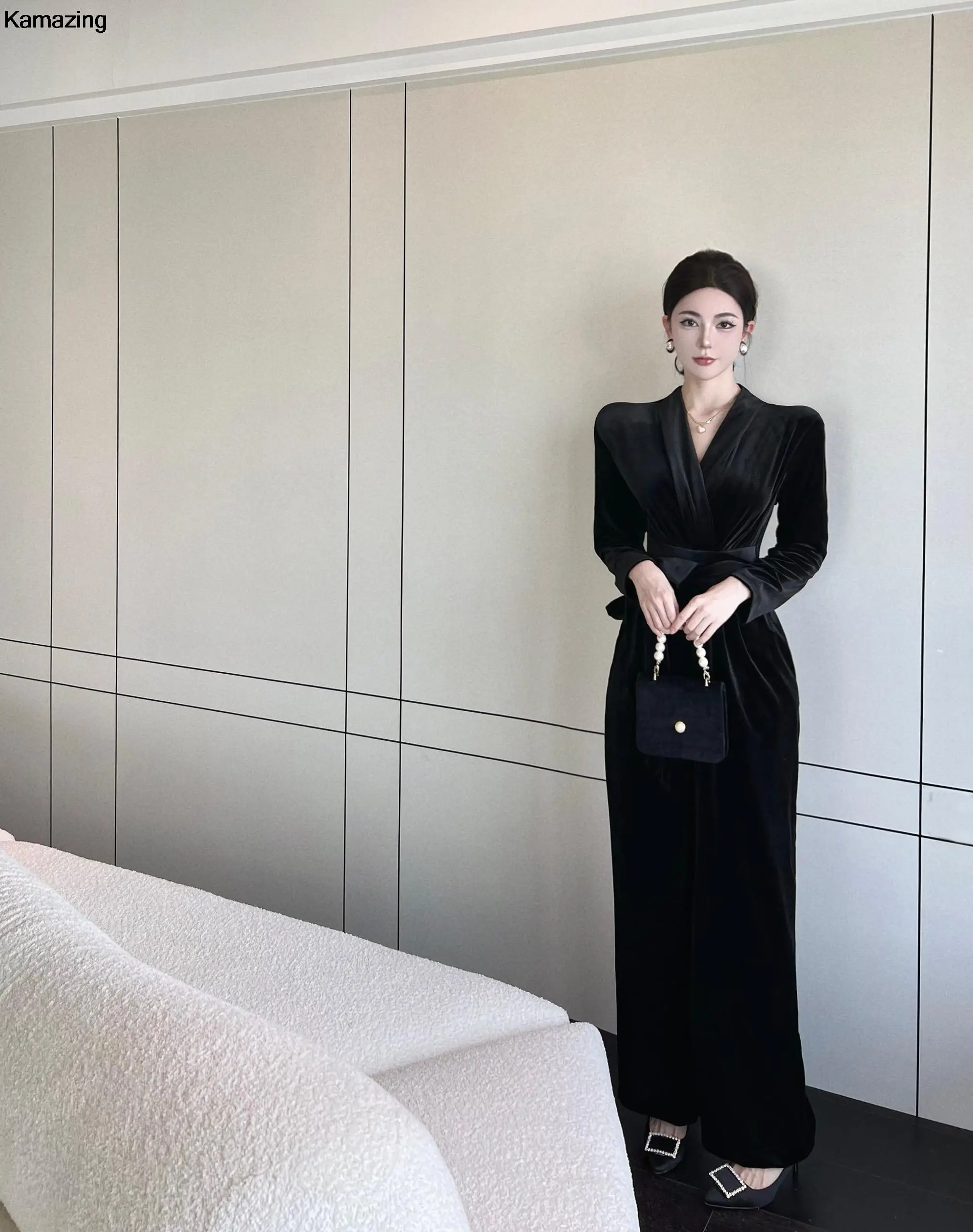 Women Spring New Elegant Long Sleeve Vintage Velvet Bodycon Jumpsuit Office Lady Casual Slim Clothing