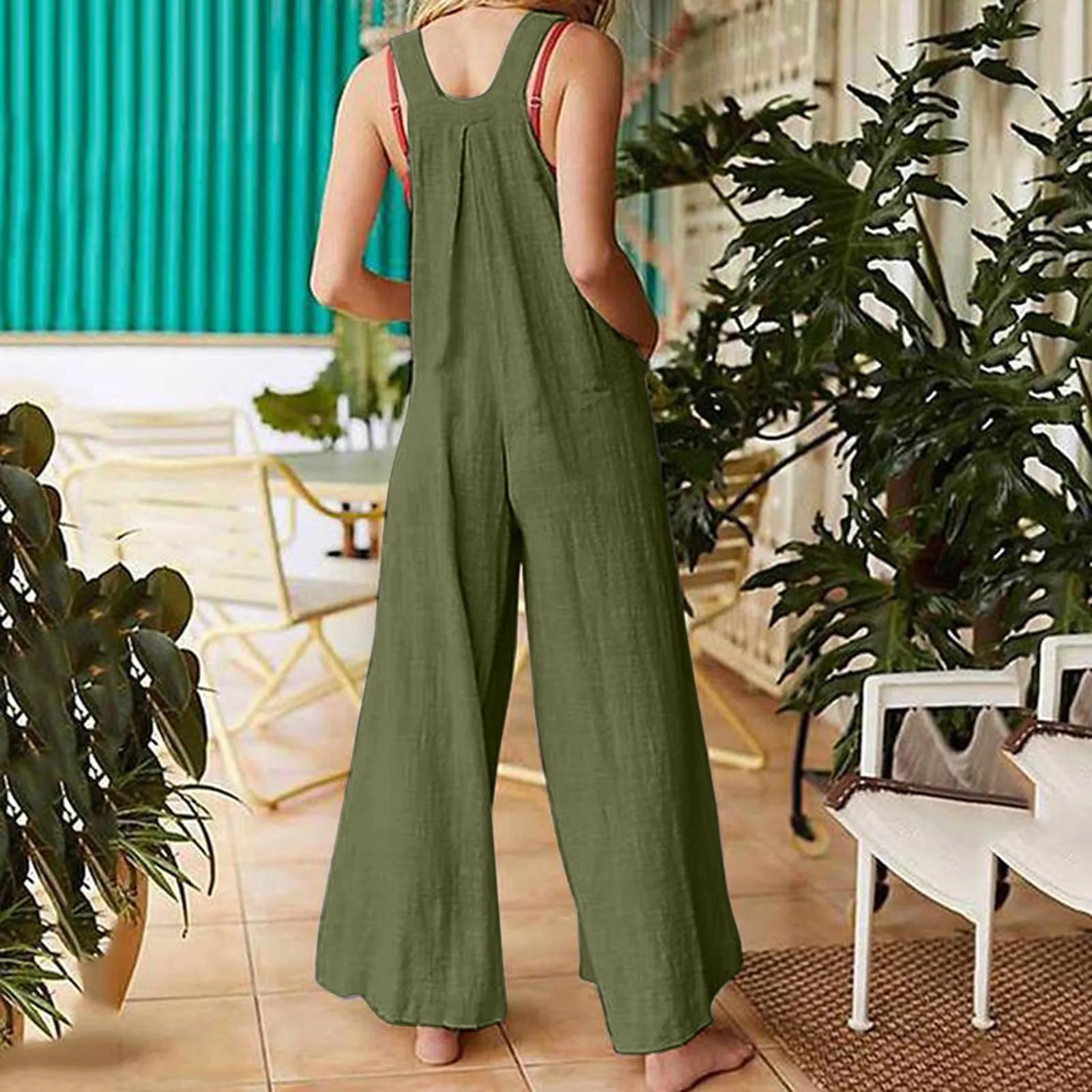 Women Summer Boho Jumpsuit Overalls Solid Ethnic Style Square Neck Sleeveless Casual Jumpsuit Pockets Loose Pants Jumpsuits 2024