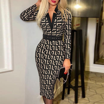Geo Print Slim Fit Dress, Elegant High Waist Slit Midi Dress, Women