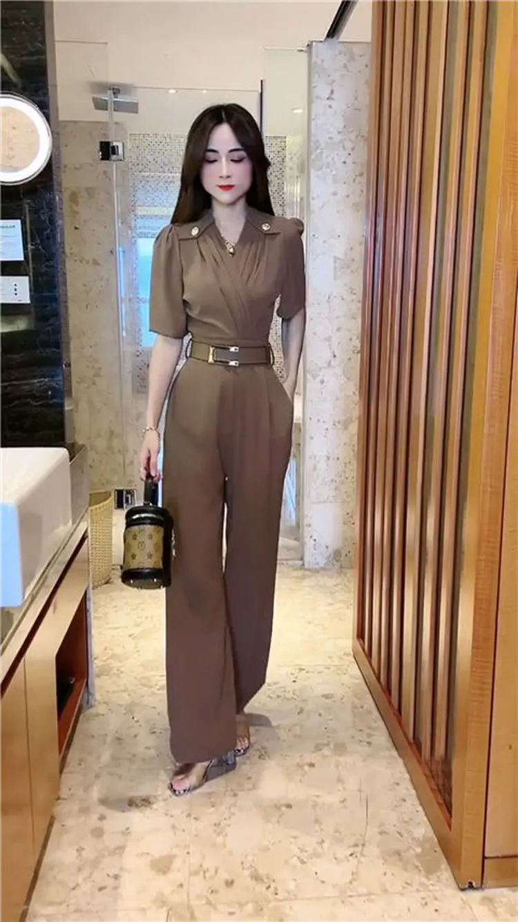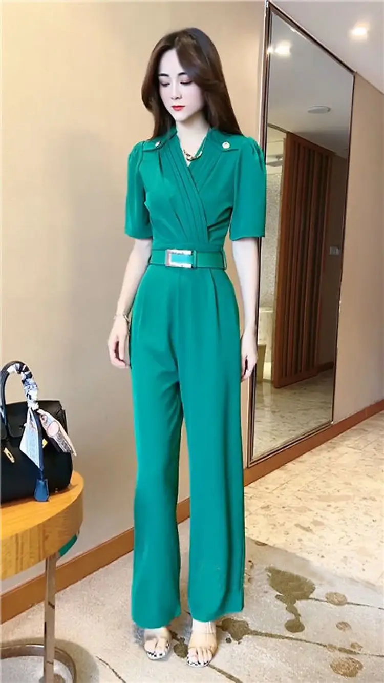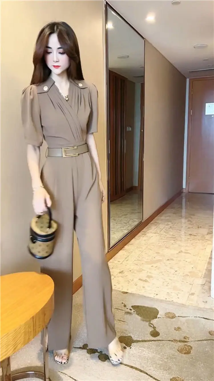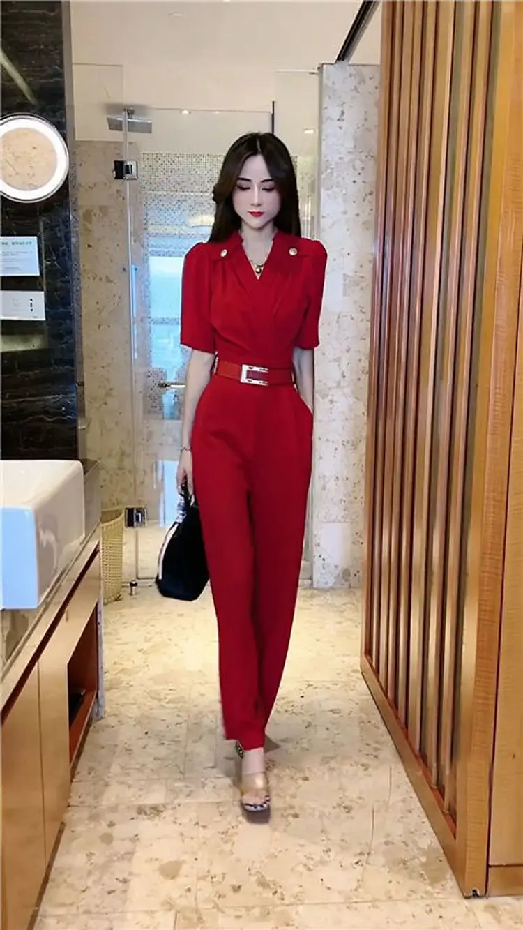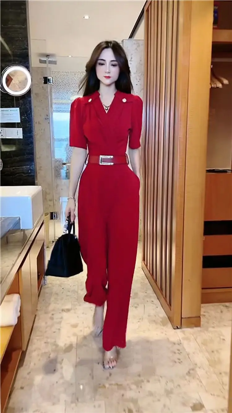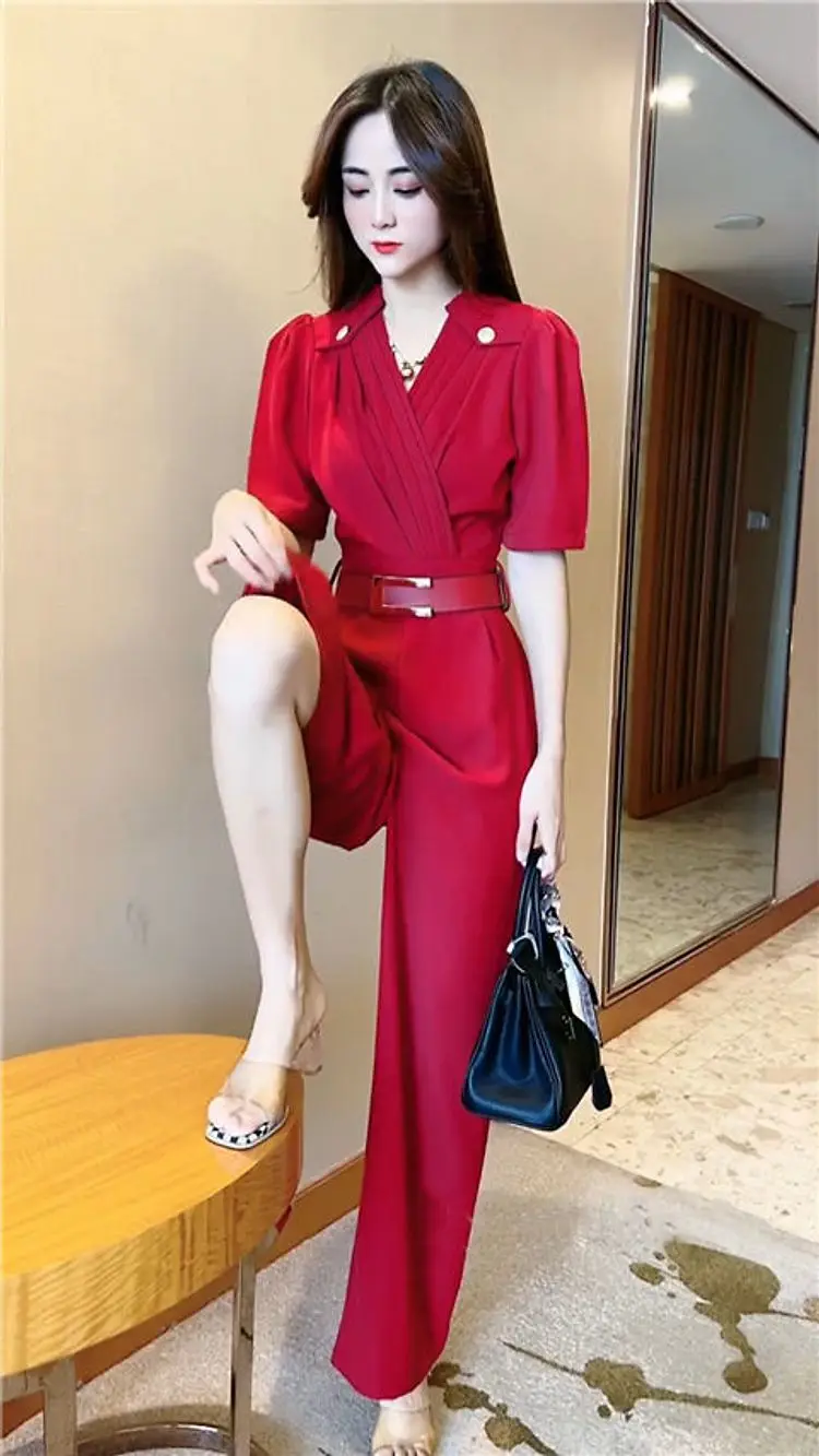 Women’s Jumpsuits 2024 Summer New Casual Slim Korean Fashion Butterfly Collar Short Sleeve High Waist Wide Leg Pant Red Overalls