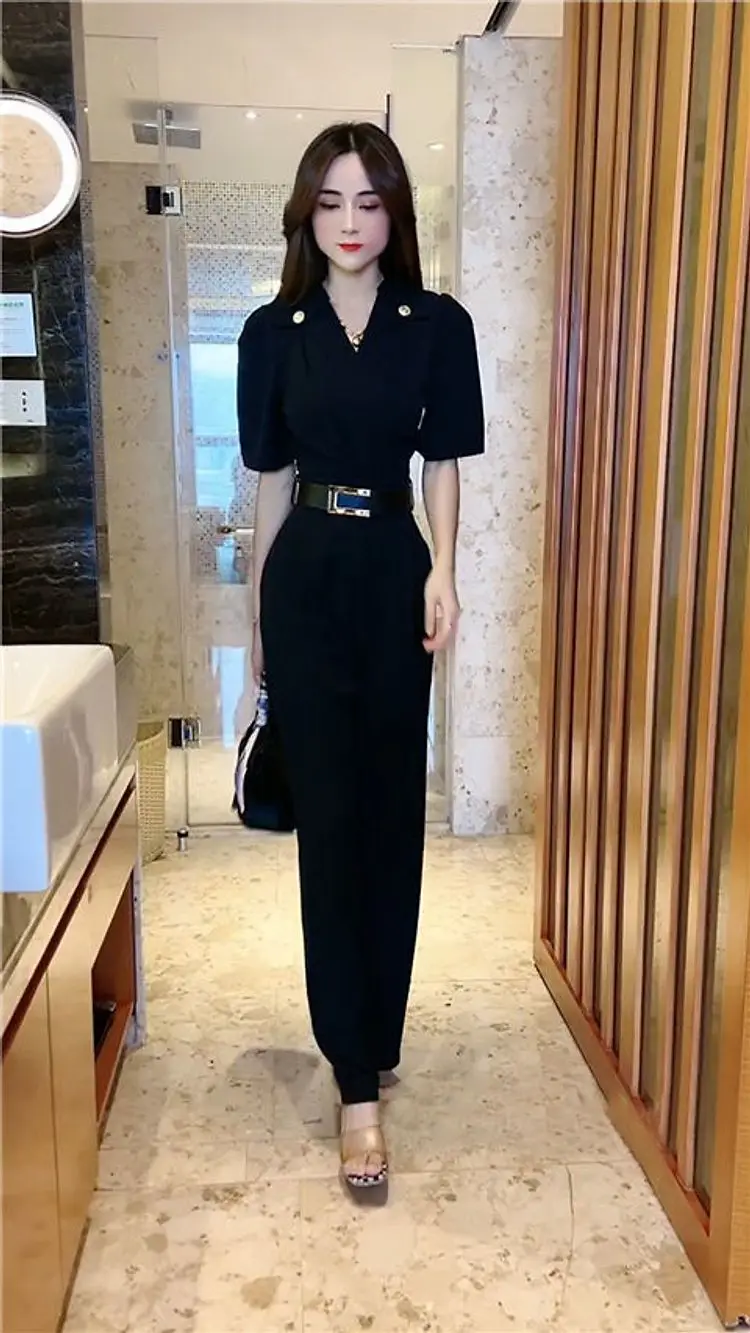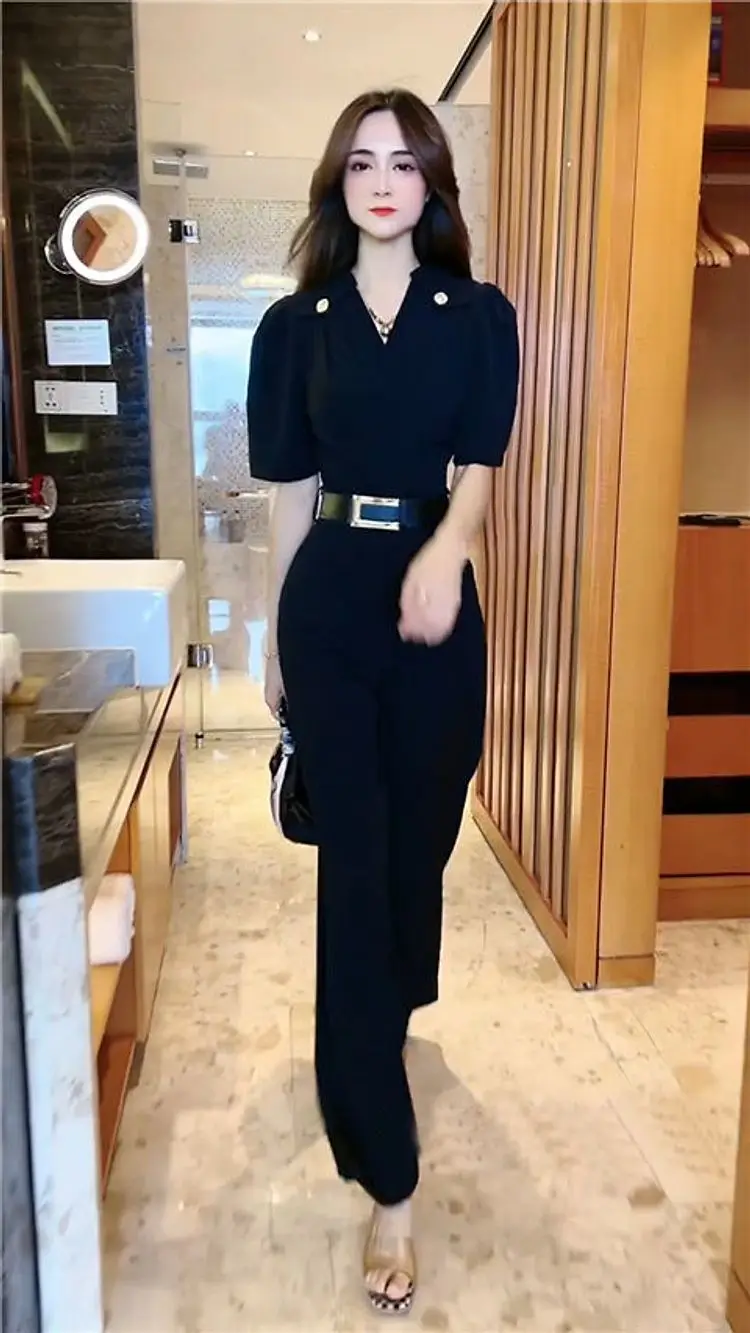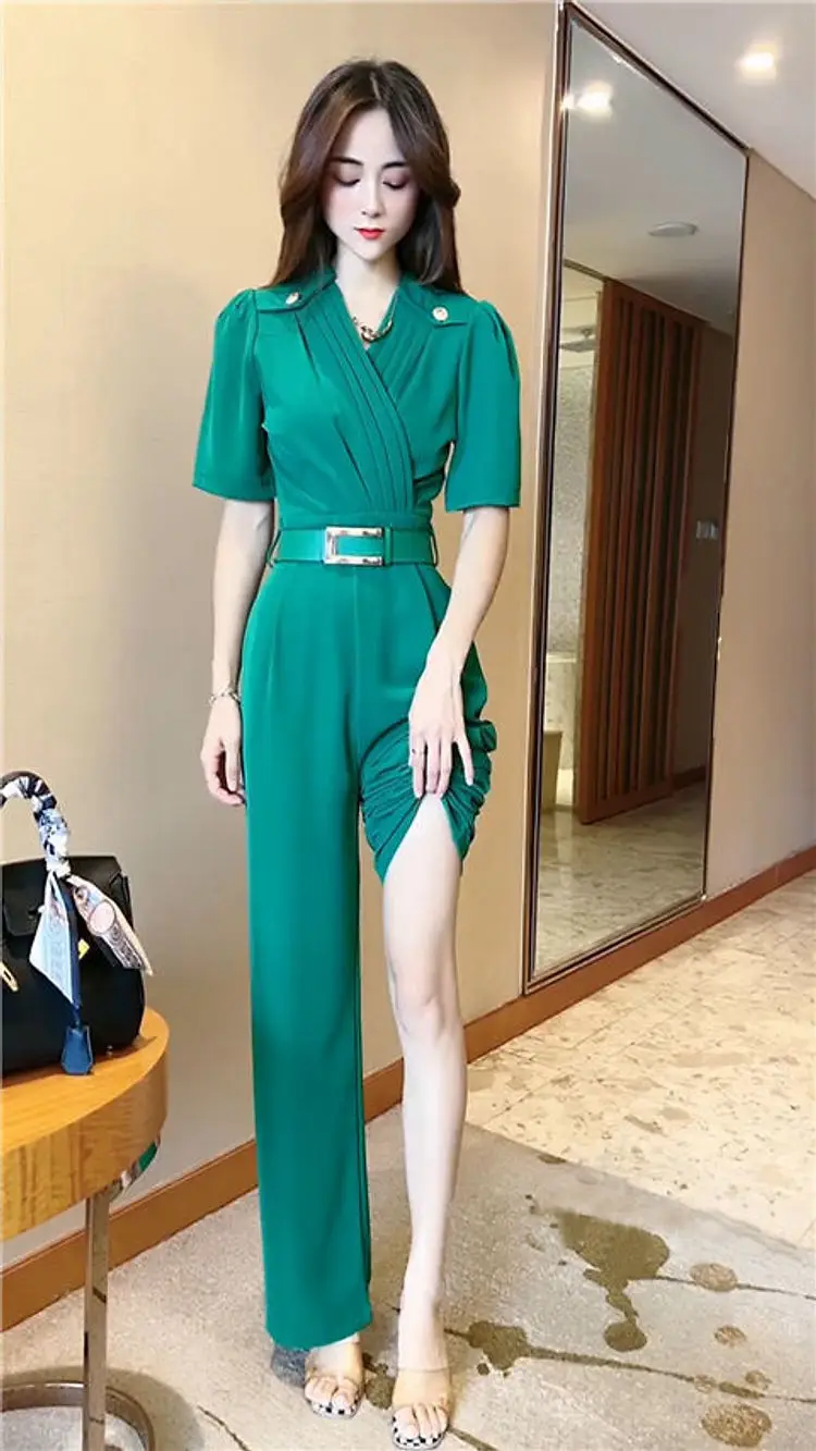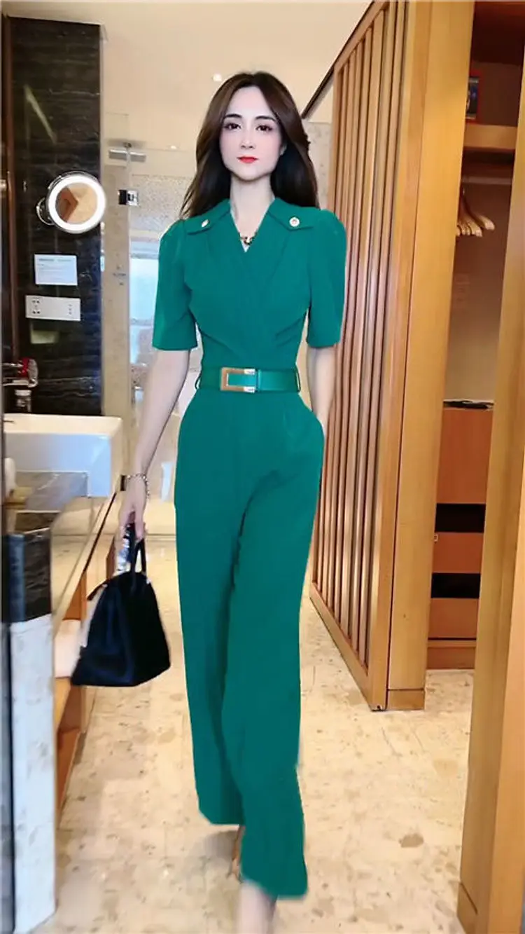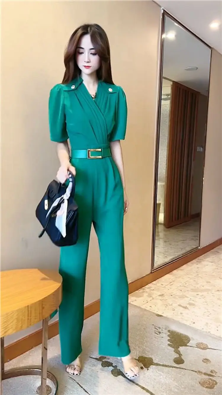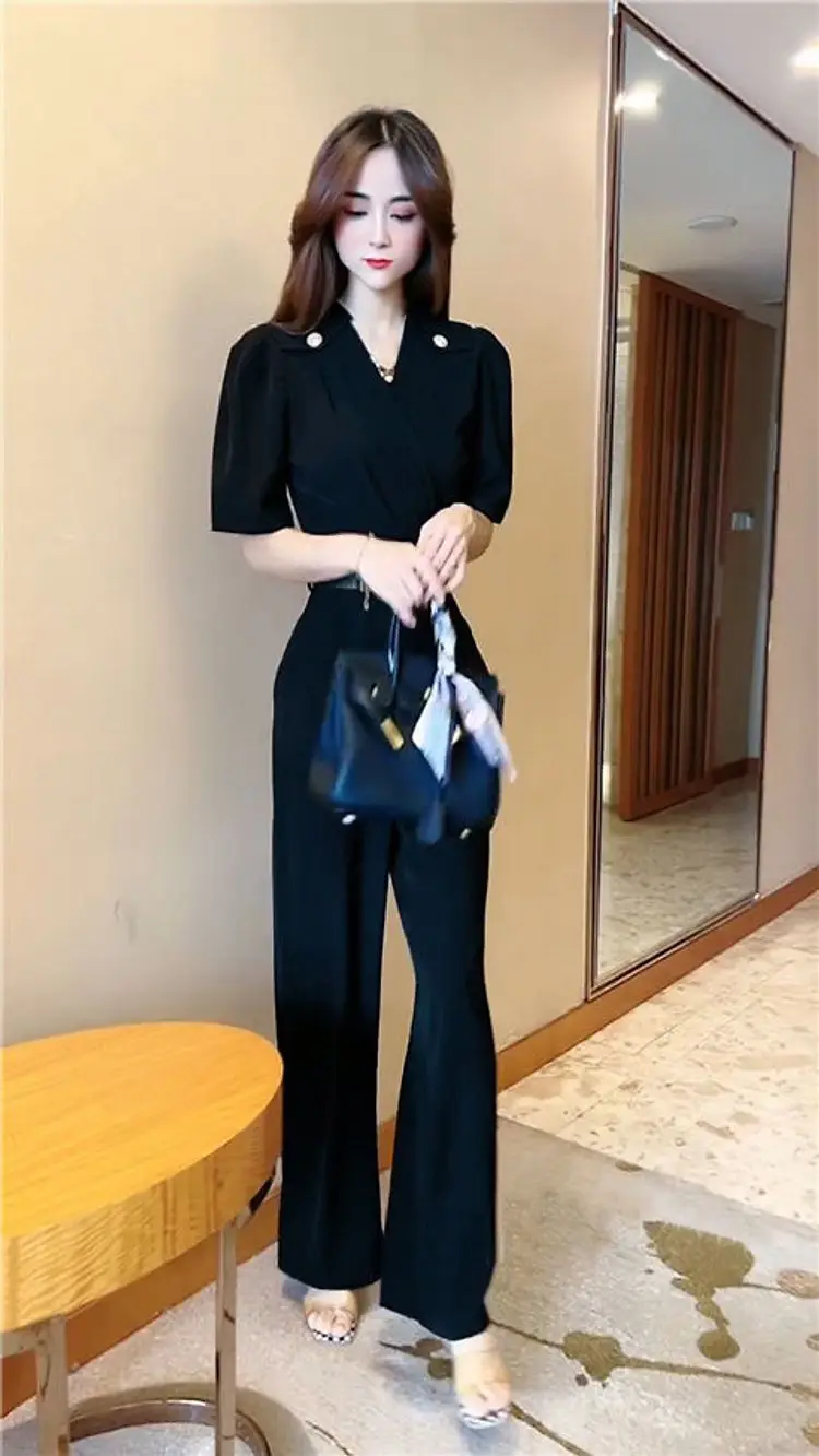 Women’s Jumpsuits 2024 Summer New Casual Slim Korean Fashion Butterfly Collar Short Sleeve High Waist Wide Leg Pant Red Overalls