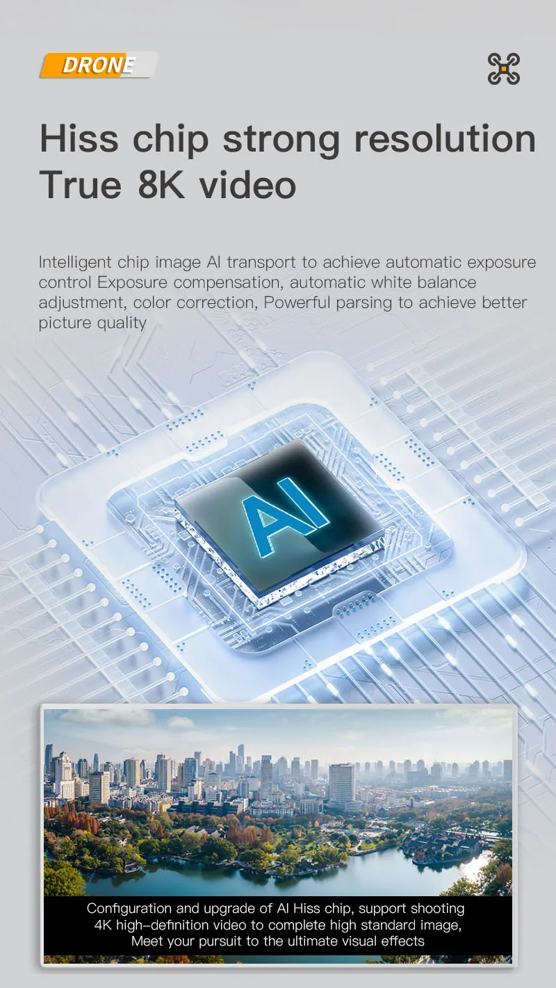 1. The front lens is placed with wide-angle 8K high-definition WIFI, and the optical flow high-definition lens at the bottom can switch the camera angle. The servo gimbal design increases stability, and EIS electronic image stabilization is added to make the picture lines clearer