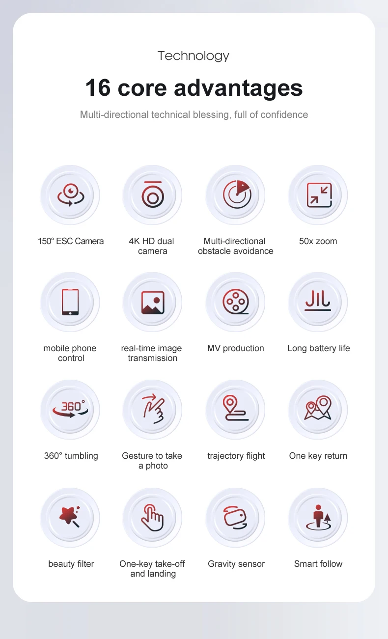 6. Gesture photography, optical flow positioning, brushless motor, super long battery life, obstacle avoidance gimbal components, stop without collision when encountering obstacles